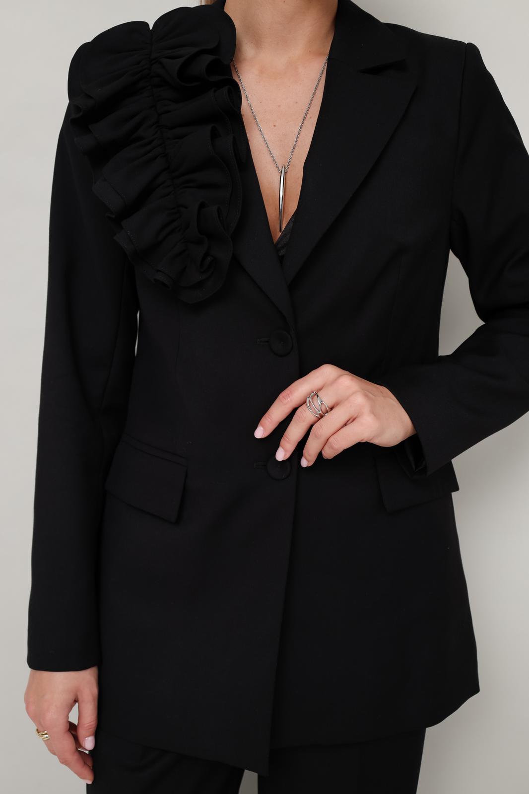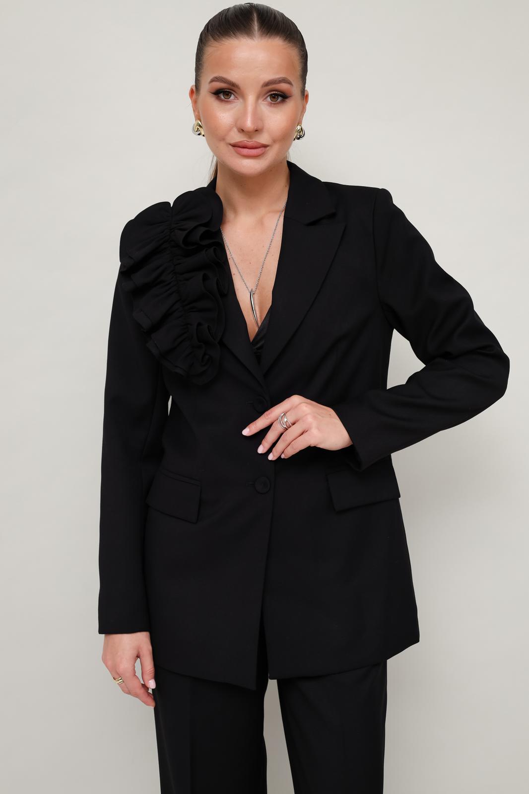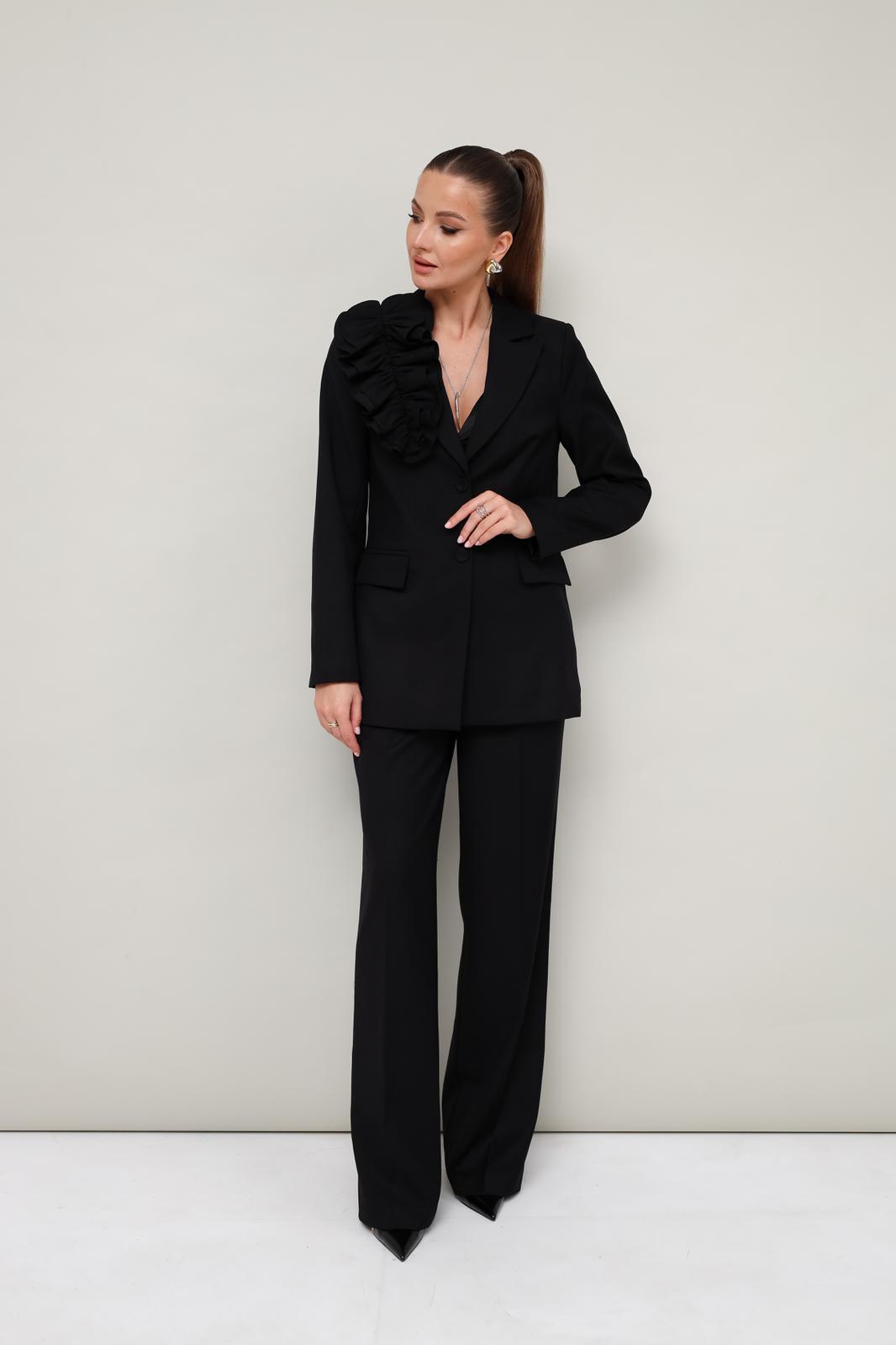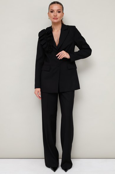 Эффектный 2-предметный комплект,состоящий из жакета и брюк, выполненный из костюмной ткани. Жакет женский