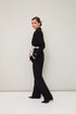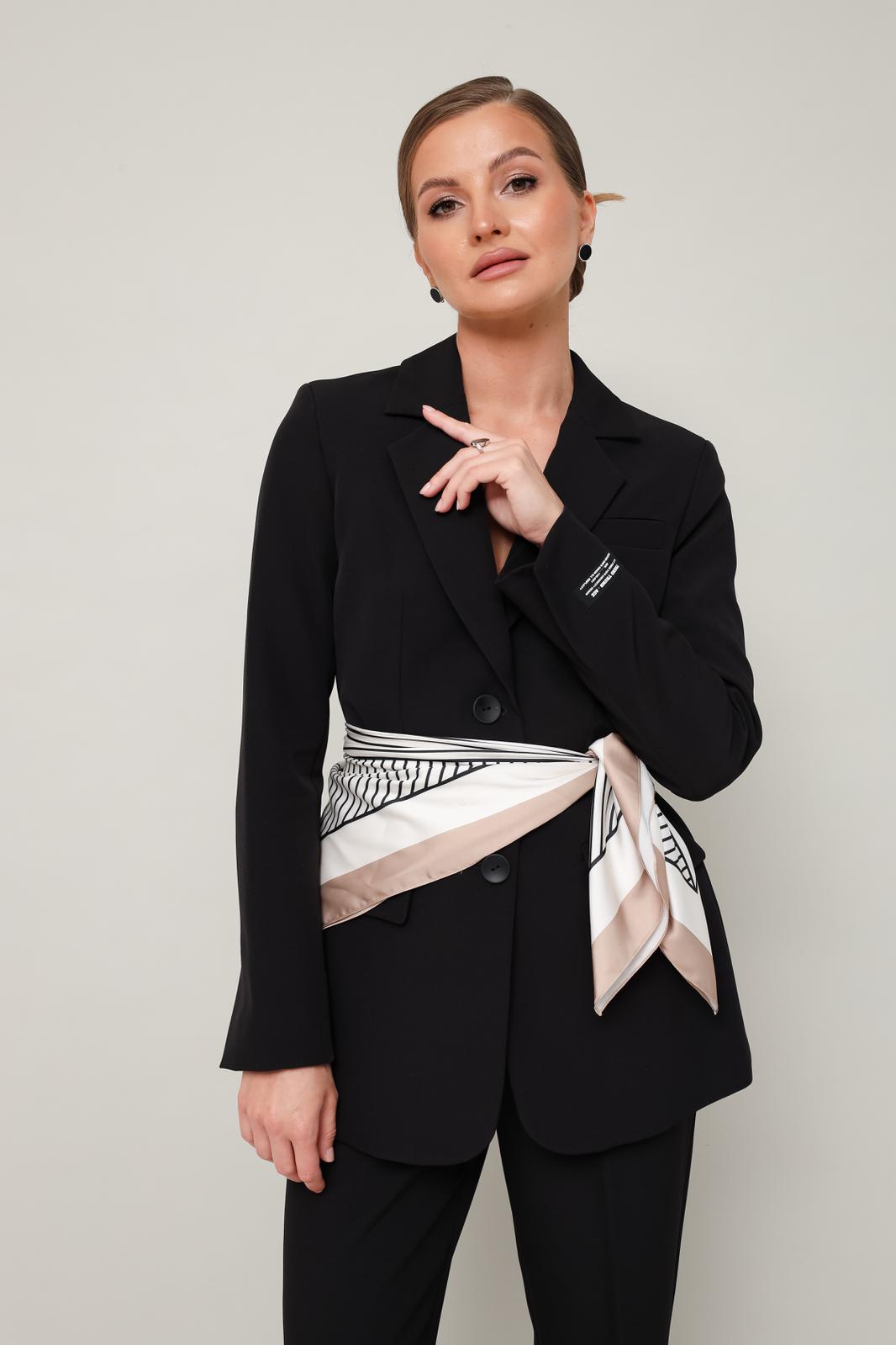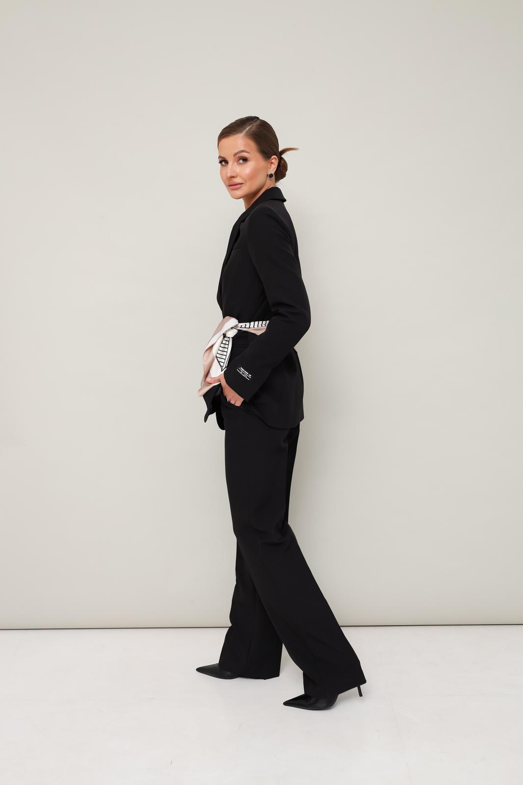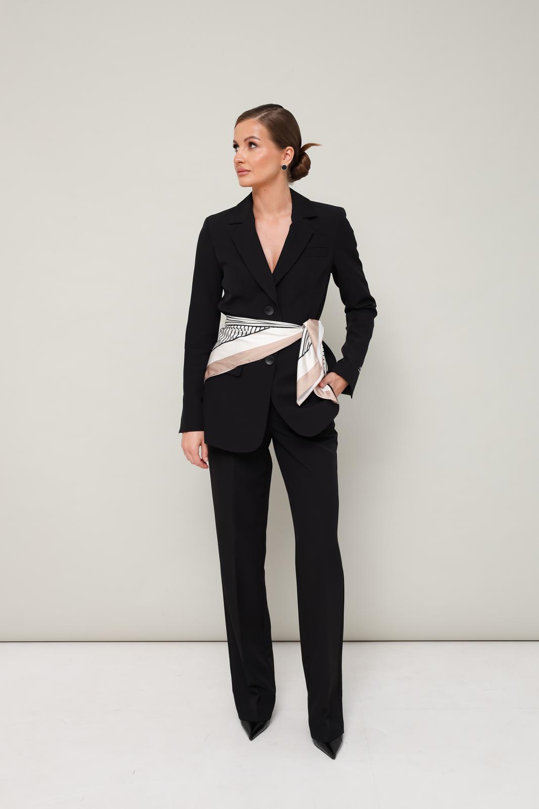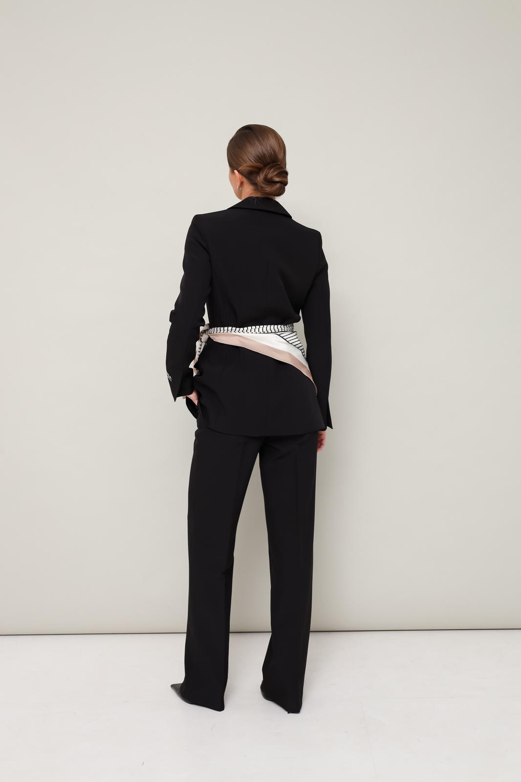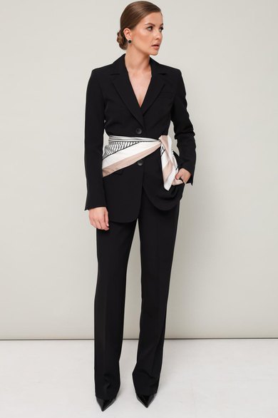 Брюки прямого силуэта с заутюженными стрелками и с боковыми наклонными карманами. Пояс притачной с застежкой на пуговицу и тесьму-молнию. Дополнением к костюму служит платок с геометричным принтом. Выполнен из струящейся ткани с благородным матовым блеском.