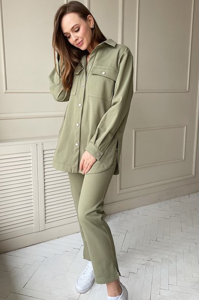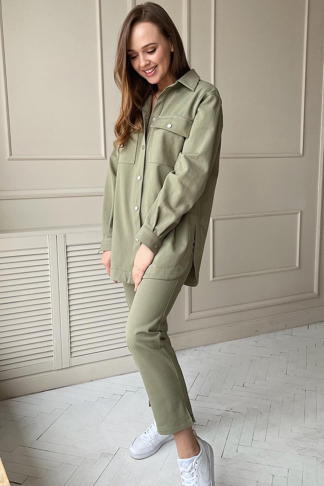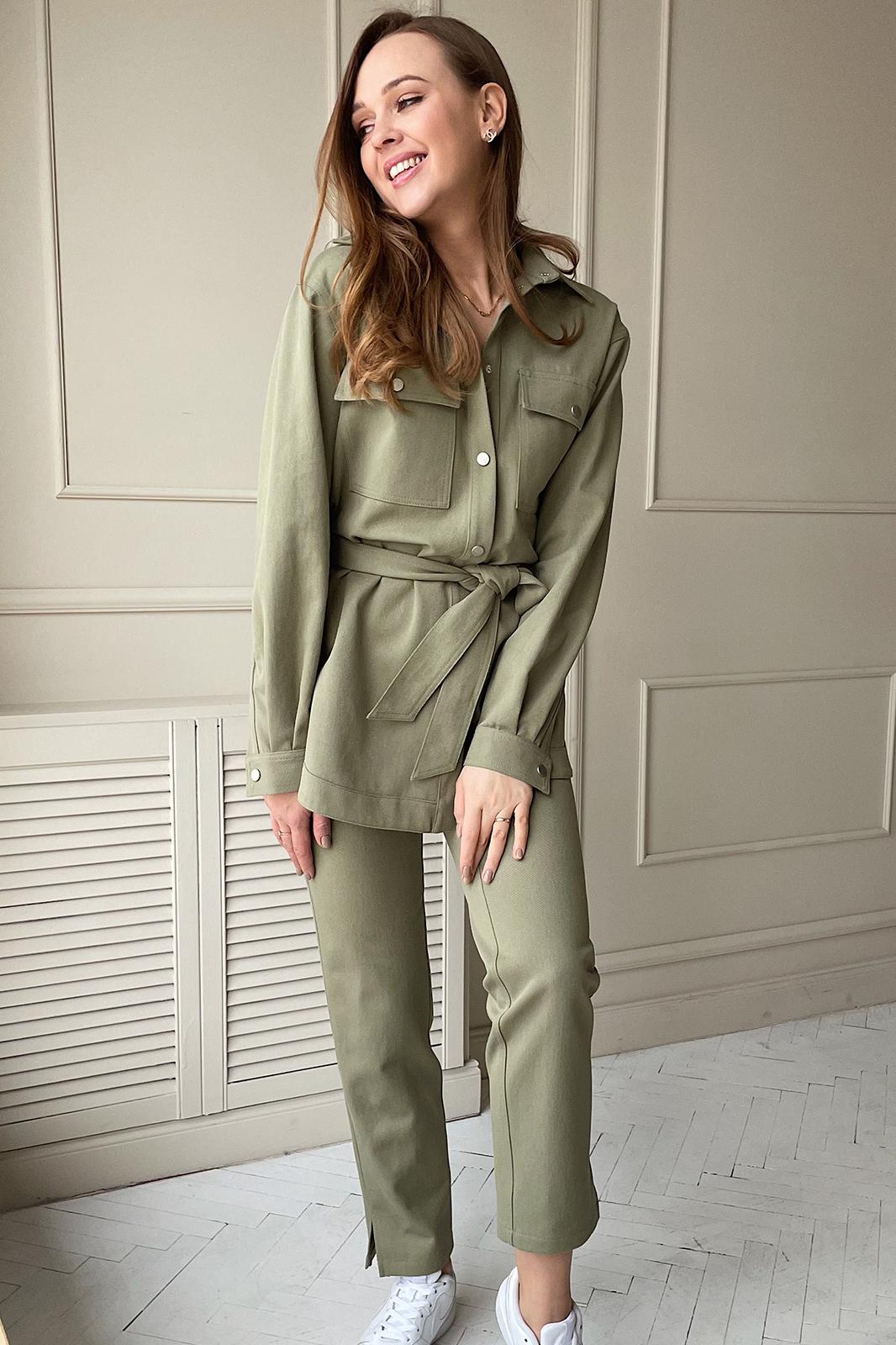 Брюки прямые, с карманами сзади и спереди, застегиваются на молнию и пуговицу. Материал костюма средней плотности.