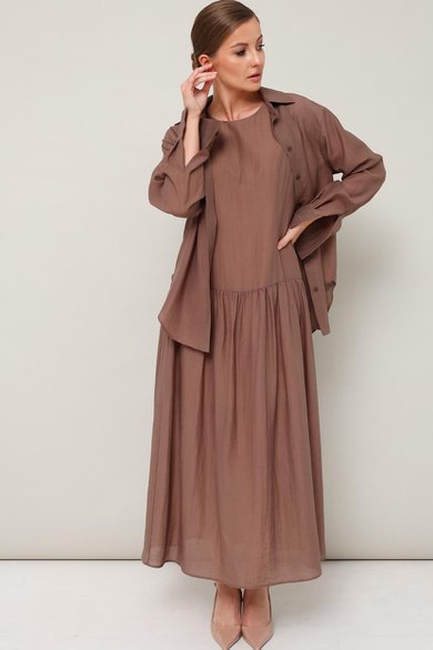 Элегантный 2-предметный комплект, состоящий из платья и блузки. Платье отрезное ниже линии талии. Округлый вырез горловины. Лиф с рельефными швами, спинка с центральной застежкой на потайную молнию. Юбка с легкой сборкой по шву притачивания. Платье на хлопковой подкладке. Блузка прямого кроя, горловина с рубашечным воротником со стойкой. Застежка центральная на петли и пуговицы. Спущенная линия втачивая рукава, манжеты с застежкой на пуговицы. В боковых швах обработаны фигурные разрезы. Спинка с отрезной кокеткой и встречной складкой.