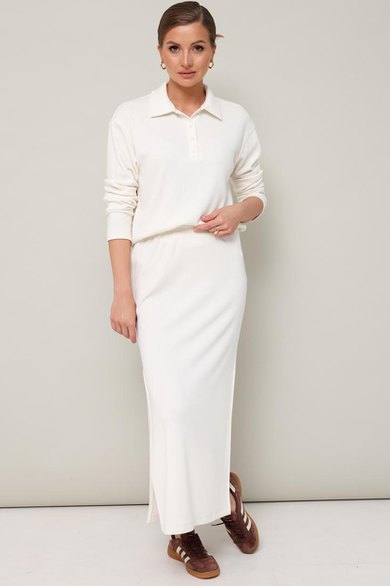 Комфортный трикотажный комплект, состоящий из поло и юбки. Поло с отложным воротником с цельнокроеной стойкой. Вырез горловины обработан притачными планками с застежкой на петли и пуговицы. Спущенная линия втачивания рукава. Юбка прямого кроя, пояс на резинке, в боковых швах обработаны высокие разрезы.