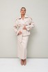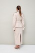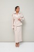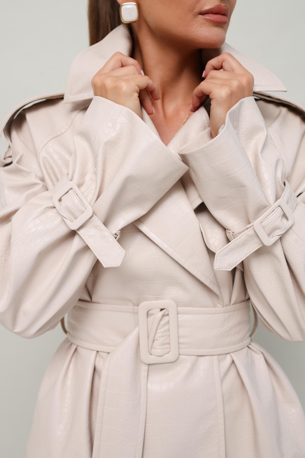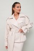 Жакет современного прямого силуэта, двубортный с застежкой на петли и пуговицы. По плечевому шву обработаны погоны. Воротник пиджачного типа с отложными лацканами. Спереди отлетная кокетка. Рукава кроя реглан, с патами по низу, с фиксацией на пряжки. Спинка со средним швом. Изделие на подкладке. В комплекте пояс из основной ткани с пряжкой.
