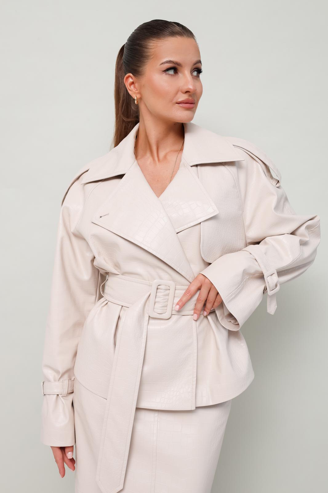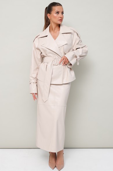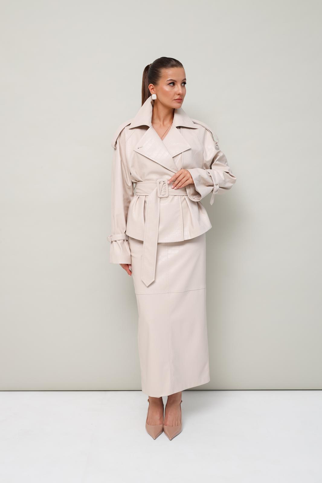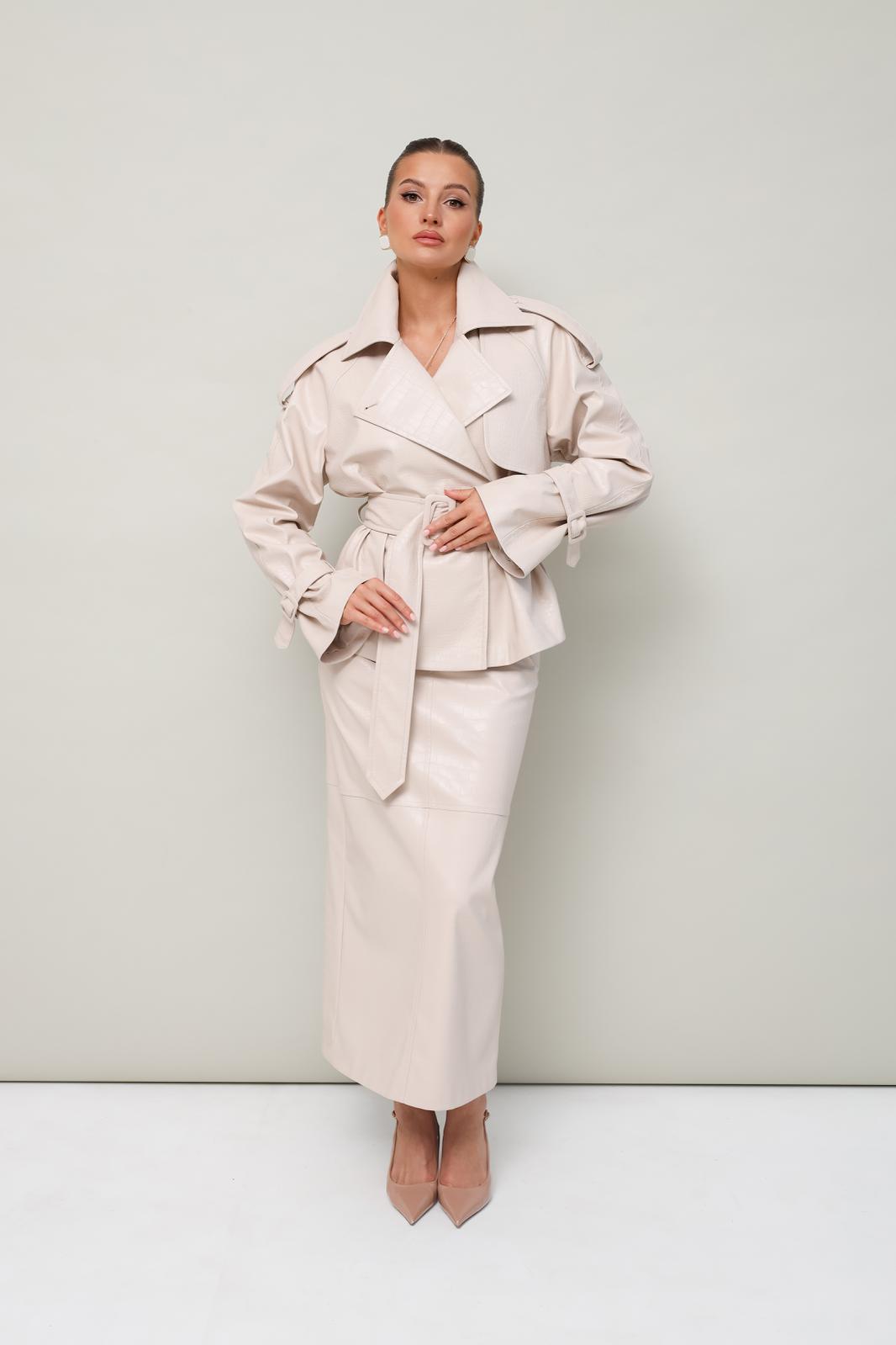 Стильный 2-предметный комплект, состоящий из жакета и юбки, выполненный из экокожи.