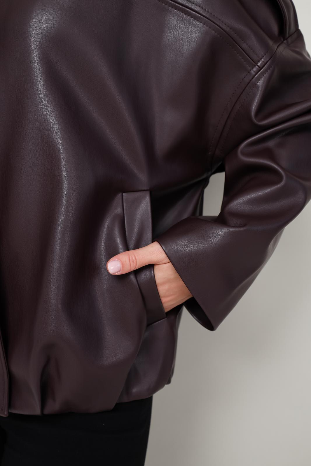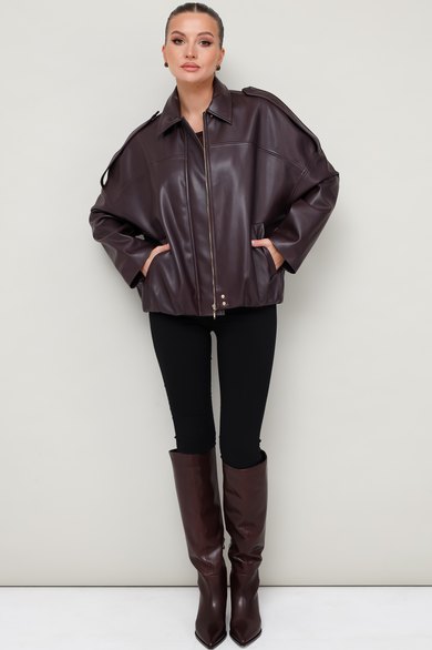 Женская куртка свободного силуэта, выполнена из экокожи высокого качества. Горловина с рубашечным воротником. Плечевые швы с патами на потайных кнопках. Центральная застёжка на металлическую молнию с защитной планкой на потайных кнопках. Спереди обработаны функциональное прорезные карманы с листочками. Двухшовные рукава со спущенной линией втачивания плеча. Спинка со средним швом. Низ собран на резинку для комфорта и регуляции размера. Куртка на подкладке.