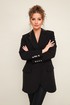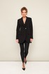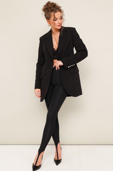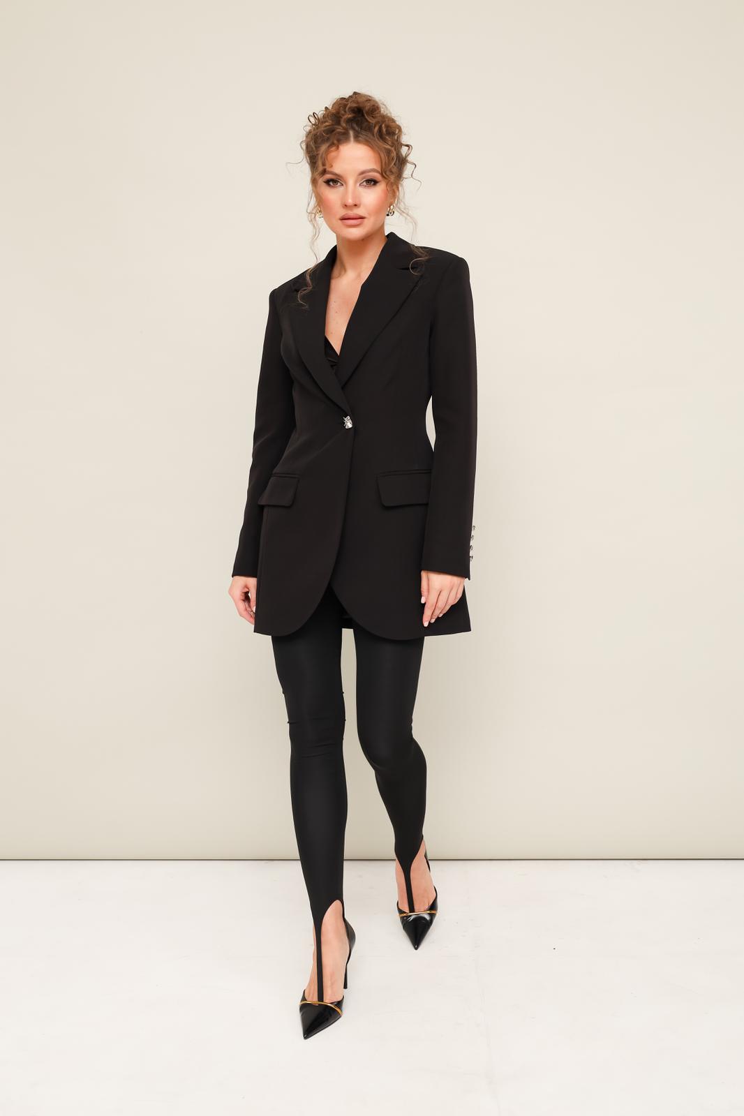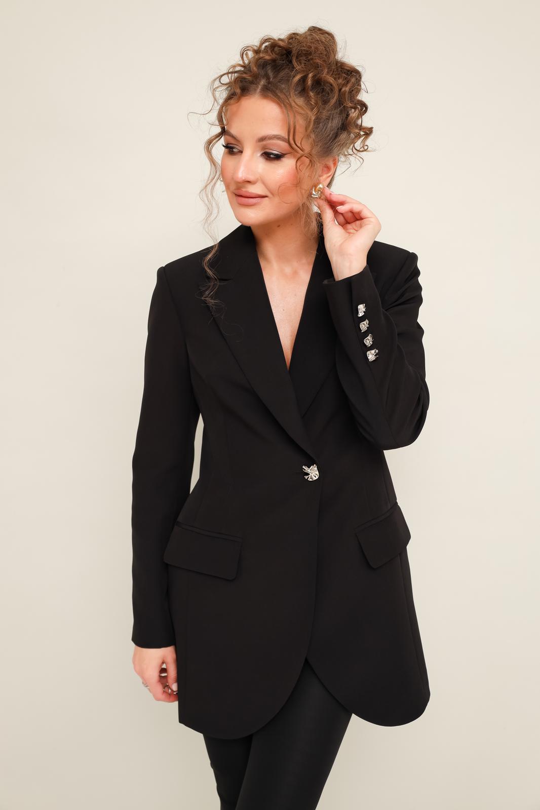 Стильный жакет полуприлегающего силуэта, выполнен из костюмной ткани. Смещенная застежка на петлю и пуговицу. Воротник пиджачного типа с отложными лацканами, край борта скругленный по низу жакета. Спереди обработаны прорезные карманы в рамку с клапанами. Рукава втачные, двухшовные со шлицами с застежкой на петли и пуговицы. Спинка с рельефами и средним швом. Жакет на подкладке.