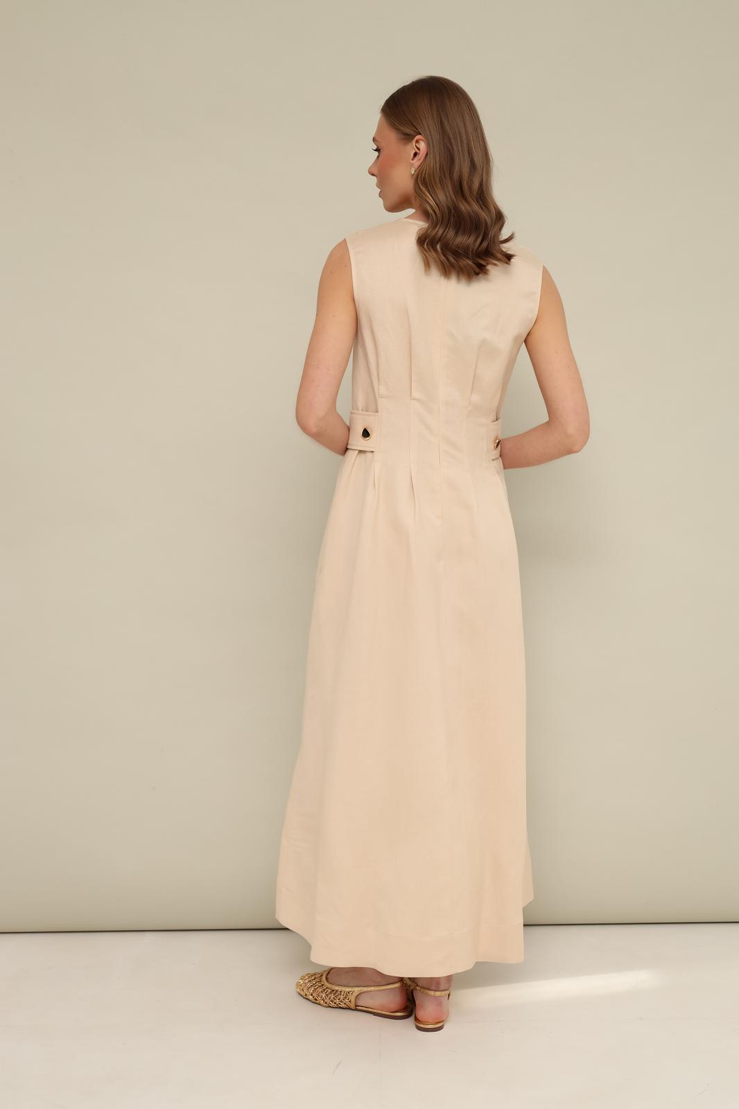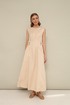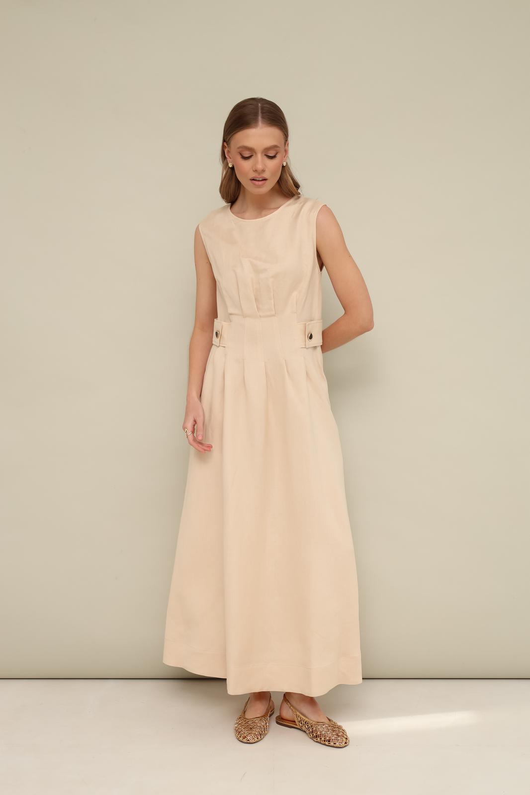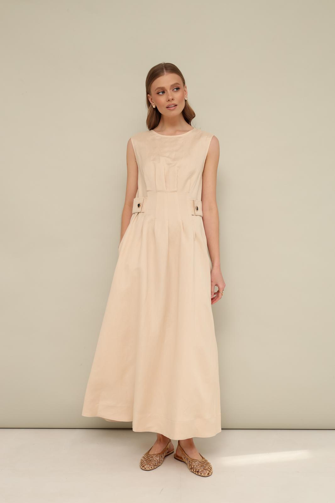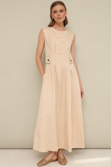 Платье полуприлегающего силуэта из ткани с содержанием льна и вискозы. Округлый вырез горловины. По линии талии в центральной части