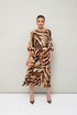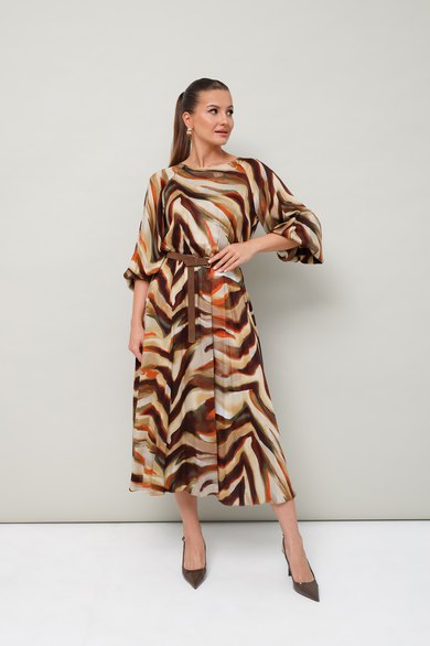 Платье отрезное по линии талии на резинке, выполнено из вискозы с абстрактным принтом. Горловина с окантованным вырезом круглой формы. Рукава-реглан, в длине 3/4 собраны на резинку по низу. По спинке обработан разрез с застежкой в среднем шве на навесную петлю и пуговицу. В комплекте прилагается съемный ремень.