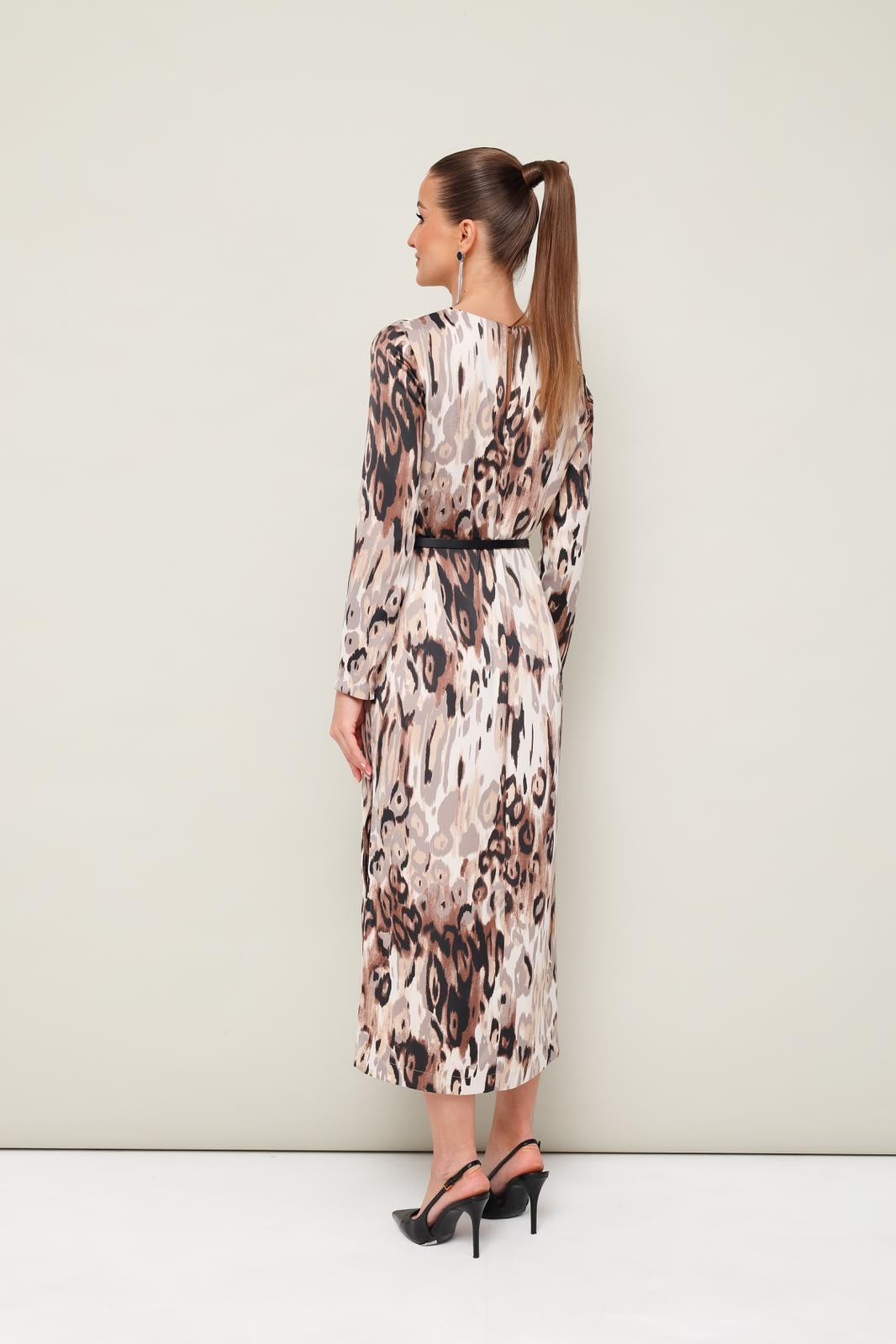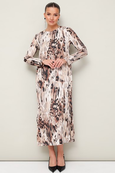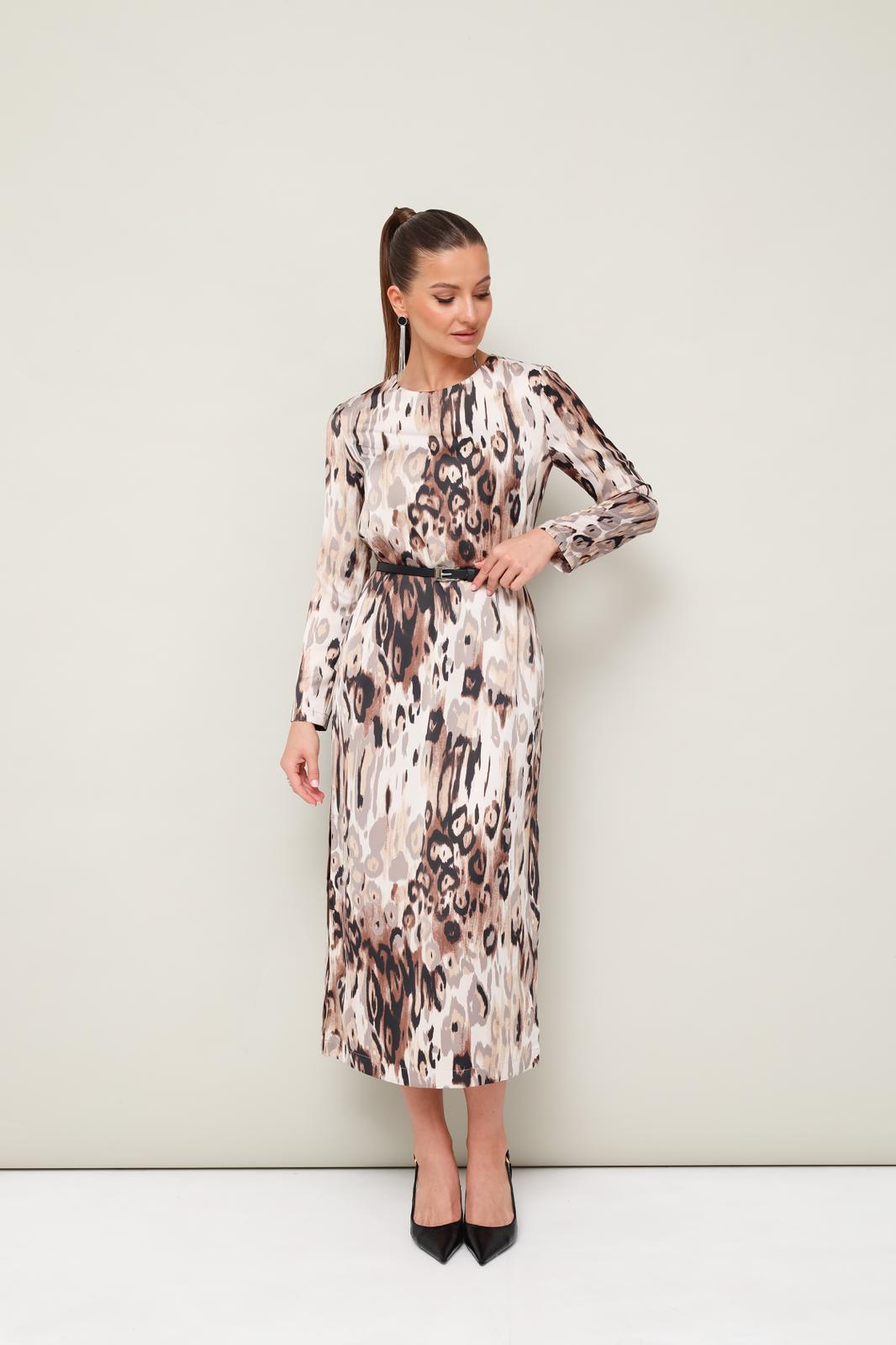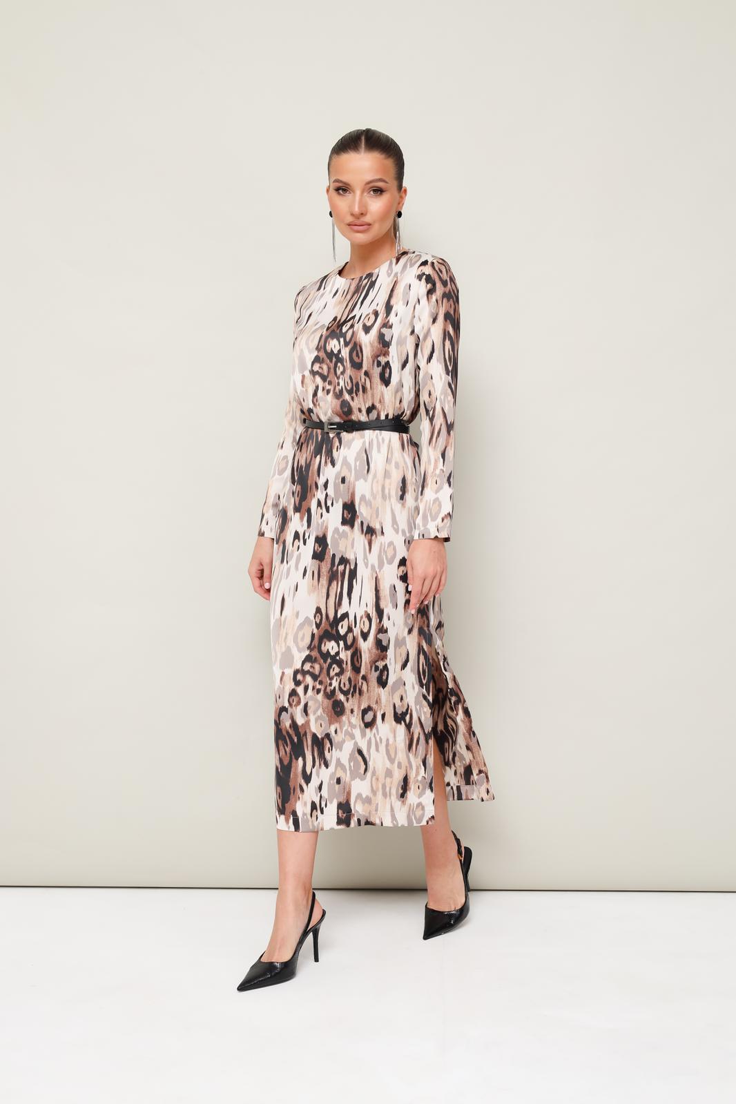 Платье прямого силуэта в длине миди, выполнено из струящейся ткани с благородным матовым блеском и актуальным абстрактным дизайном. Округлый вырез горловины. Рукава длинные втачные. Застежка по спинке в среднем шве «капля» на пуговицу и навесную петлю. По низу в боковых швах обработаны высокие разрезы.
