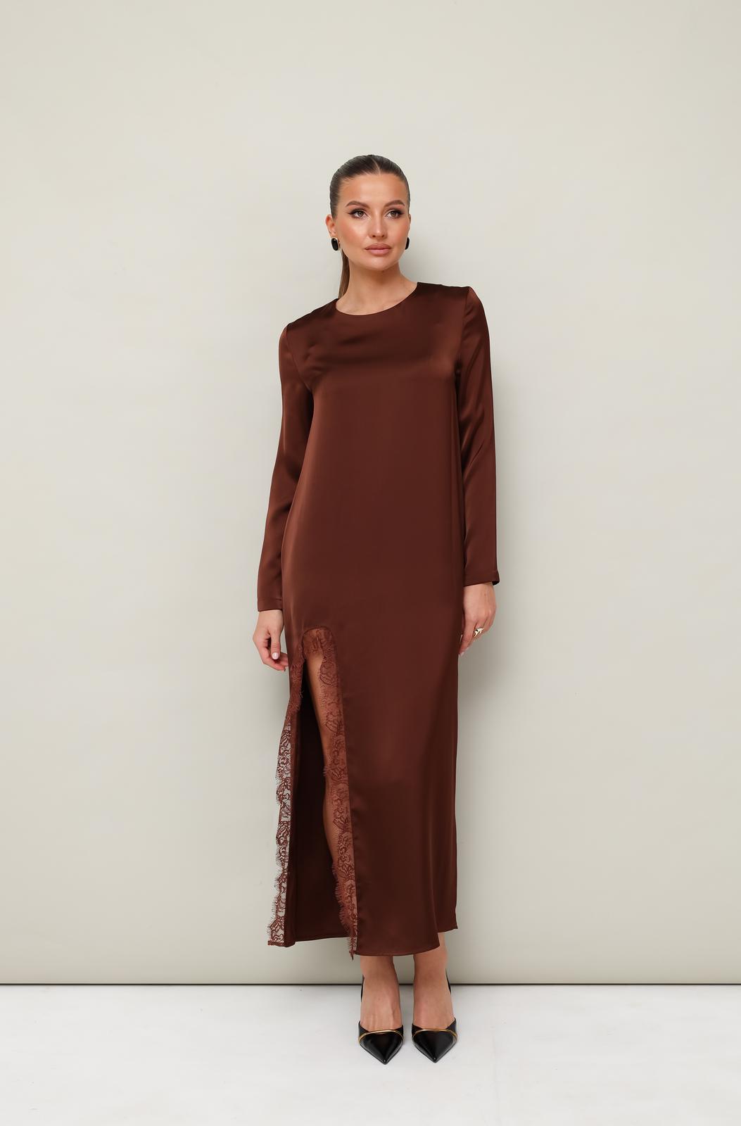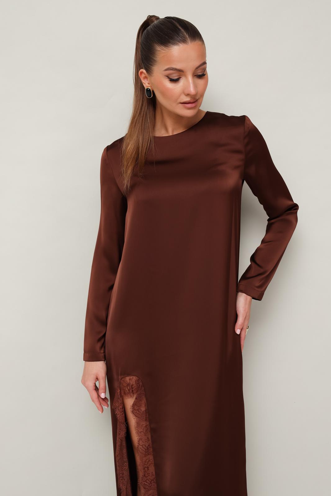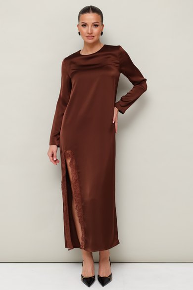 Стильное платье прямого силуэта, выполнено из струящейся ткани с благородным матовым блеском. Округлый вырез горловины. Рукава длинные втачные. Внизу обработан высокий разрез с кружевной отделкой. Застёжка по спинке в среднем шве «капля» на пуговицу и навесную петлю.