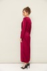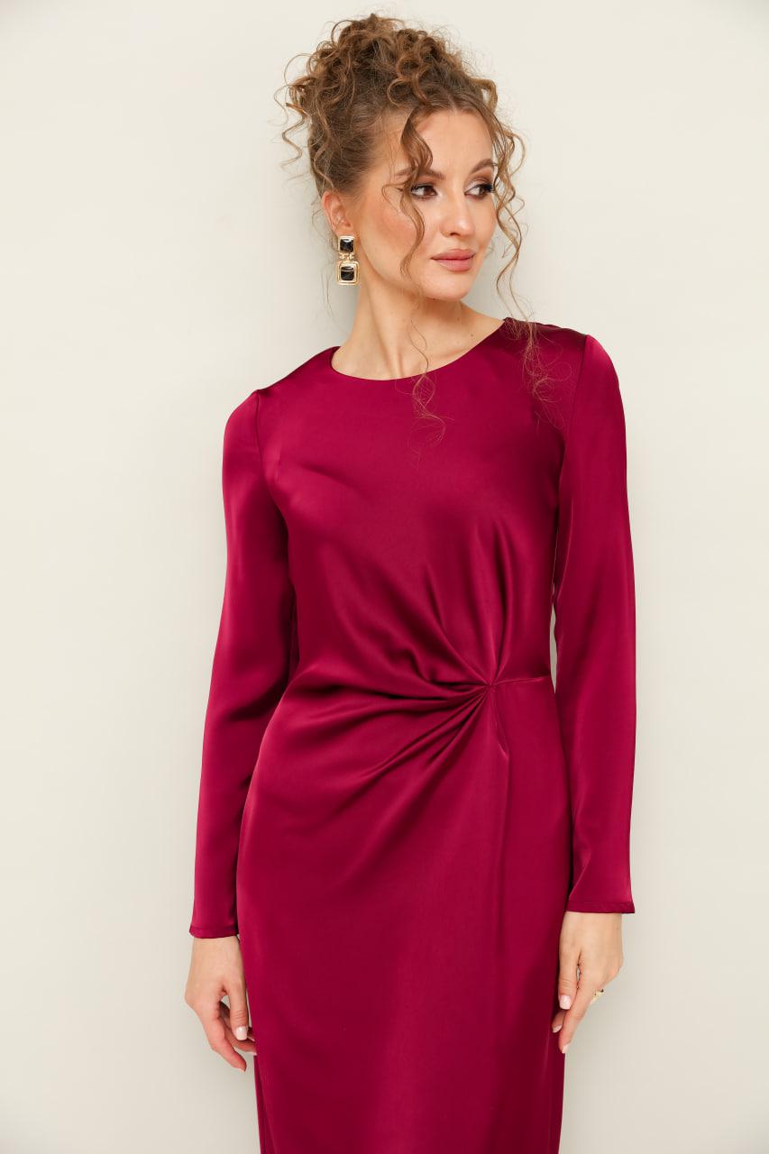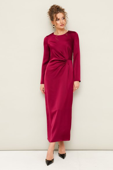 Вечернее платье полуприлегающего силуэта, выполнено из струящейся ткани с благородным матовым блеском. Горловина округлой формы. В области талии заложены складки, плавно переходящие в драпировку. Рукава втачные длинные. Застежка в среднем шве спинки на тесьму молнию. Для удобства движения сзади обработан разрез.