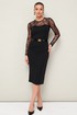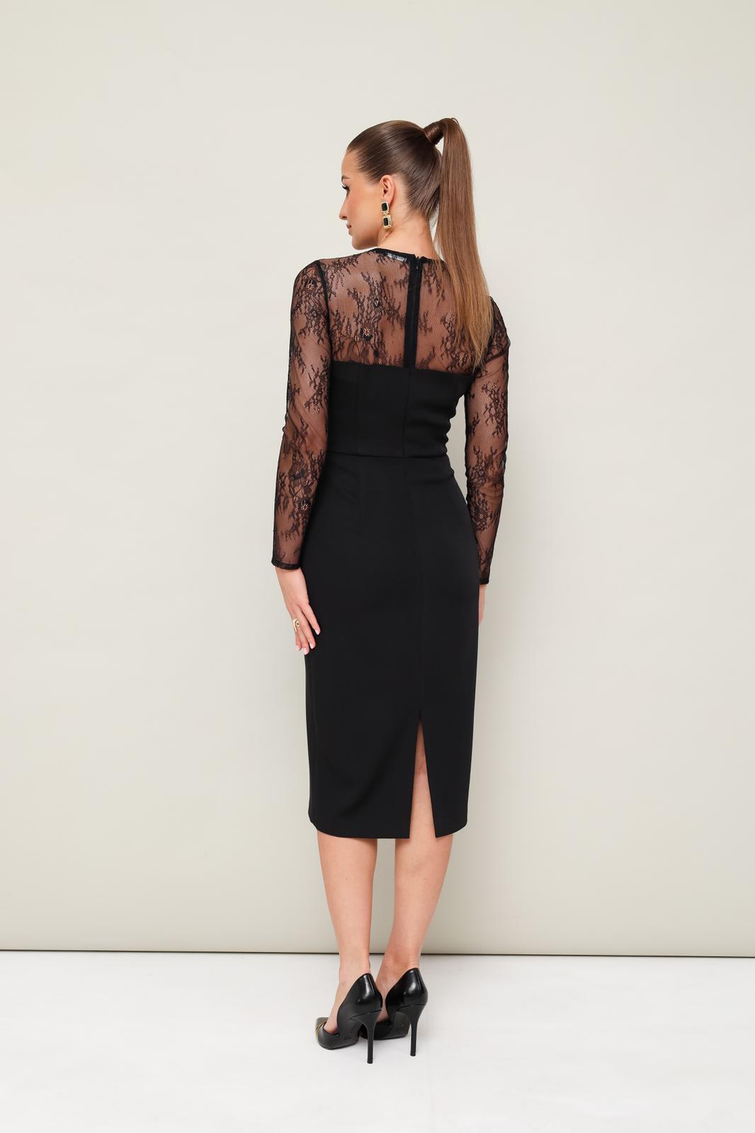 Платье-футляр прилегающего силуэта, отрезное по линии талии, в длине миди. Горловина округлая, вырез лифа фигурной формы с рельефами. Лиф и юбка выполнены из плательно-костюмной ткани. Рукава, кокетка лифа и спинки выполнены из кружевного полотна. Рукава длинные втачные. Акцентом платья является съемный воротничок, который застегивается на потайные пуговицы и навесные петли. Застежка на потайную тесьму-молнию в среднем шве спинки. Для удобства движения в нижней части юбки обработан разрез.