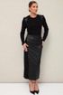 Стильное платье прилегающего силуэта, отрезное по линии талии, выполнено из экокожи и трикотажного полотна. Горловина округлой формы. Длинные втачные рукава. Юбка спереди с подрезом на металлическую молнию, с возможностью регулировать высоту разреза. Застёжка по спинке в среднем шве на потайную молнию.