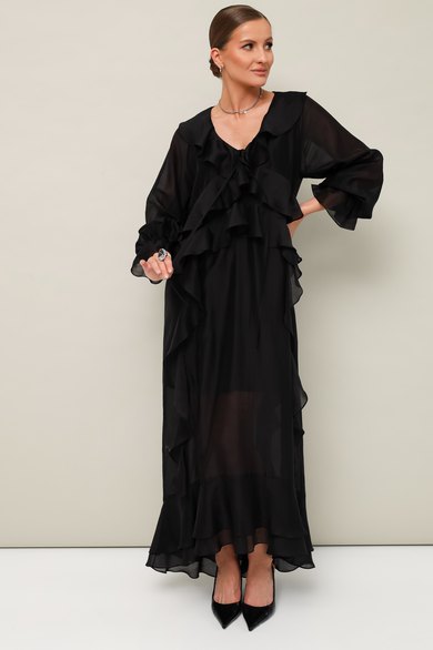 Летящее платье А-силуэта, выполнено из полупрозрачной вискозной ткани. Горловина с V-образным вырезом-каплей с завязками. Лиф переда с подрезами с воланами, переходящими на спинку. Юбка с вертикальными подрезами с воланами. Рукава-реглан с манжетами на резинке. Низ фигурной формы. Платье обработано подкладкой.