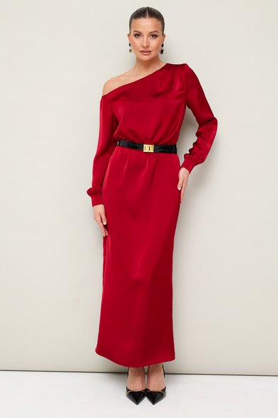 Вечернее платье полуприлегающего силуэта, выполнено из струящейся ткани с благородным матовым блеском. Ассиметричный вырез горловины с открытым плечом. Правый плечевой шов декорирован складками. Платье отрезное по линии талии на резинке. Рукава длиннные с манжетами с застежкой на петли и пуговицы. По спинке в среднем шве юбки обработан разрез.