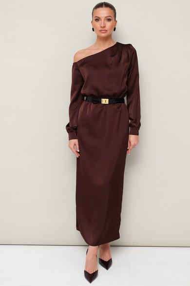 Вечернее платье полуприлегающего силуэта, выполнено из струящейся ткани с благородным матовым блеском. Ассиметричный вырез горловины с открытым плечом. Правый плечевой шов декорирован складками. Платье отрезное по линии талии на резинке. Рукава длиннные с манжетами с застежкой на петли и пуговицы. По спинке в среднем шве юбки обработан разрез.