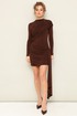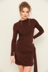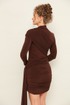 Платье прилегающего силуэта в длине мини, выполнено из эластичной ткани - масло. Горловина с цельнокроеной стойкой. Рукава длинные втачные. Перед и спинка декорированы диагональными деталями со сборкой в области лифа и бедер.