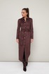 Отложной воротник с цельнокроеной стойкой. Центральная застёжка на кнопки. Перед с рельефными швами. Втачные двухшовные рукава с манжетами с застежкой на кнопки. Спинка со средним швом. В комплекте прилагается пояс из основной ткани с пряжкой.
