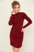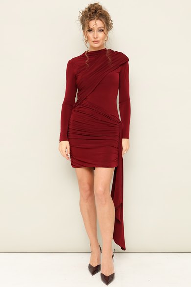 Платье прилегающего силуэта в длине мини, выполнено из эластичной ткани - масло. Горловина с цельнокроеной стойкой. Рукава длинные втачные. Перед и спинка декорированы диагональными деталями со сборкой в области лифа и бедер.