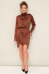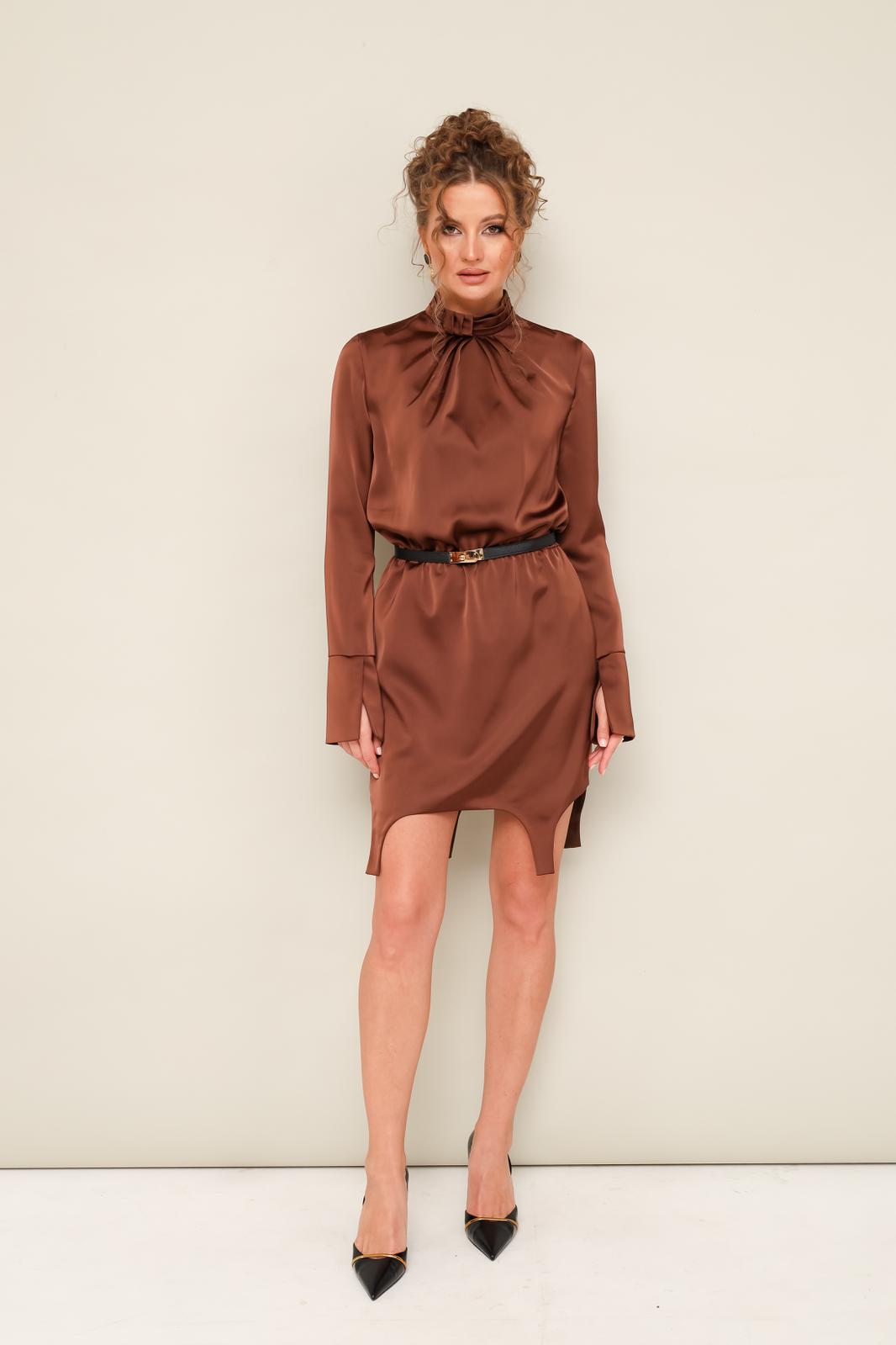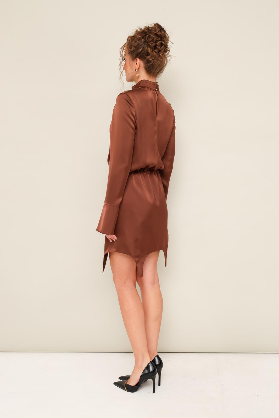 Стильное платье полуприлегающего силуэта, выполнено из струящейся ткани с матовым блеском. Платье отрезное по линии талии на резинке. Горловина с отрезной стойкой и лиф переда декорированы складками. Втачные длинные рукава с манжетами. В среднем шве спинки обработана застёжка на стойке на пуговицы и навесные петли. Низ платья фигурной формы.