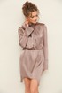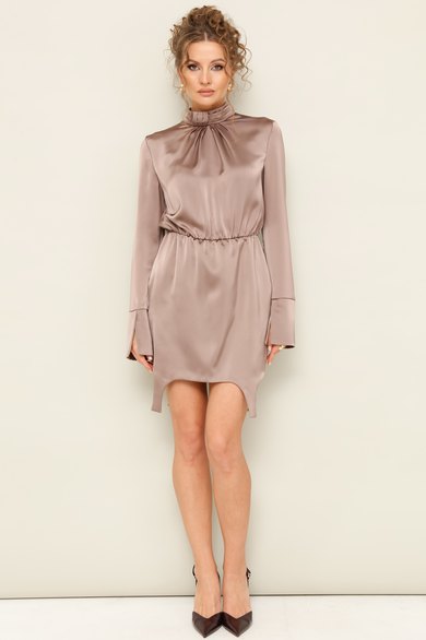 Стильное платье полуприлегающего силуэта, выполнено из струящейся ткани с матовым блеском. Платье отрезное по линии талии на резинке. Горловина с отрезной стойкой и лиф переда декорированы складками. Втачные длинные рукава с манжетами. В среднем шве спинки обработана застёжка на стойке на пуговицы и навесные петли. Низ платья фигурной формы.
