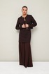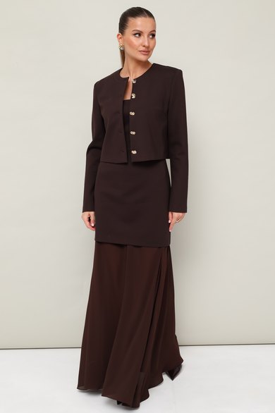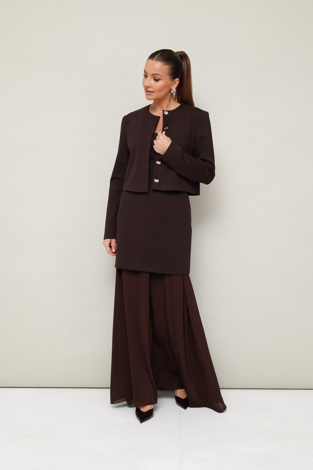 Жакет полуприлегающего силуэта, с центральной застёжкой на петли и акцентные пуговицы. Длинные втачные рукава. Спинка со средним швом.