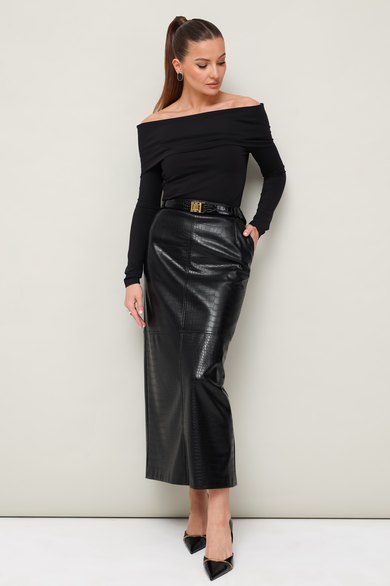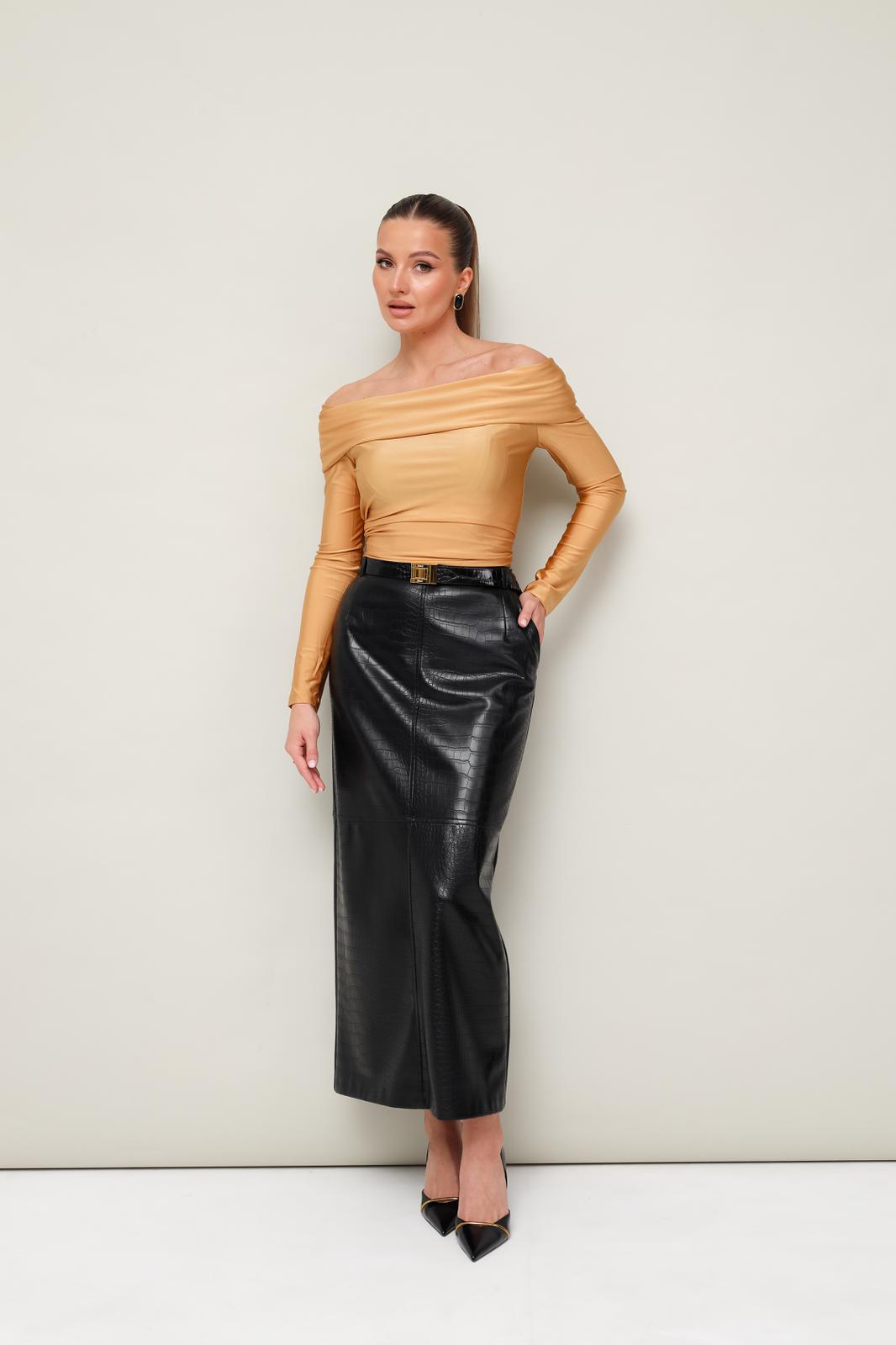 Юбка на подкладке в длине миди с боковыми наклонными карманами. Притачной пояс с застежкой в среднем шве на потайную молнию. Для удобства движения сзади обработана шлица. *Ремень представлен как вариант стилизации образа.