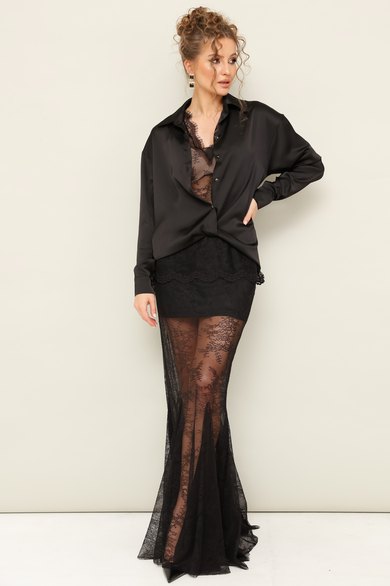 Силуэтная юбка годе с расклешением от линии колен с втачными клиньями. Юбка выполнена из изысканного французского кружева. Пояс обработан резинкой для комфорта и регуляции размера.