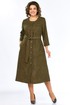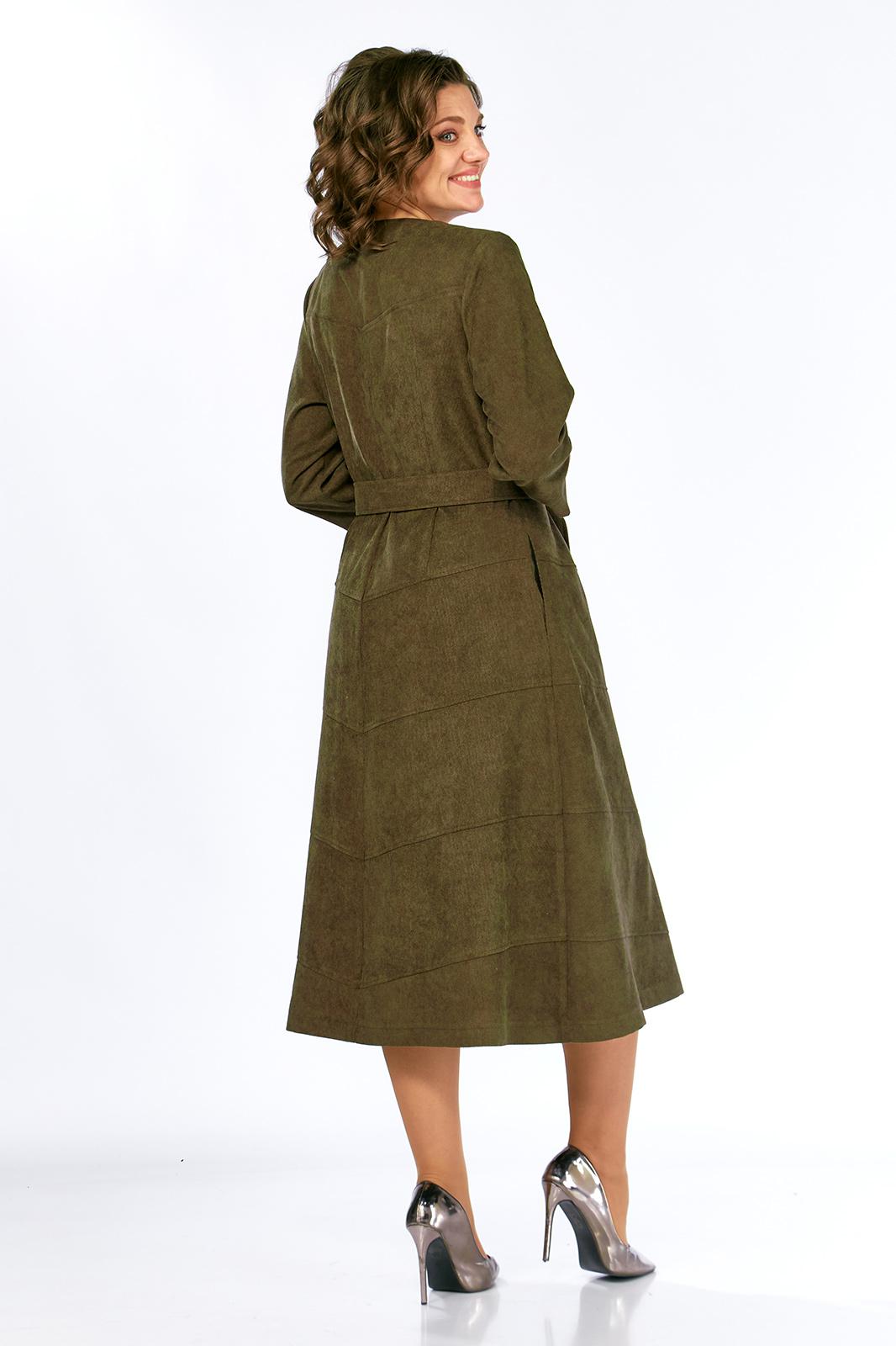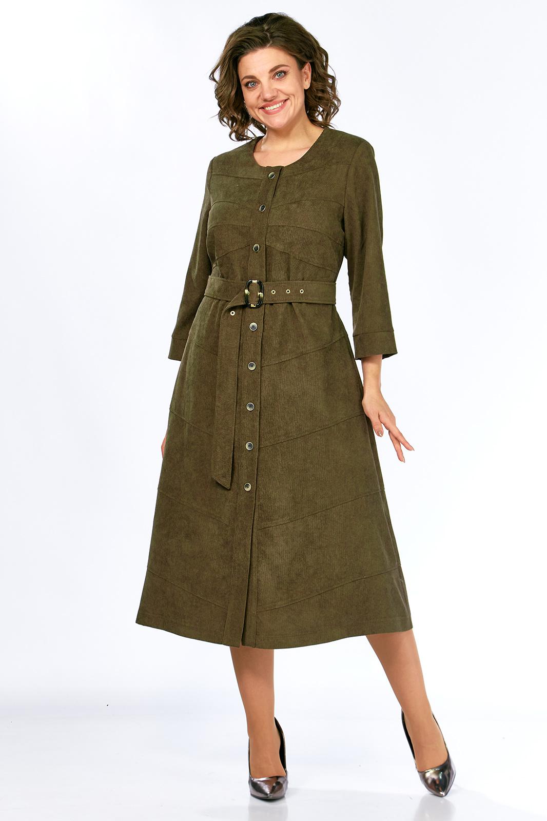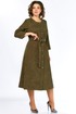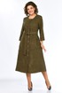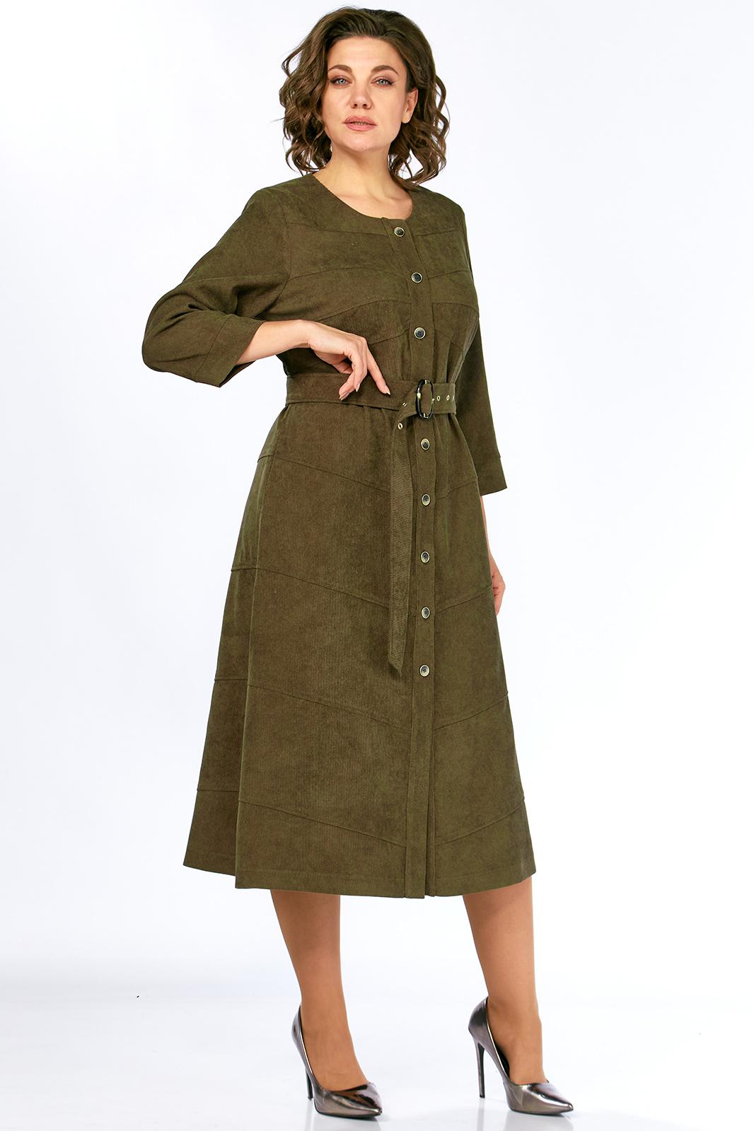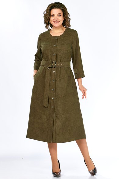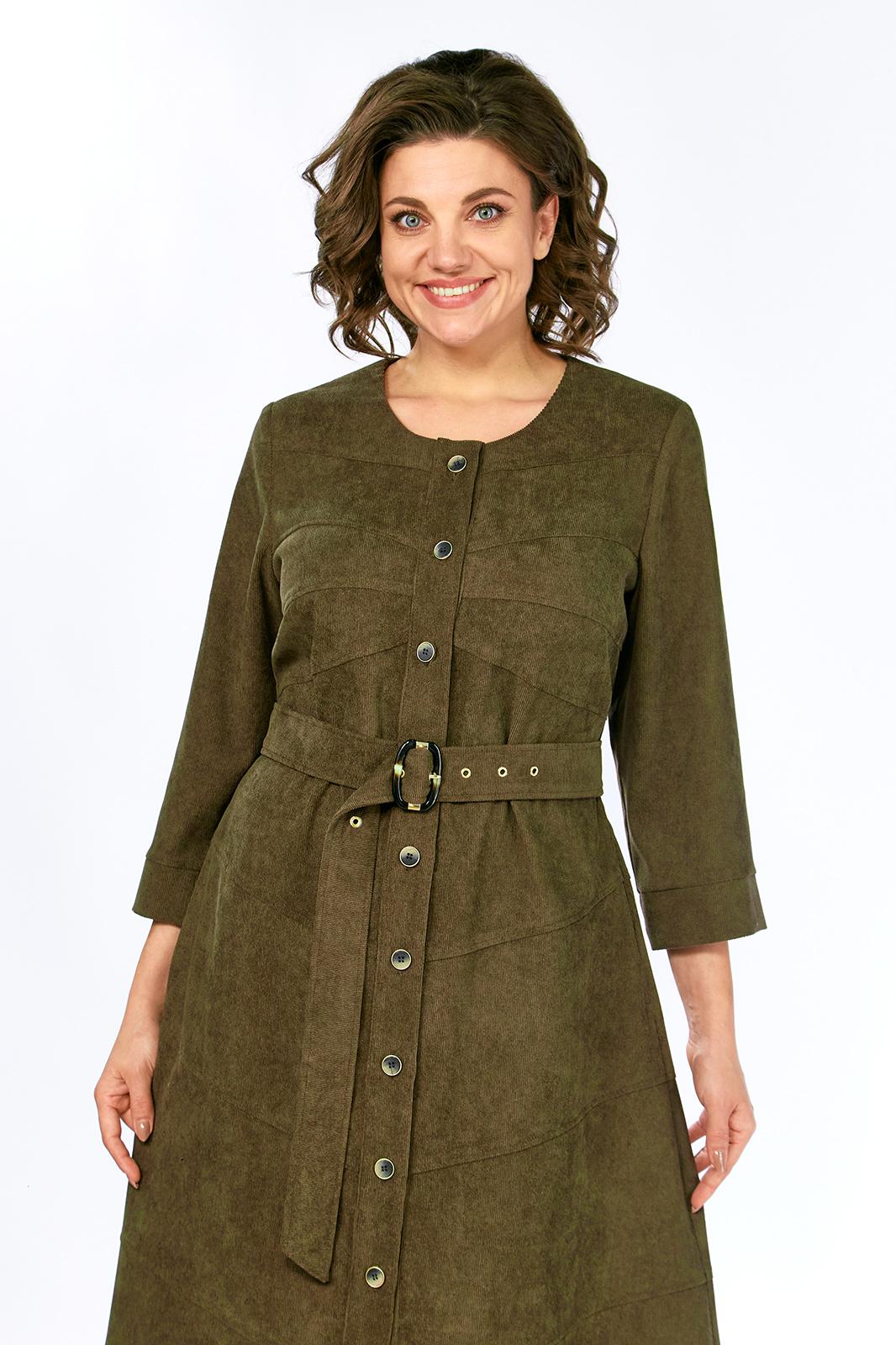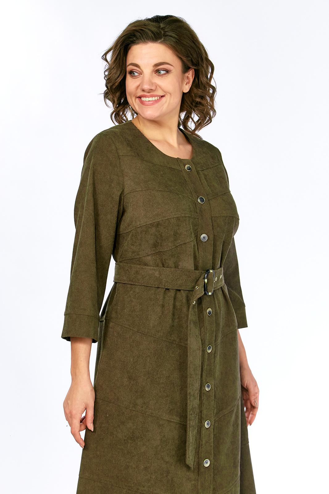 Платье женское А-силуэта из штруксовой ткани в длине миди. Перед с округлым вырезом и центральной застежкой на петли-пуговицы. В боковых швах функциональные карманы. Спинка с кокеткой и средним швом. Перед и спинка платья оформлены косыми подрезами по всей длине изделия. Рукав одношовный втачной, снизу на притачной манжете. Платье дополняет съемный пояс с декоративной пряжкой.