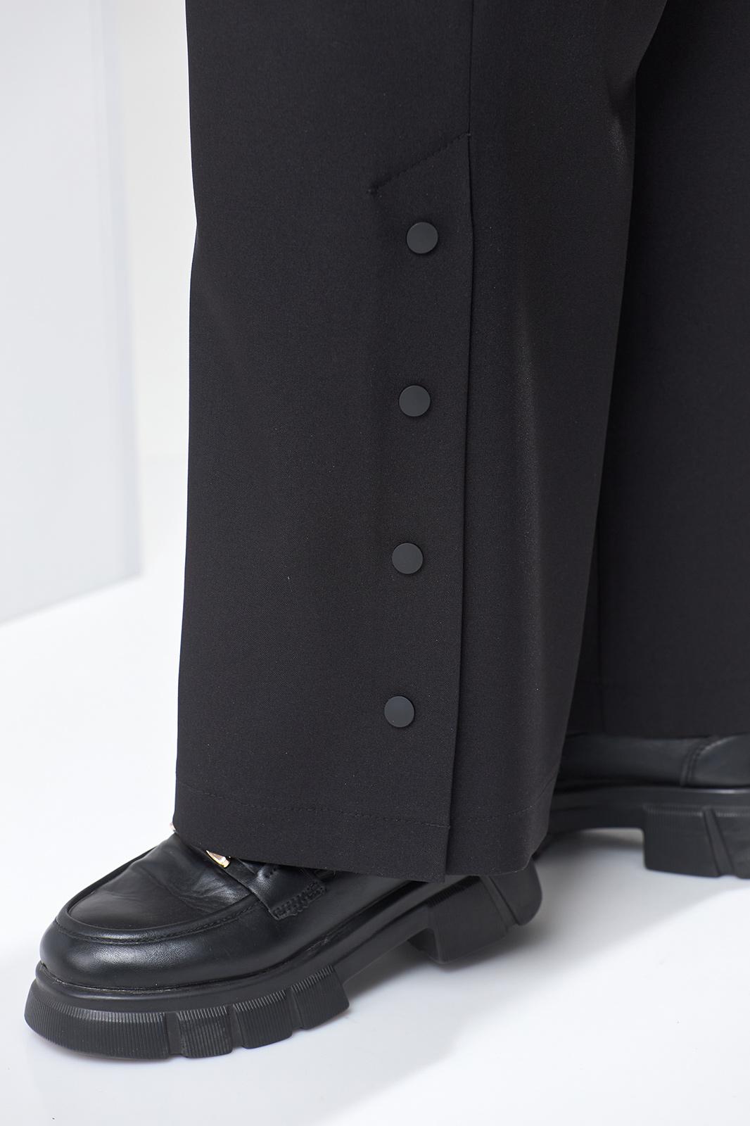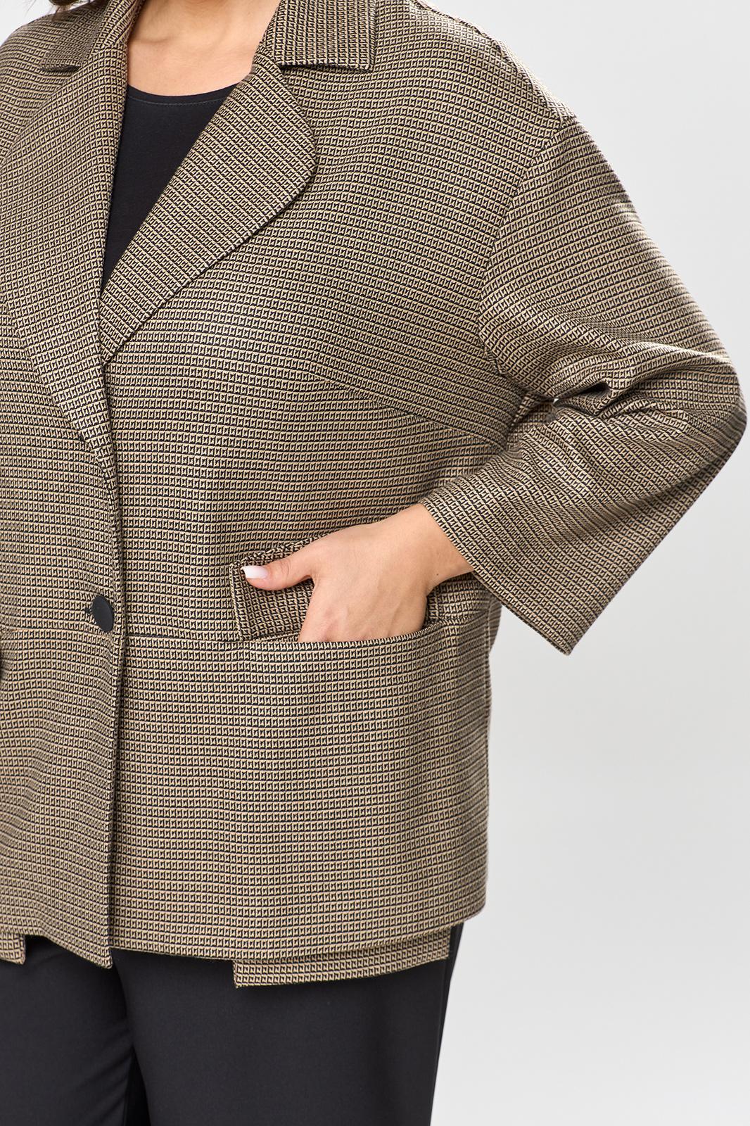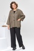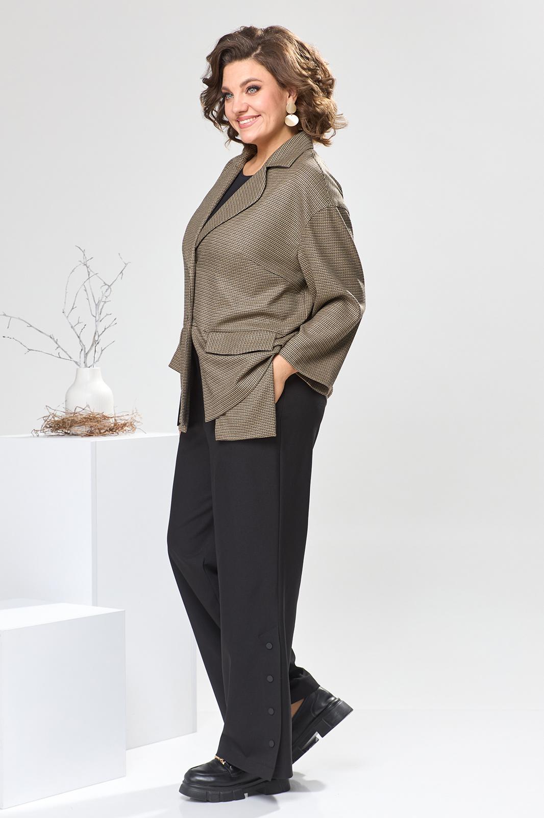 Костюм женский предназначен для повседневной носки. Костюм женский 2-х предметный жакет и брюки. Жакет женский прямого силуэта. Перед с 2-мя нагрудными вытачками, с горизонтальным подрезом ниже линии талии, с 2-мя карманами, обработанными в швах соединения подрезов. Карман с клапаном, на правой стороне клапан с на строчной аппликацией и декорированной тесьмой, фиксирующейся в на строчную шлёвку. Спинка цельнокроеная. Горловина с V-образым вырезом, с втачным воротником пиджачного типа с отложным лацканом с закруглёнными концами. Застёжка центральная бортовая, на 2-е обмётанные петли и 2-е пришивные пуговицы. Жакет со спущенным плечом. Рукав втачной, одно шовный, длиной 7/8. Жакет без плечевых накладок. Брюки женские прямые, длинные. Передние половинки с карманами в боковых швах. Задние половинки с таллиевыми вытачками. На левом боковом шве обработана высокая шлица, фиксирующаяся на 2-ть пробивных металлических кнопок. Брюки с притачным поясом собранным на эластичную тесьму. Длина брюк по боковому срезу 102 см. Длина спинки блузки 67 см, длина рукава 45 см.
