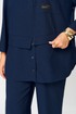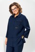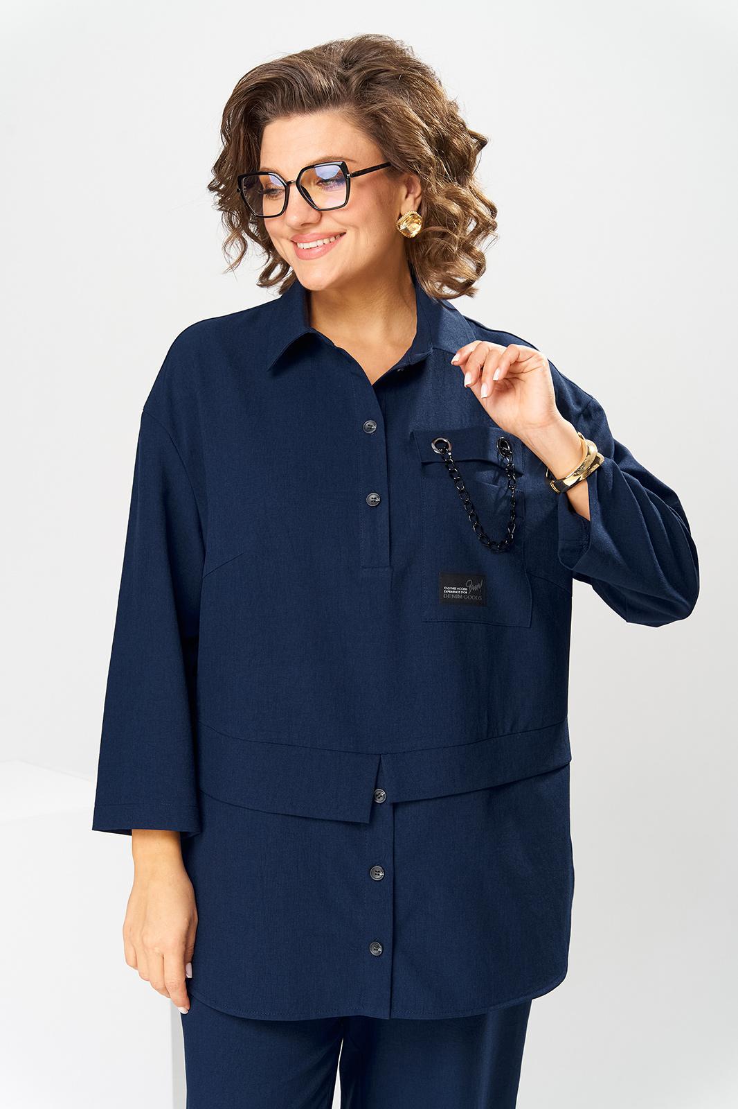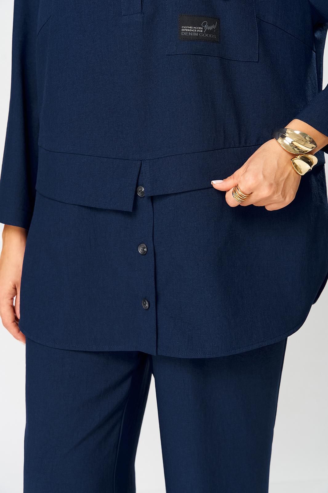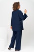 Костюм женский, предназначен для повседневной носки. Костюм женский 2-х предметный блузон и брюки. Блузон женский прямого силуэта, длиной ниже линии бёдер на 9 см. Блузон отрезной по линии талии. Верхняя часть переда с 2-мя нагрудными выточками, с 2-мя втачными планками, с 1-ним накладным прямоугольным карманом с клапаном на левой части переда на уровне линии груди. Карман декорирован аппликациями, клапан декорирован 2-мя пробивными металлическими блочками и декоративной цепочкой. Верхняя часть спинки цельнокроеная. Нижняя часть переда и нижняя часть спинки выполнены из отделочной ткани. Нижняя часть переда с 2-мя цельнокроеными планками с застёжкой на 3-и вертикально обмётанных петли и 2-и пришивные пуговицы. Боковые швы блузона с разрезами, с закруглёнными концами. Низ блузона обтачной. Шов соединения верхней и нижней частей блузона с притачными разноуровневыми планками с обтачными разрезами по центру переда и центру спинки. Горловина круглая с втачным воротником рубашечного типа с отрезной стойкой. Застёжка центральная на планках переда на 4-и обмётанные петли и 4-и пришивных пуговицы. Рукав втачной, одно шовный длиной 7/8. Блузон со спущенным плечом, без плечевых накладок. Брюки женские прямые, длинные. Передние половинки с карманами в боковых швах. Задние половинки с таллиевыми вытачками. Брюки с притачным поясом, собранным на эластичную тесьму. Длина брюк по боковому срезу 101 см. Длина спинки блузон в 78 см, длина рукава 45 см.