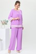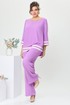 Костюм женский, относится к торжественной одежде. Костюм женский 2-х предметный, блузон и брюки. Блузон женский прямого силуэта, длиной ниже линии бёдер. Перед с 2-мя нагрудными вытачками, с декоративной вставкой по горловине, с горизонтальным подрезом внизу, с чередованием горизонтальных вставок из отделочной ткани. Спинка вверху с разрезом капелькойобработанным косой бейкой, фиксирующимся на 1-ну навесную петлю и 1-ну пришивную пуговицу. Горловина круглая, без воротника, обработана косой бейкой. Рукав втачной, одношовный, длиной 3/4, с притачной манжетой с чередованием горизонтальный вставок из отделочной ткани. Боковые швы с разрезами, низ фигурный, низ фигурный ступенька. Блузон с плечевыми накладками. Брюки женские прямые, длинные. Передние половинки с карманами в боковых швах. Задние половинки с таллиевым вытачками. Брюки с притачным поясом, собранным на эластичную тесьму, закреплённую 2-мя отделочными строчками. Длина брюк по боковому срезу 103 см. Длина спинки блузона 74 см, длина рукава 47 см.