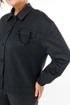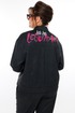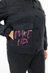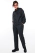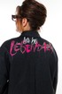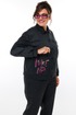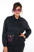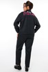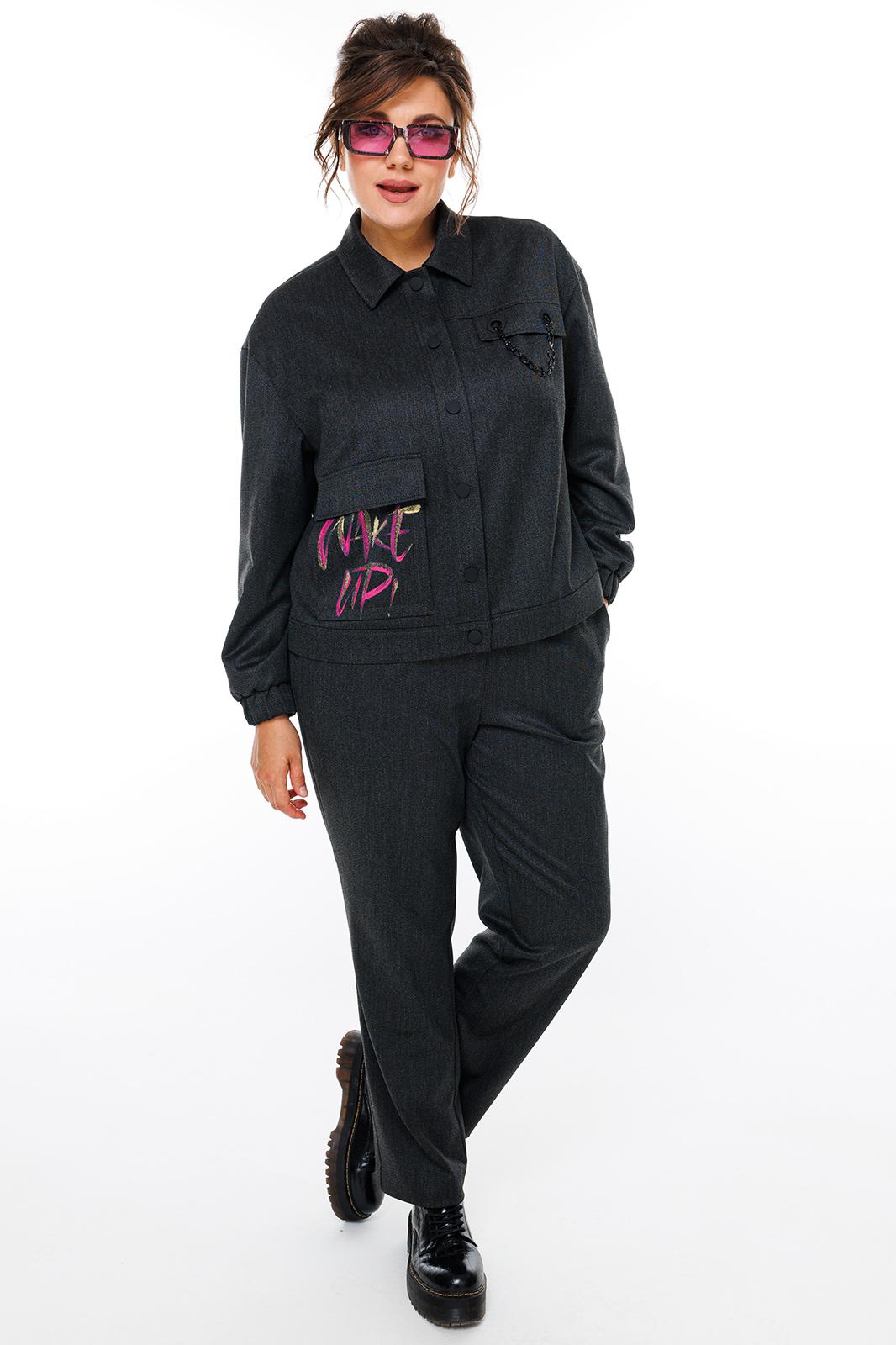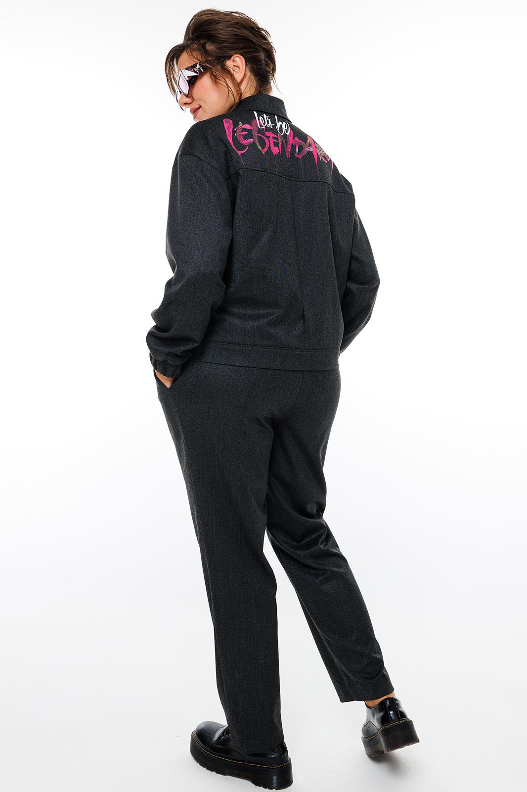 Костюм женский, предназначен для повседневной носки. Костюм женский, 2-х предметный жакет и брюки. Жакет прямого силуэта, длиной до линии бёдер. Перед с 2-мя нагрудными вытачками, с отрезной кокеткой на левой части переда, шов притачивания кокетки с прямоугольным клапаном, декорированным 2-мя пробивными блочками и тесьмой цепочкой. Правая часть с накладным карманом. Перед с 2-мя притачными вертикальными планками. Спинка с отрезной кокеткой, декорированной принтом, со встречной складкой по центру, зафиксированной отделочной строчкой сверху и снизу. Жакет с притачной планкой по низу. Горловина круглая с втачным воротником. Застёжка центральная на 6-ть пробивных металлических кнопок. Жакет со спущенным плечом. Рукав втачной, одно шовный, длинный с притачной манжетой, собранной на эластичную тесьму. Жакет на притачной подкладке. Жакет без плечевых накладок. Брюки женские, прямые, длинные. Передние половинки с карманами в боковых швах. Задние половинки с таллиевыми вытачками. Брюки с притачным поясом, собранным на эластичную тесьму. Длина спинки жакета 59 см. Длина рукава 53 см. Длина брюк по боковому срезу 100 см. Печать может не много отличаться от фото.