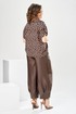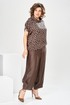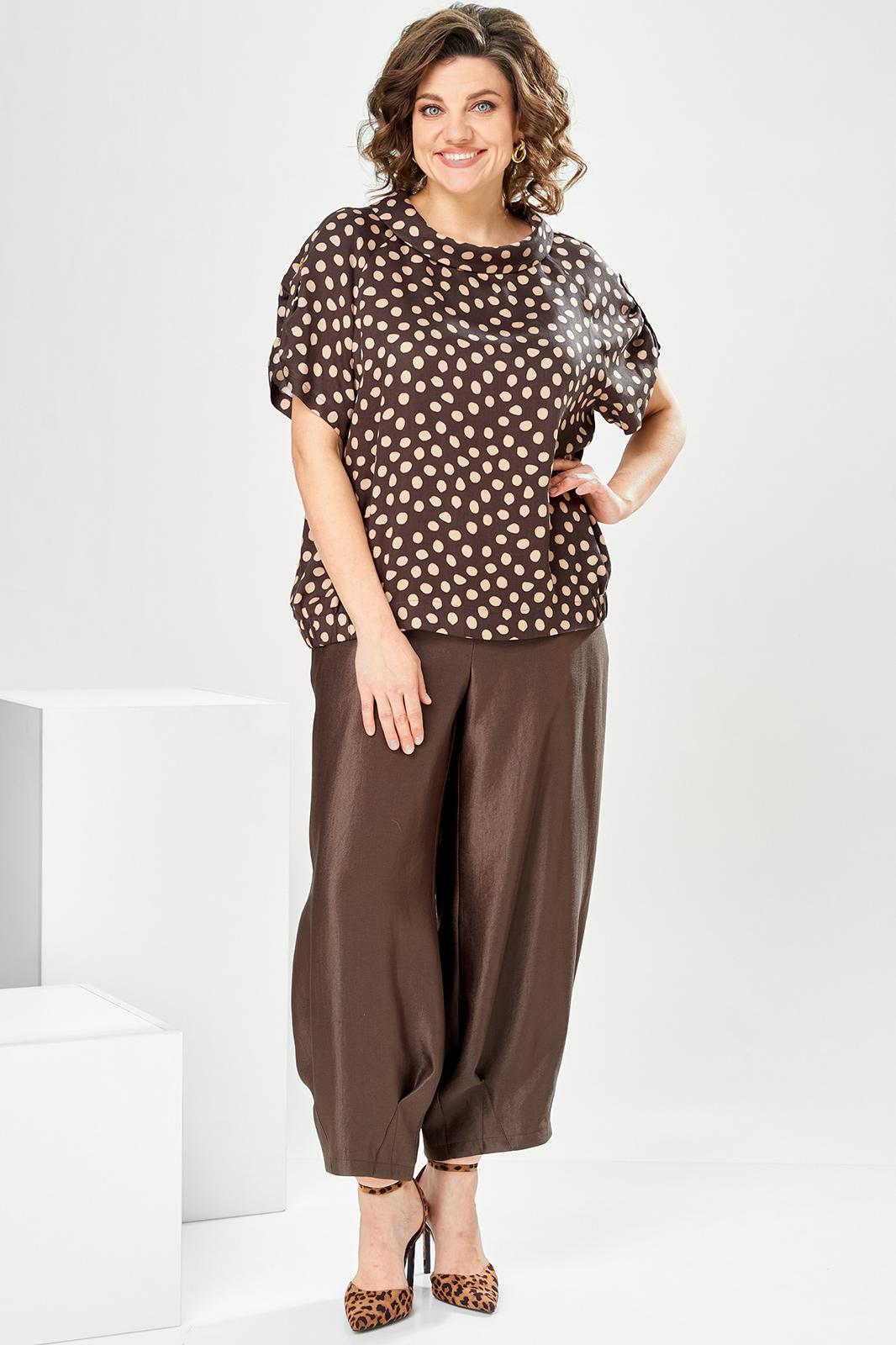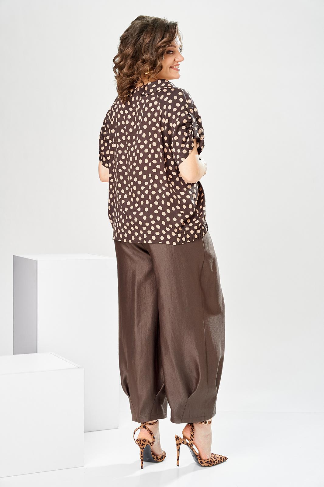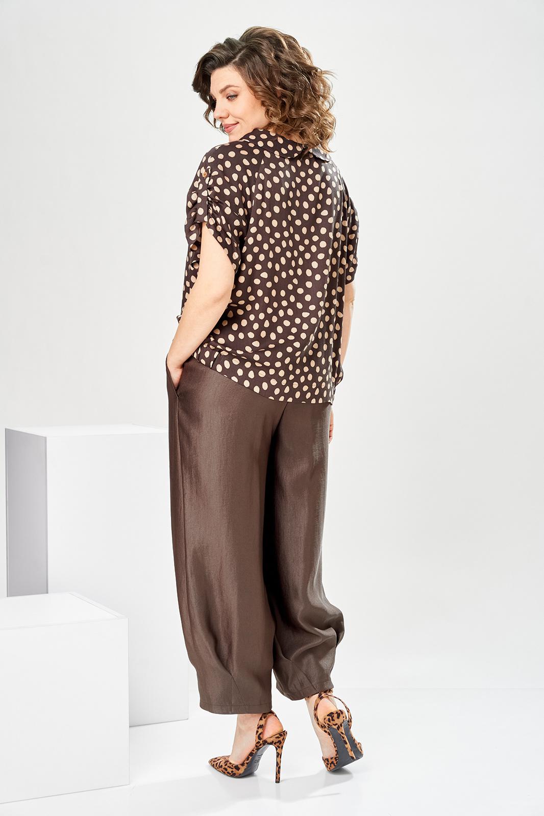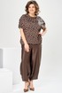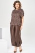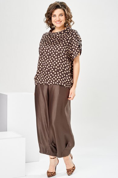 Костюм женский, предназначен для повседневной носки. Костюм женский 2-х предметный, блузка и брюки. Блузка женская прямого силуэта длиной ниже линии бёдер. Перед и спинка цельнокроеные, без конструктивных особенностей. Горловина круглая, с втачным воротником, с цельнокроенной стойкой, с закруглёнными концами на спинке; шов втачивания воротника обработан косой бейкой. Рукав реглан, втачной, 2-х шовный, короткий, низ верхнего шва собран на эластичную тесьму и декорирован надстрочным хлястиком, фиксирующимся к рукаву на пришивную пуговицу и обмётанную петлю на хлястики. Низ блузки по бокам собран на эластичную тесьму. Блузка без плечевых накладок. Брюки женские аладины, длиной 7/8. передние половинки с обтачными карманами в боковых швах, низ с 2-мя односторонними, зафиксированными фигурными отделочными строчками-складками. Задние половинки так же с 2-мя односторонними зафиксированными фигурными строчками складками. Низ брюк обтачной, зафиксирован отделочной строчкой. Брюки на центральной застёжке на тесьму-молнию. Пояс притачной с застёжкой на 1-ну обмётанную петлю и 1-ну пришивную пуговицу, по спинке собран на эластичную тесьму. Длина спинки блузки 62 см, длина рукава 28,5 см. Длина брюк по боковому шву без пояса 95 см, длина брюк по шаговому шву 68 см.