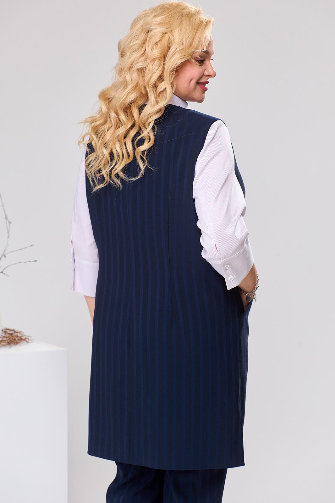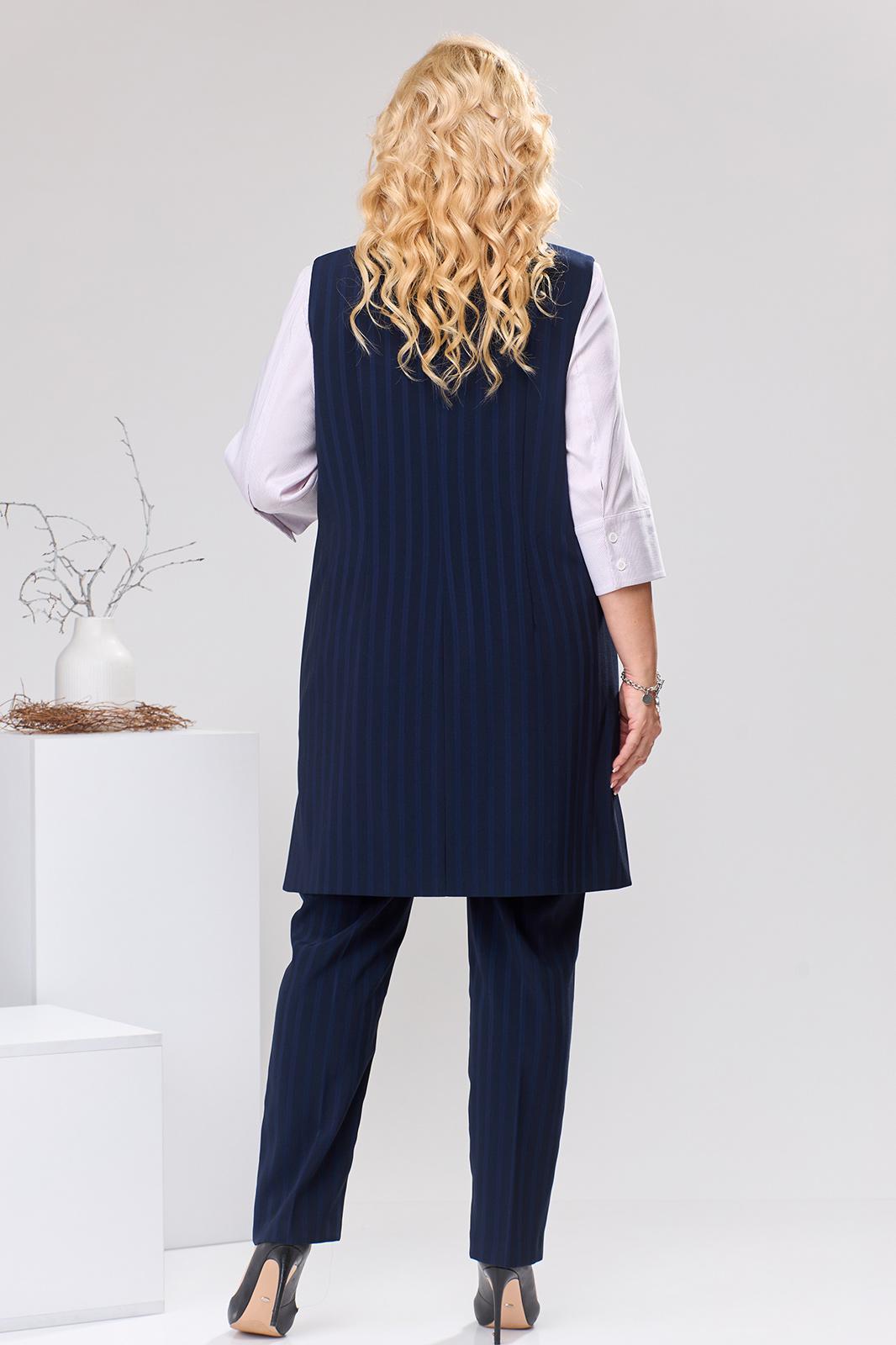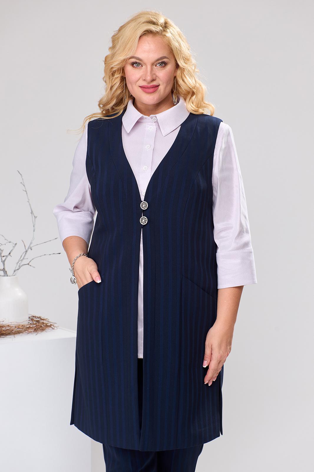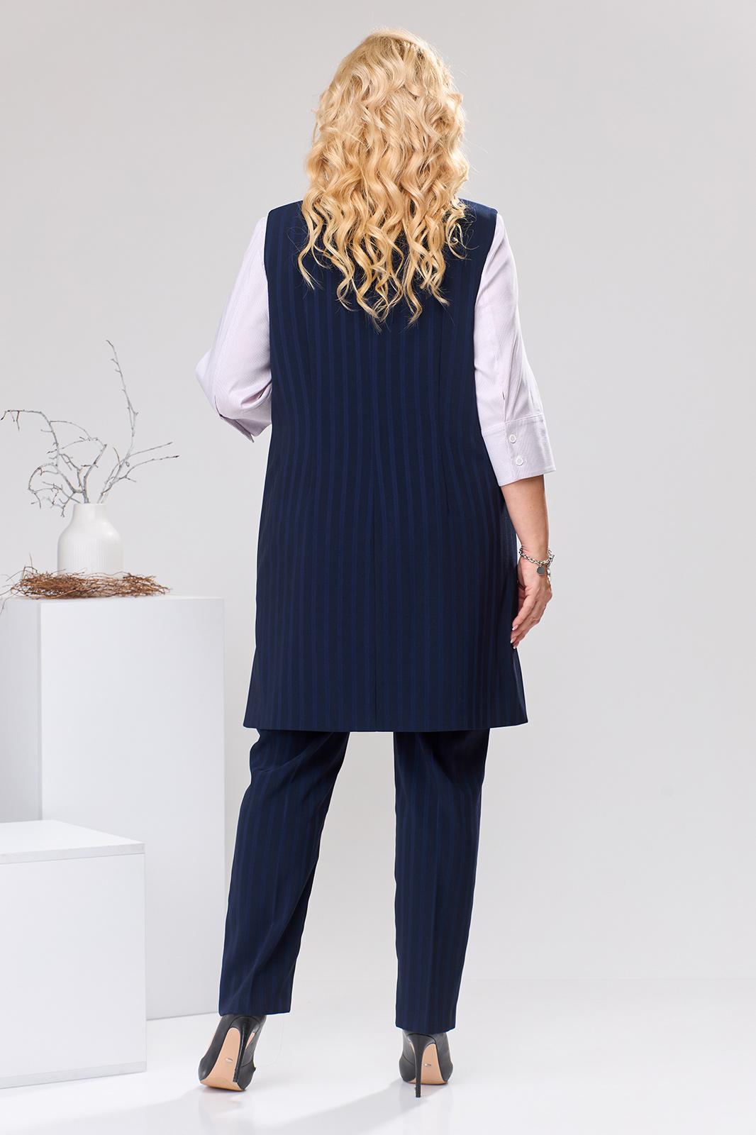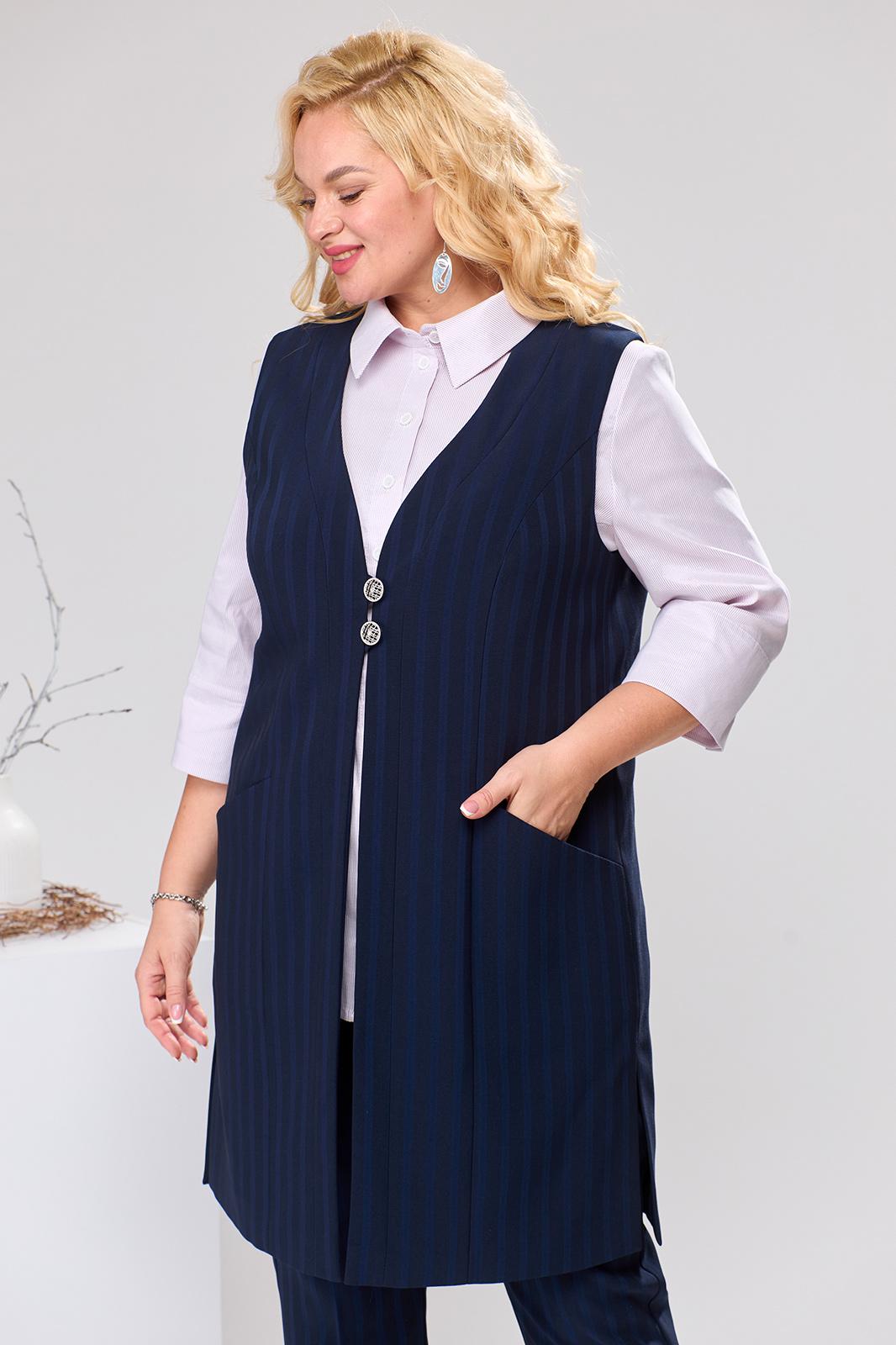 Стильный офисный комплект с брюками для женщин. Костюм синего цвета с длинным жилетом.Комплект женский трех предметный: жилет, блузка и брюки предназначен для повседневной носки. Жилет женский полуприлегающего силуэта. Перед с отрезной планкой по краю борта, с отрезными рельефами, с бочками. На бочках на уровне линии бедер обработаны накладные карманы. Спинка с двумя талиевыми вытачками и средним швом. Горловина V-образная, обтачная, без воротника. Застежка центральная на две навесные петли и две пришивные пуговицы. Боковые швы с разрезами. Жилет на подкладке. Блузка женская прямого силуэта, длиной до линии бедер. Перед с двумя нагрудными вытачками, с двумя цельнокроенными планками. Спинка с двумя талиевыми вытачками. Горловина круглая, с воротником рубашечного типа, с отрезной стойкой. Рукав втачной, двух шовный, длиной 3\4, с притачной манжетой, фиксирующейся на две обметанные петли и две пришивные пуговицы. Застежка центральная на десять обметанных петель и десять пришивных пуговиц. Блузка с плечевыми накладками. Брюки женские, длинные, слегка заужены к низу. Передние и задние половинки с двумя талиевыми вытачками. Застежка на тесьму-молнию. Верхний срез с притачным поясом, застегивающимся на одну обметанную петлю и одну пришивную пуговицу. Между вытачками задних полотнищ и боковыми швами пояс собран на эластичную тесьму. Длина спинки жилета 94см. Длина блузки 71см. Длина рукава 47см. Длина брюк 102см.