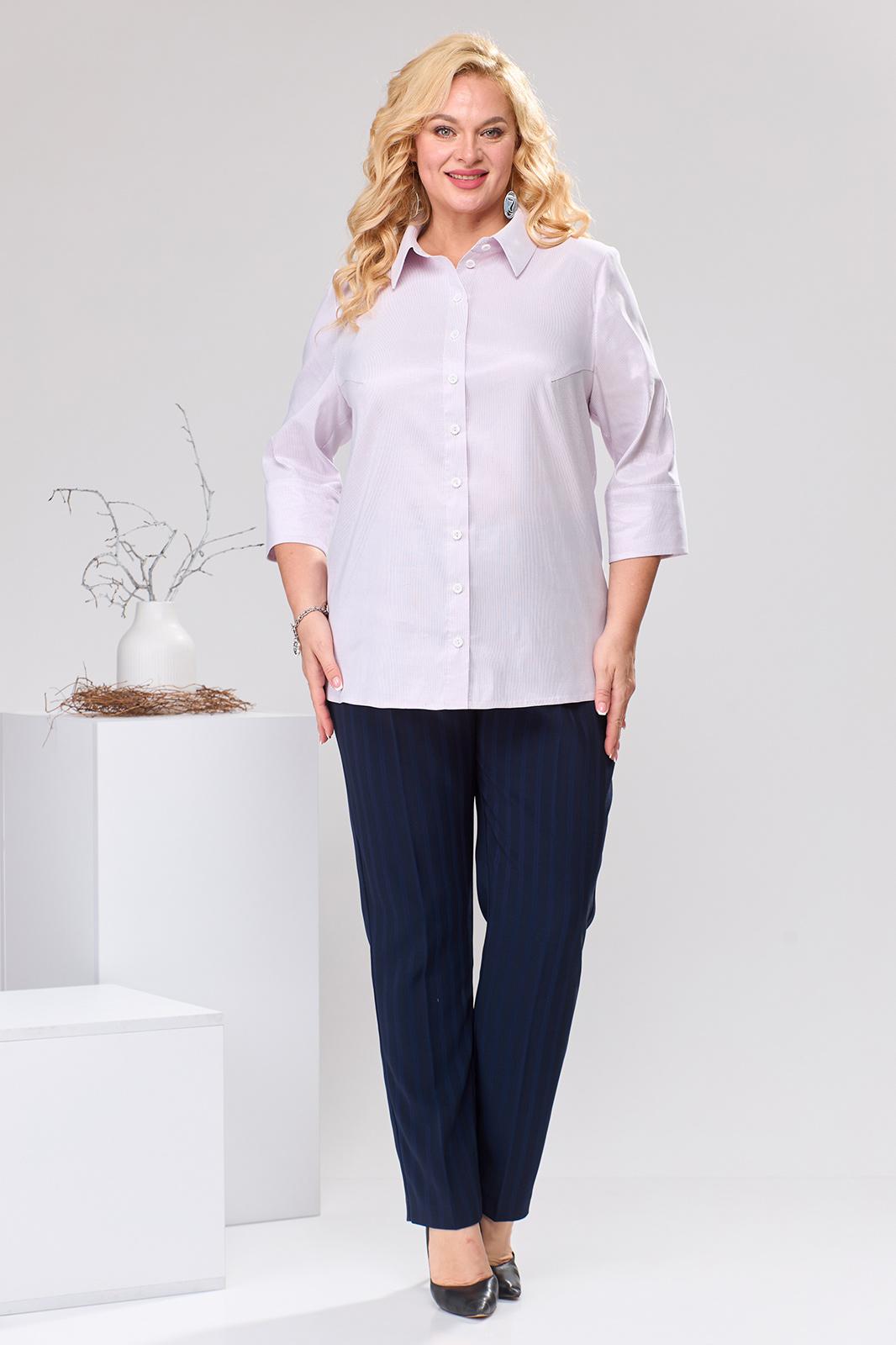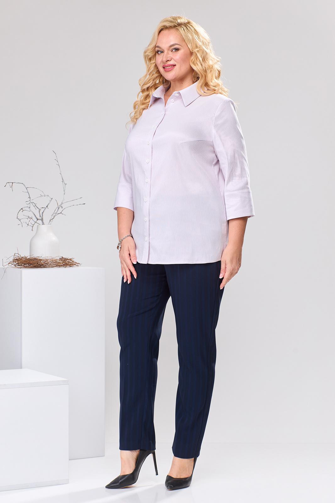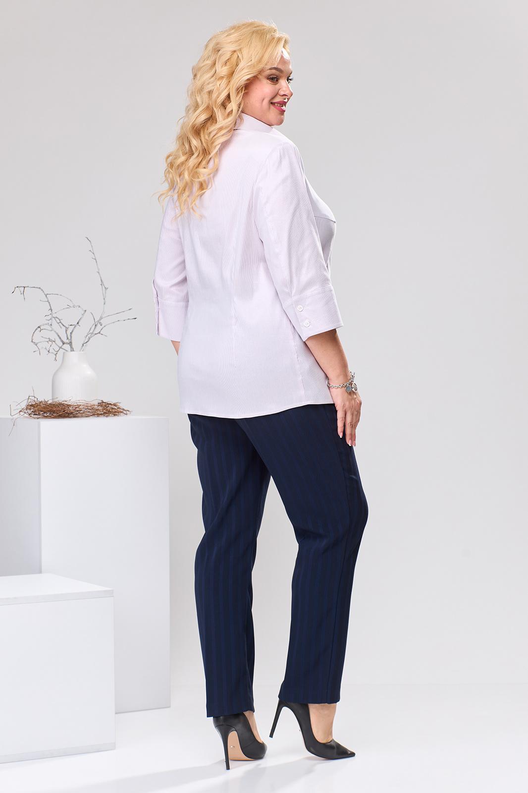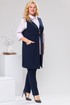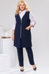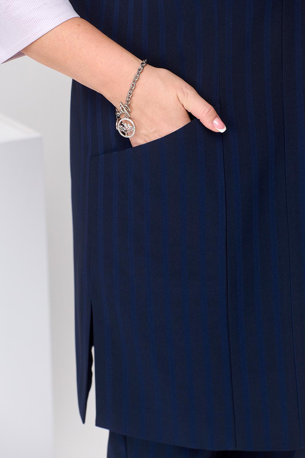 Стильный офисный комплект с брюками для женщин. Костюм синего цвета с длинным жилетом.Комплект женский трех предметный: жилет, блузка и брюки предназначен для повседневной носки. Жилет женский полуприлегающего силуэта. Перед с отрезной планкой по краю борта, с отрезными рельефами, с бочками. На бочках на уровне линии бедер обработаны накладные карманы. Спинка с двумя талиевыми вытачками и средним швом. Горловина V-образная, обтачная, без воротника. Застежка центральная на две навесные петли и две пришивные пуговицы. Боковые швы с разрезами. Жилет на подкладке. Блузка женская прямого силуэта, длиной до линии бедер. Перед с двумя нагрудными вытачками, с двумя цельнокроенными планками. Спинка с двумя талиевыми вытачками. Горловина круглая, с воротником рубашечного типа, с отрезной стойкой. Рукав втачной, двух шовный, длиной 3\4, с притачной манжетой, фиксирующейся на две обметанные петли и две пришивные пуговицы. Застежка центральная на десять обметанных петель и десять пришивных пуговиц. Блузка с плечевыми накладками. Брюки женские, длинные, слегка заужены к низу. Передние и задние половинки с двумя талиевыми вытачками. Застежка на тесьму-молнию. Верхний срез с притачным поясом, застегивающимся на одну обметанную петлю и одну пришивную пуговицу. Между вытачками задних полотнищ и боковыми швами пояс собран на эластичную тесьму. Длина спинки жилета 94см. Длина блузки 71см. Длина рукава 47см. Длина брюк 102см.