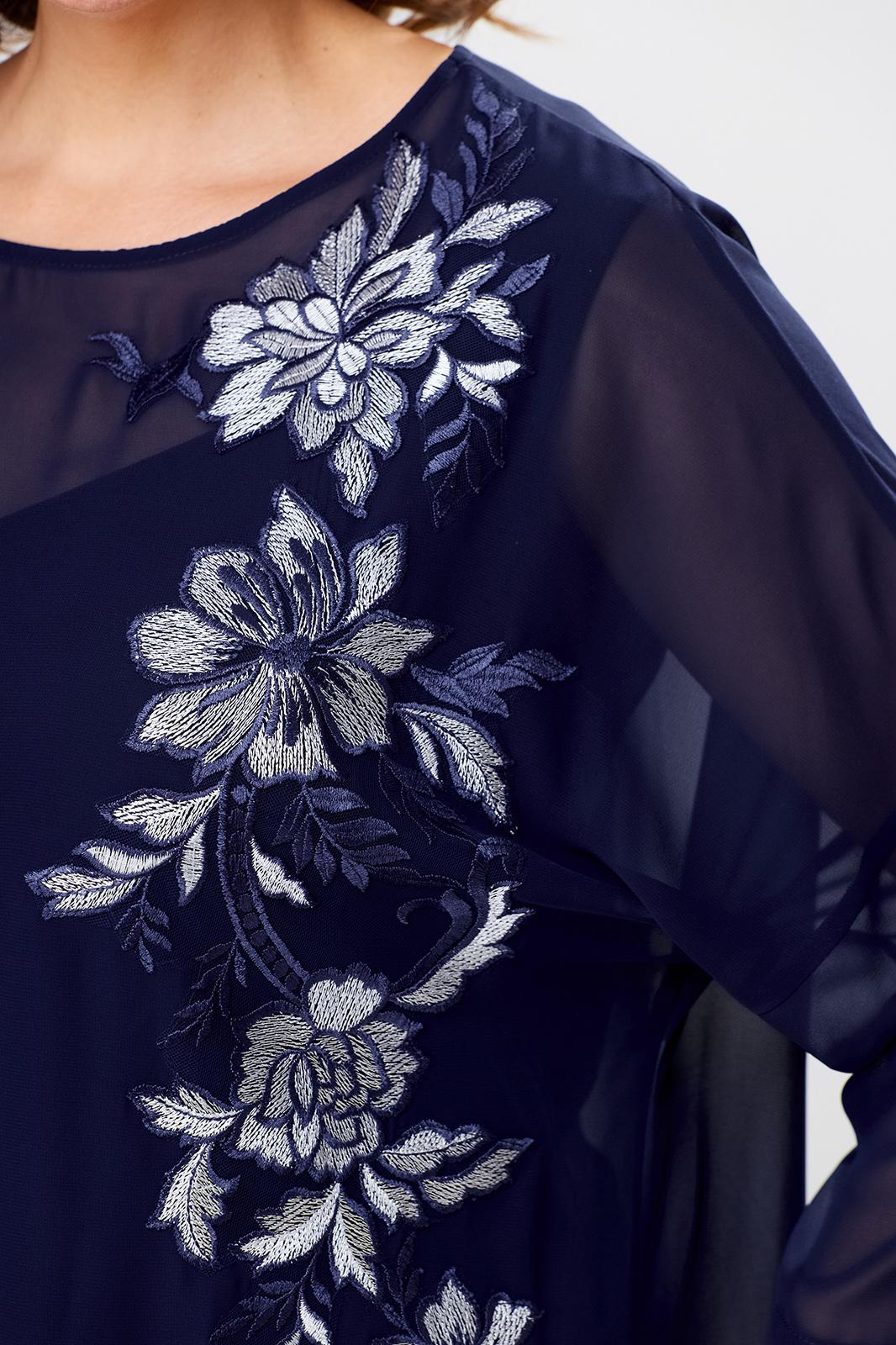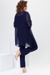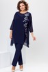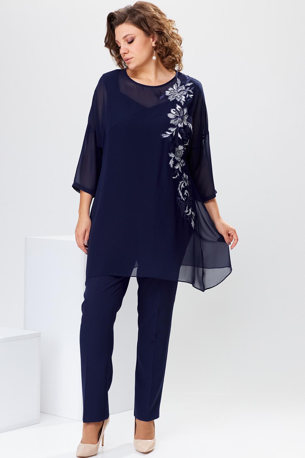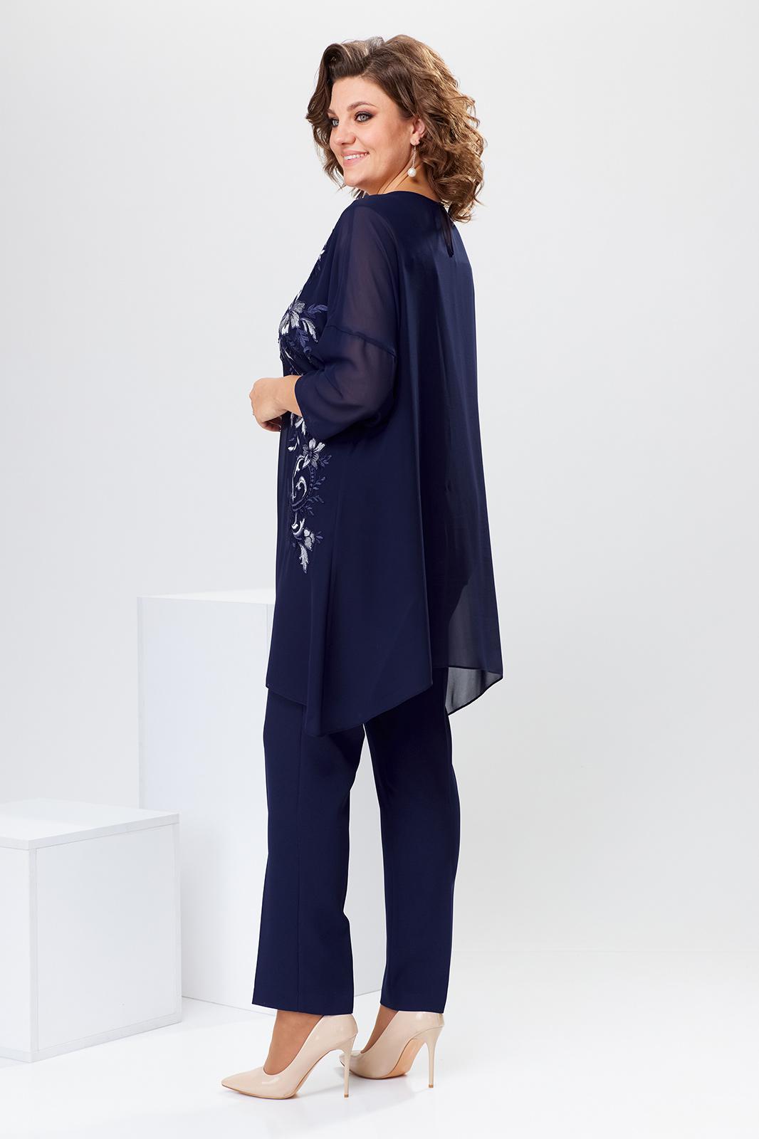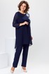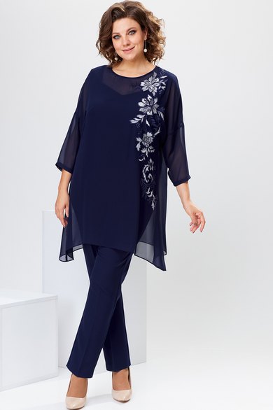Комплект женский относится к нарядной торжественной одежде. Комплект женский трехпредметный: блузка, топ и брюки. Блузка женская прямого силуэта, с фигурным низом, со спущенной проймой. Перед цельнокроеный, декорирован кружевом. Спинка цельнокроеная. Горловина круглая, обтачная, без воротника. Рукав одно шовный, длиной 7/8. Топ женский, длиной до линии бедер. Перед цельнокроеный, с двумя нагрудными вытачками. Спинка цельнокроеная. Горловина фигурная, обтачная. Бретели широкие обтачный. Брюки длинные, слегка заужены книзу. Передние и задние половинки с двумя талиевыми вытачками. Застежка на тесьму-молнию. Верхний срез с притачным поясом, застегивающимся на одну обметанную петлю и одну пришивную пуговицу. Между боковым швом и вытачкой на задних половинках собран на эластичную тесьму. Длина топа 57 см. Длина блузки 79.5 см, длина рукава 57-58-59 см соответственно. Длина брюк 102 см.