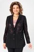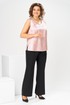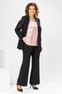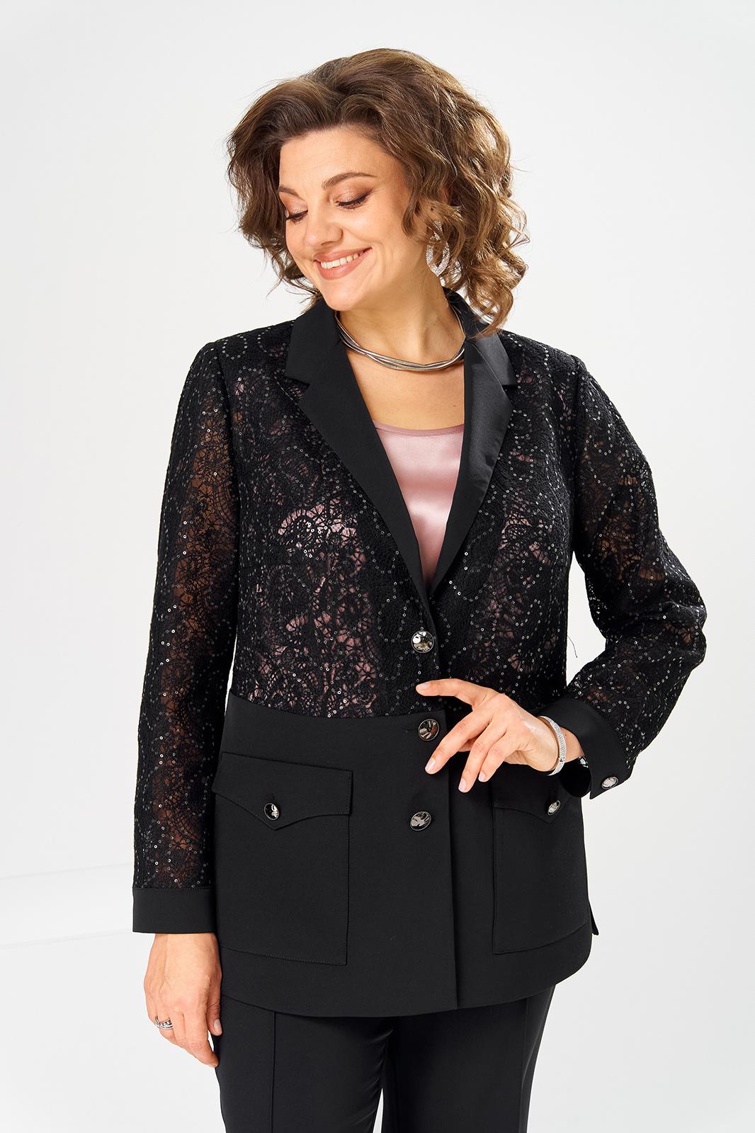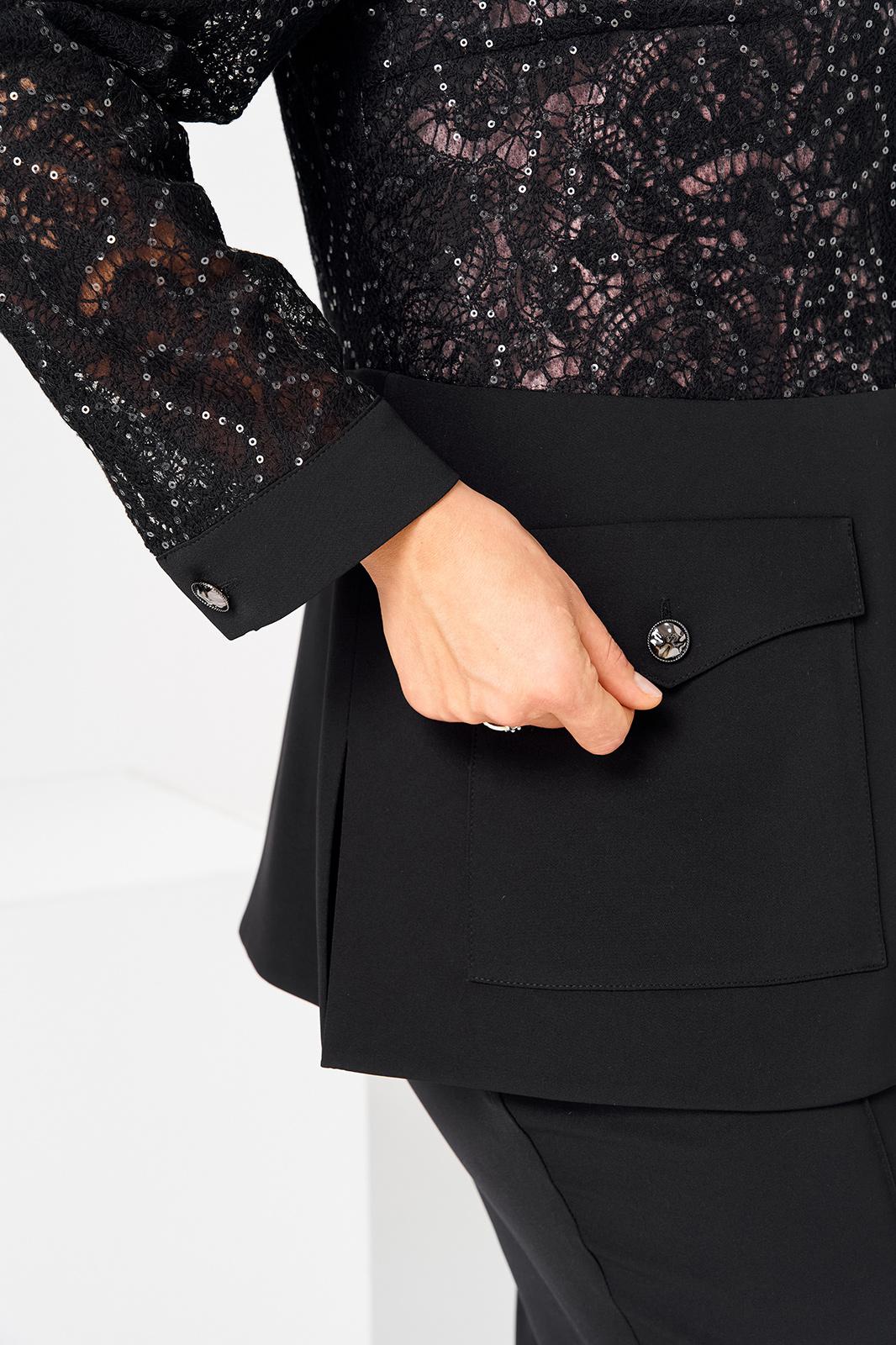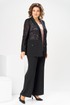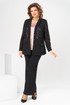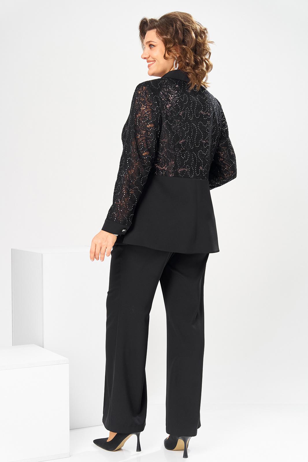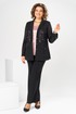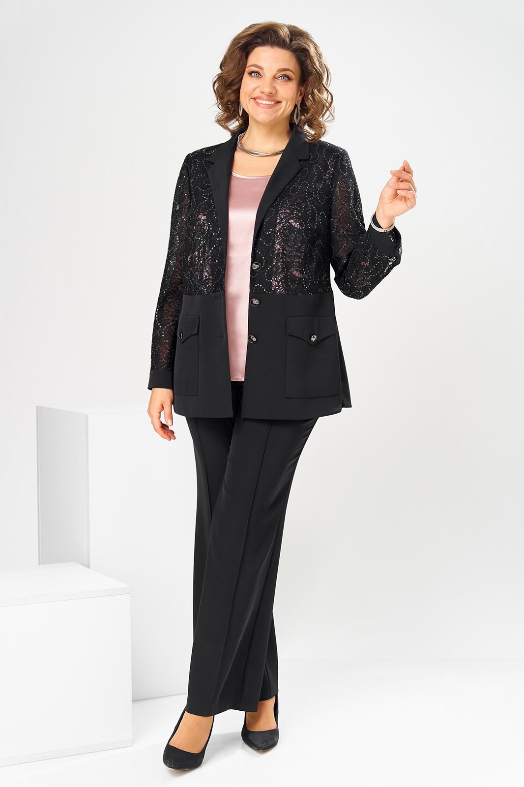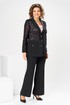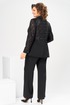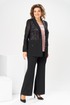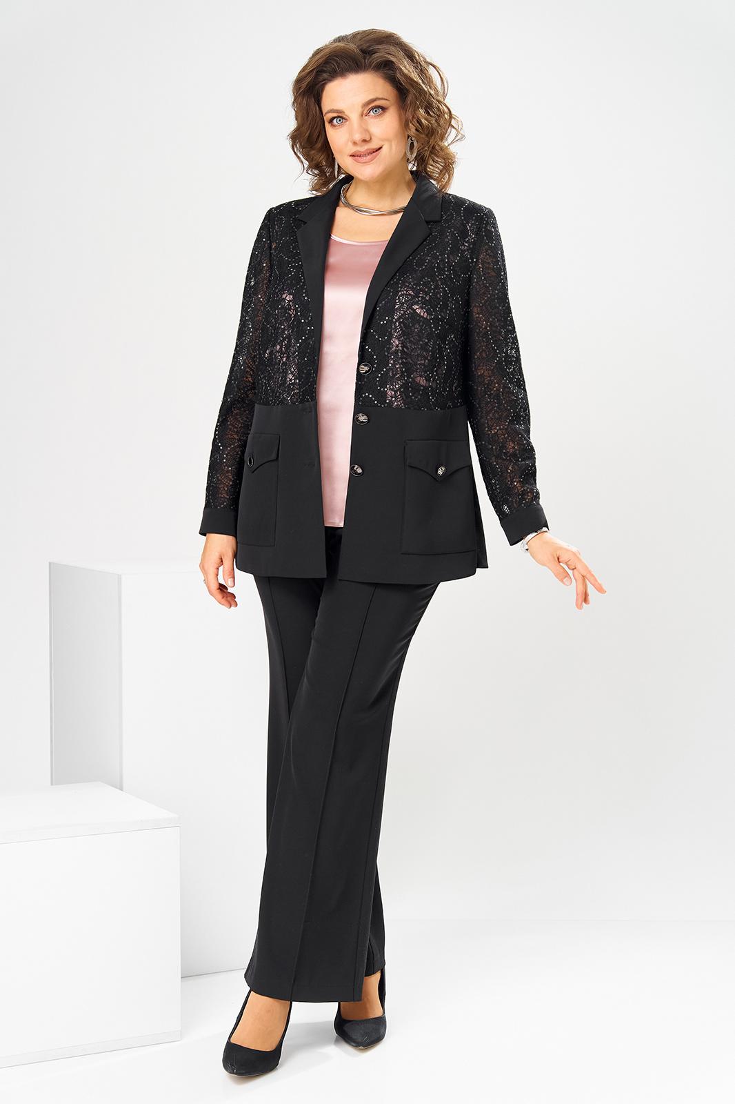 Комплект женский, относится к торжественной нарядной одежде. Комплект женский, 3-х предметный, жакет, топ и брюки. Жакет полу прилегающего силуэта, длиной ниже линии бёдер н6а 9 см. Жакет отрезной по линии талии. Верхняя часть переда из отделочной ткани с 2-мя нагрудными вытачками, нижняя двойная с накладными фигурными карманами с фигурными клапанами, с застёжкой на обмётанную петлю и пришивную пуговицу. Верхняя часть спинки из отделочной ткани, с 2-мя таллиевыми вытачками, нижняя двойная, обтачная. Горловина с v-образным вырезом с втачным воротником пиджачного типа с отложным лацканом. Застёжка центральная ботовая на 3-и обмётанные петли и пришивные пуговицы. Рукав из отделочной ткани, длинный, 2-х шовный, втачной с притачной манжетой с застёжкой на 1-ну обмётанную петлю и 1-ну пришивную пуговицу. Жакет с плечевыми накладками. Топ женский прямого силуэта, длиной до линии бёдер. Перед с 2-мя нагрудными вытачками. Спинка без конструктивных особенностей, цельнокроеная. Боковые швы с разрезами. Горловина круглая, без воротника. Горловина проймы обработаны косой бейкой. Брюки женские прямые, длинные. Передние половинки с карманами в боковых швах , по центру с декоративными защипами шириной 0,2 см. Задние половинки с таллиевыми вытачками. Застёжка центральная на тесьму-молнию. Брюки с притачным поясом с застёжкой на 1-ну обмётанную петлю и 1-ну пришивную пуговицу, по бокам собранным на эластичную тесьму, закреплённую 2-мя отделочными строчками. Длина спинки жакета 71 см. Длина брюк по боковому шву 103 см, длина брюк по шаговому шву 76 см. Длина спинки топа 64 см.