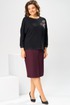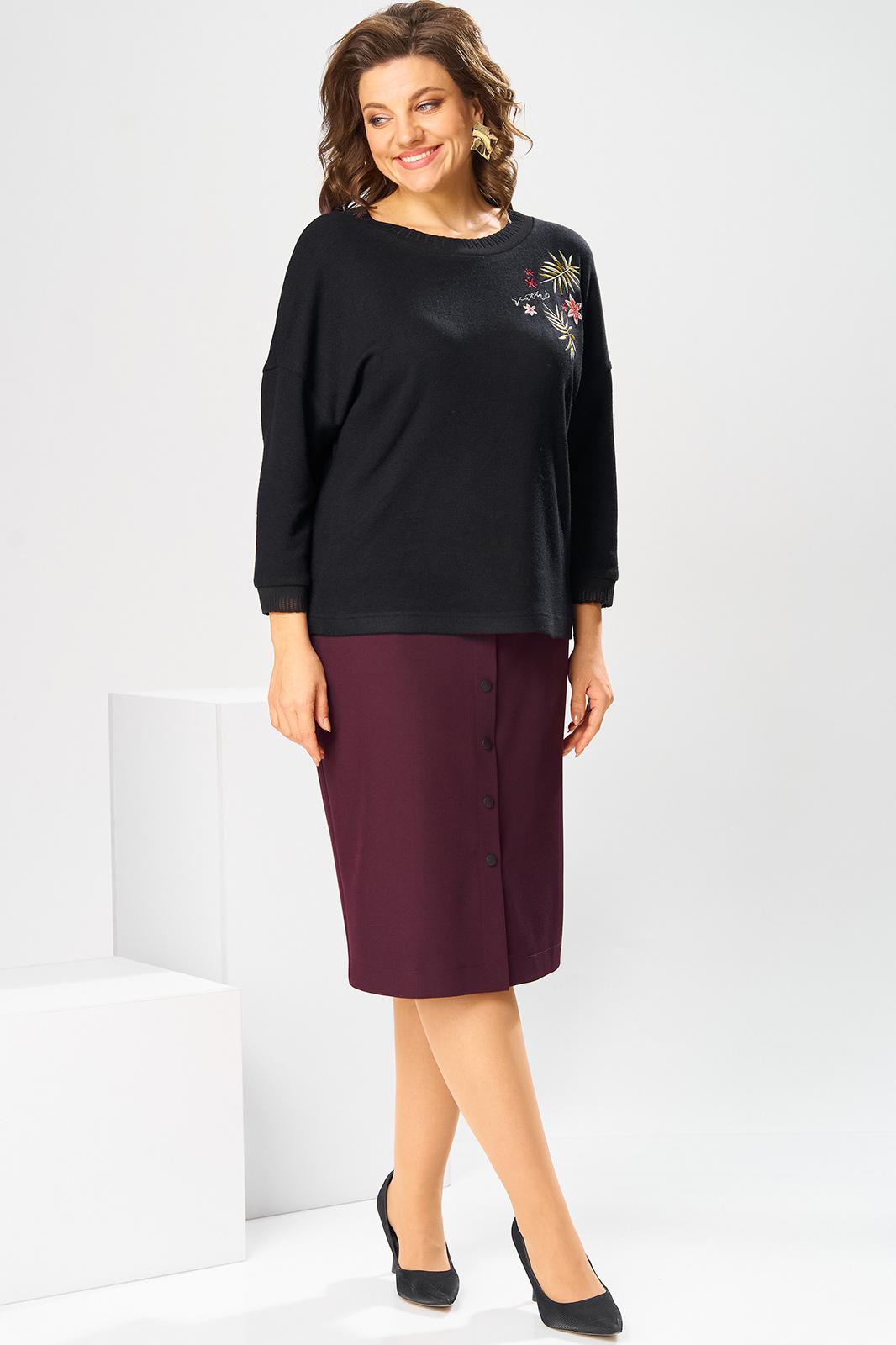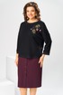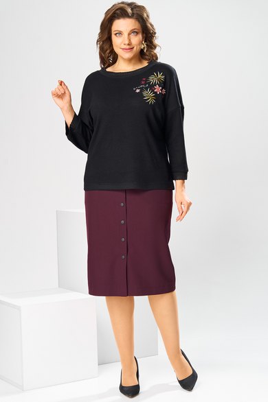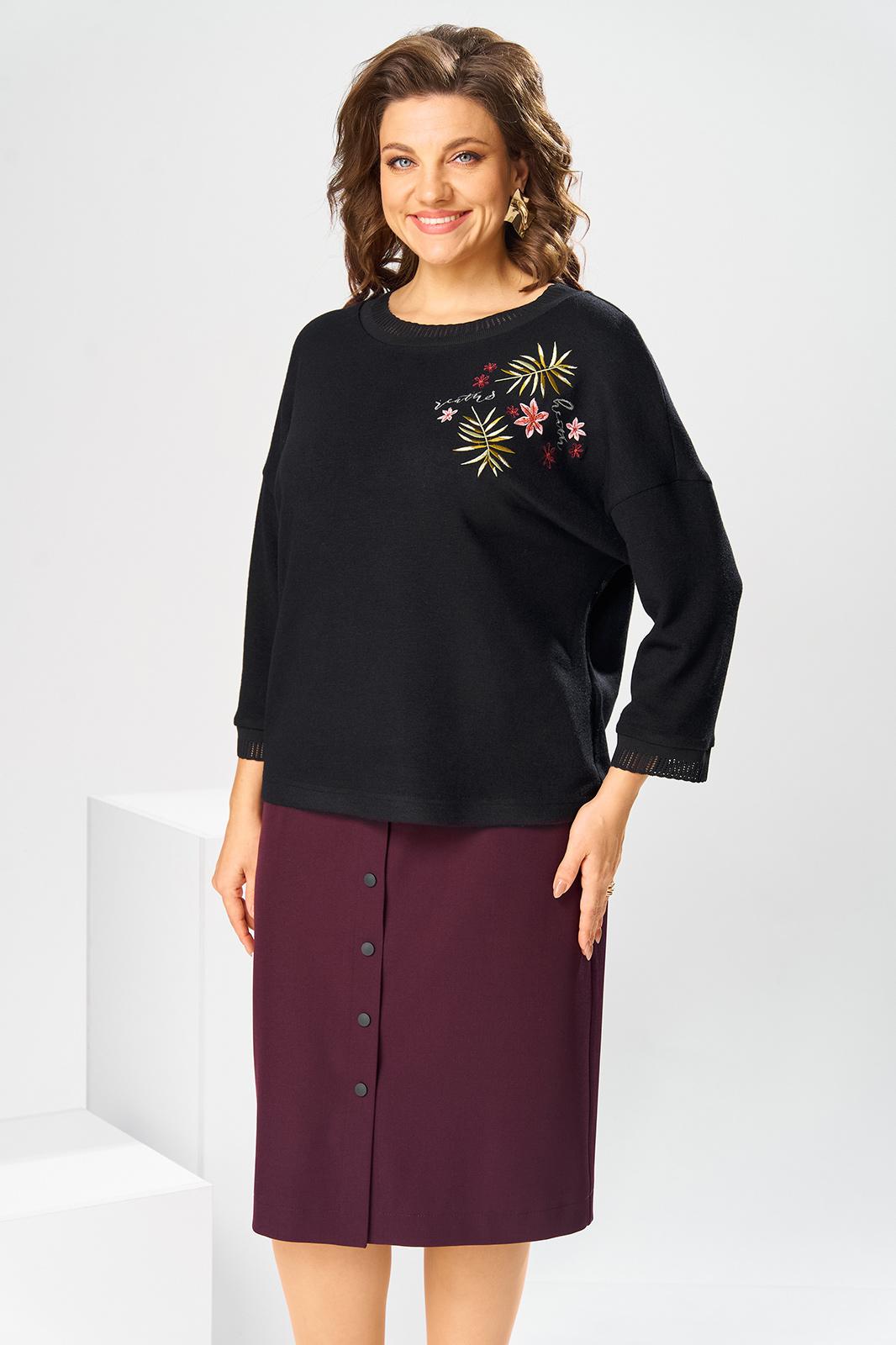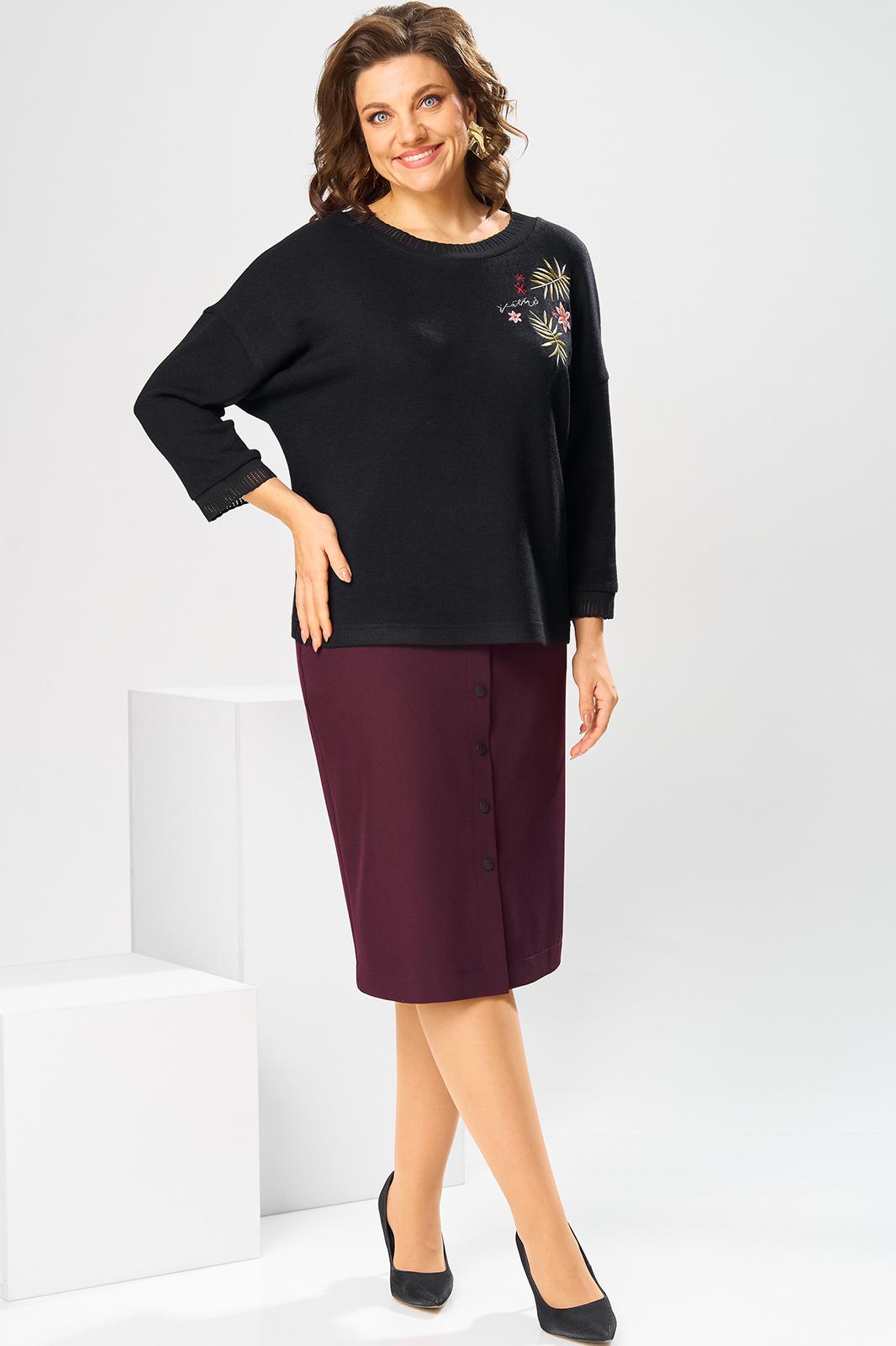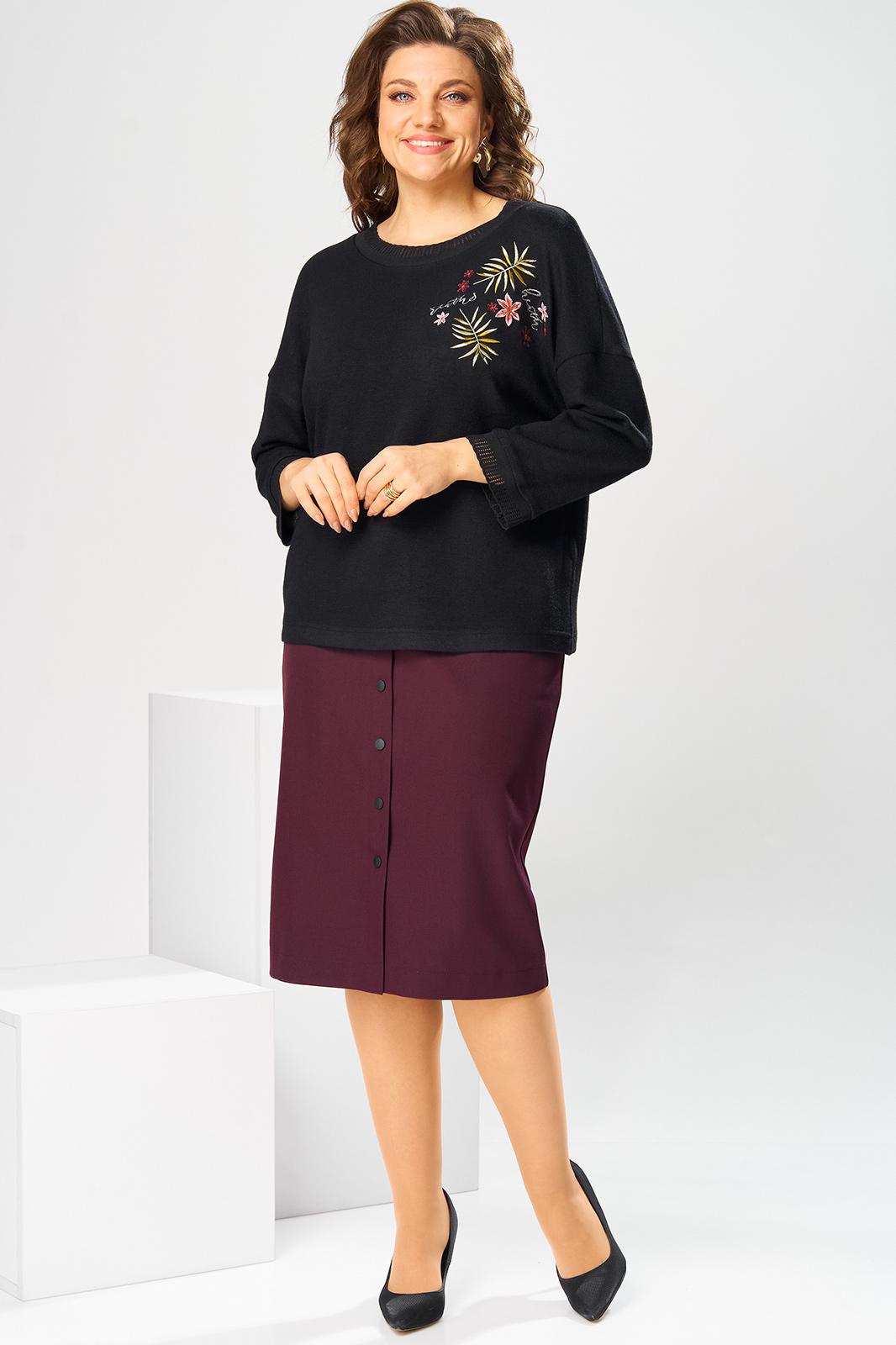 Костюм женский двух предметный: джемпер и юбка предназначен для повседневной носки. Джемпер прямого силуэта, длиной до линии бедер. Перед цельнокроеный, декорирован худ. Вышивкой. Спинка цельнокроеная. Горловина круглая, с втачной фигурной планкой из отделочной ткани. Джемпер со спущенной проймой. Рукав втачной, одно шовный, длиной 7/8. Юбка прямая, длиной ниже колена. Переднее полотнище с двумя боковыми фигурными карманами. Заднее полотнище с двумя таллиевыми вытачками. Застежка спереди на 8 металлических кнопок. Верхний срез с притачным поясом, с 4 надстрочными шлевками, между карманами и вытачками заднего полотнища пояс собран на эластичную тесьму. Юбка на подкладке. Длина джемпера 53см, длина рукава от горловины 58см. Длина юбки 68см