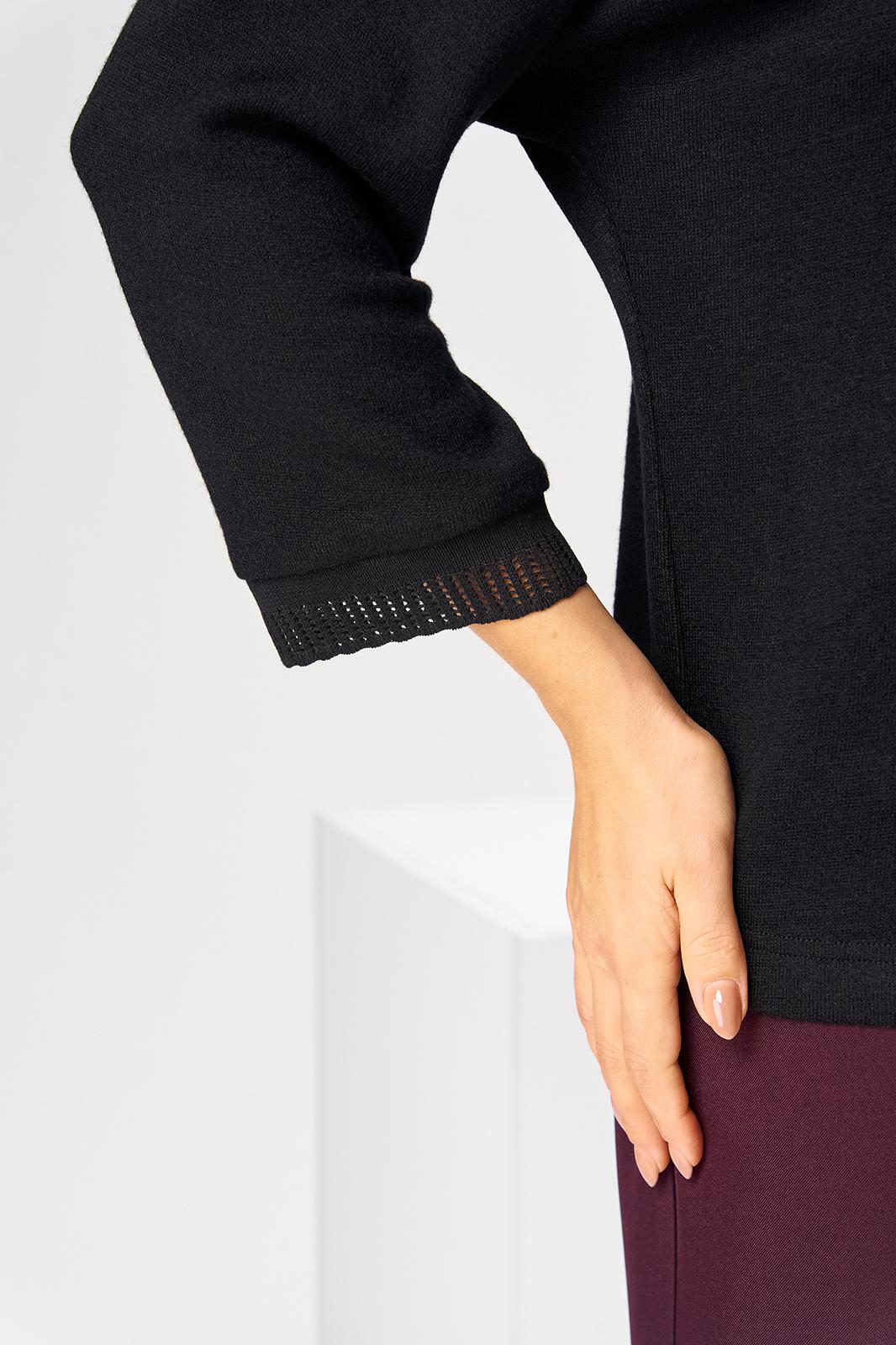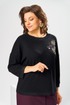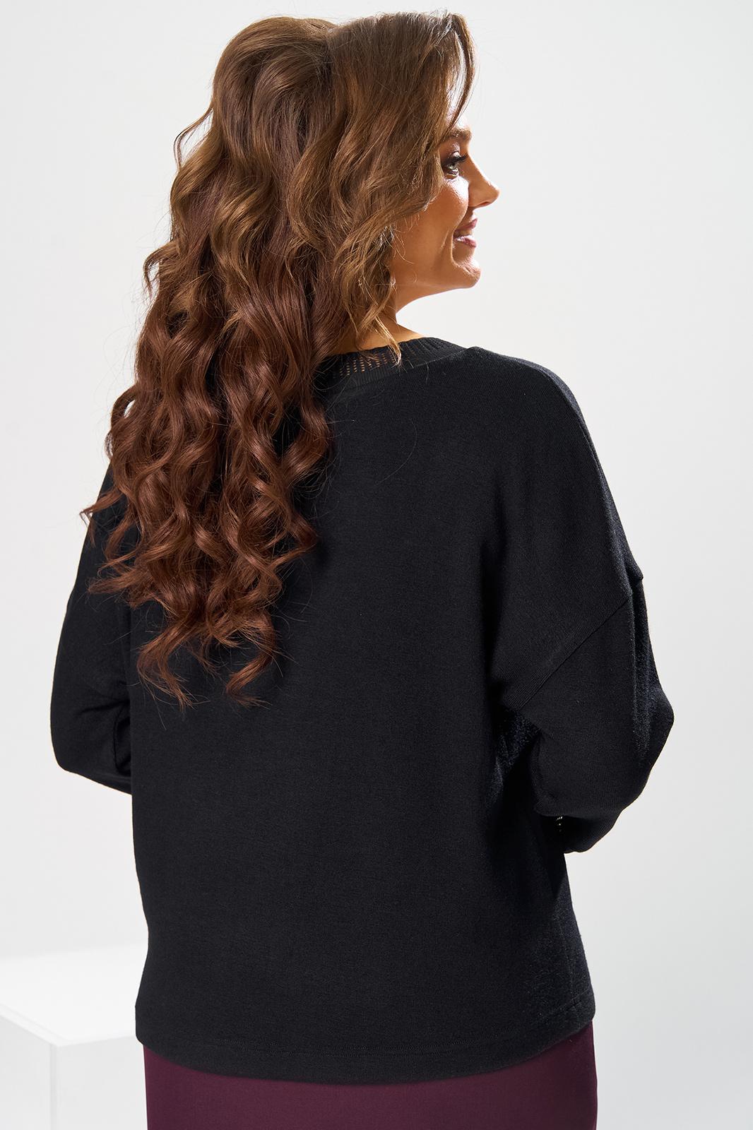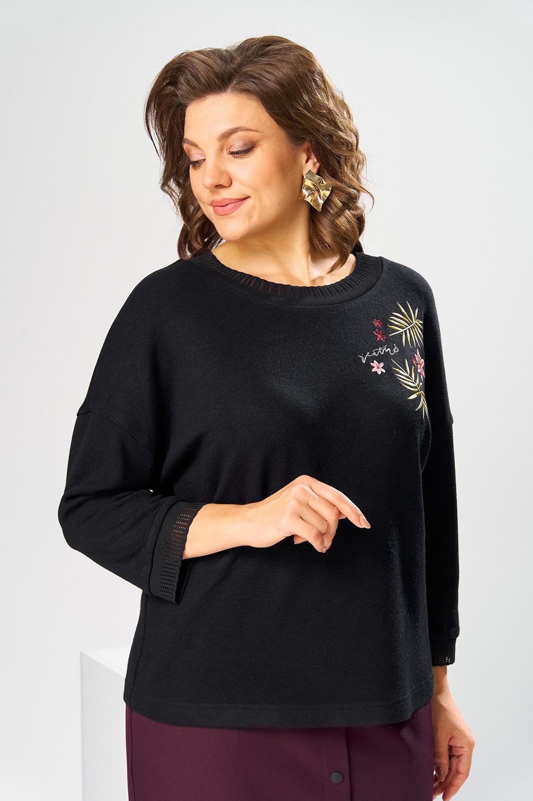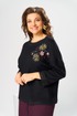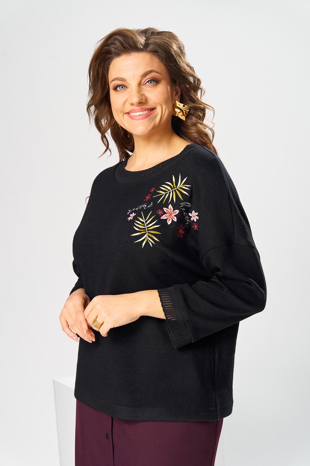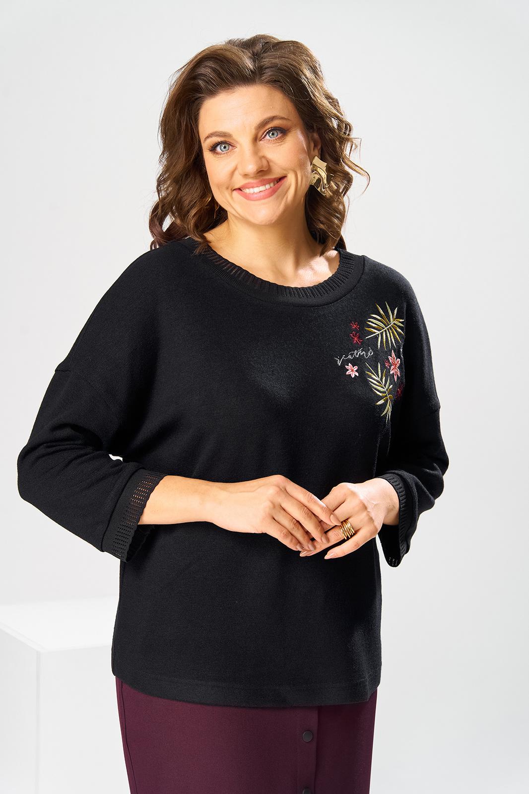 Костюм женский двух предметный: джемпер и юбка предназначен для повседневной носки. Джемпер прямого силуэта, длиной до линии бедер. Перед цельнокроеный, декорирован худ. Вышивкой. Спинка цельнокроеная. Горловина круглая, с втачной фигурной планкой из отделочной ткани. Джемпер со спущенной проймой. Рукав втачной, одно шовный, длиной 7/8. Юбка прямая, длиной ниже колена. Переднее полотнище с двумя боковыми фигурными карманами. Заднее полотнище с двумя таллиевыми вытачками. Застежка спереди на 8 металлических кнопок. Верхний срез с притачным поясом, с 4 надстрочными шлевками, между карманами и вытачками заднего полотнища пояс собран на эластичную тесьму. Юбка на подкладке. Длина джемпера 53см, длина рукава от горловины 58см. Длина юбки 68см