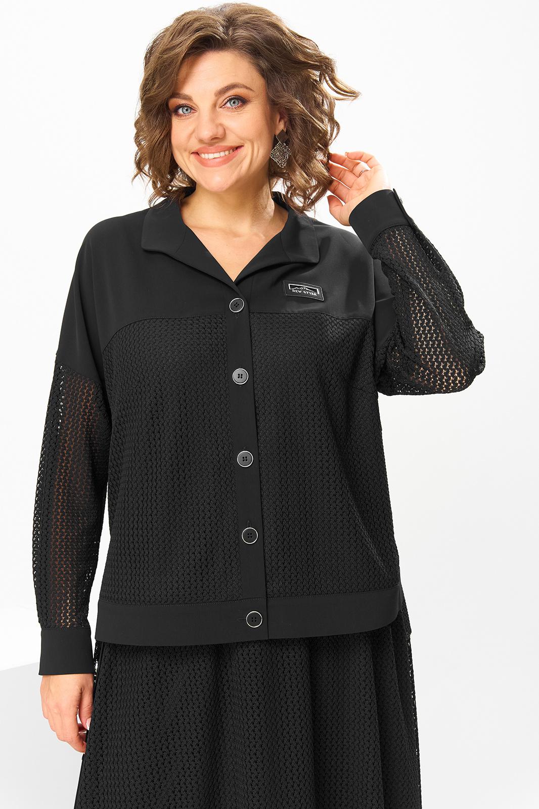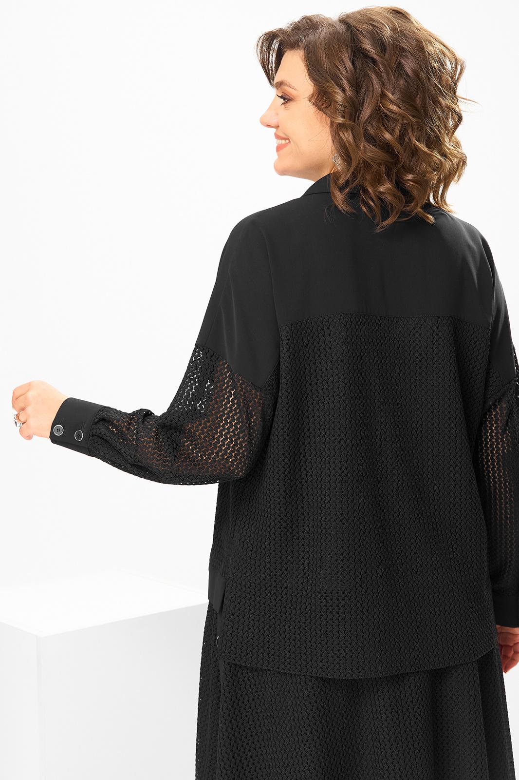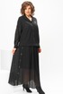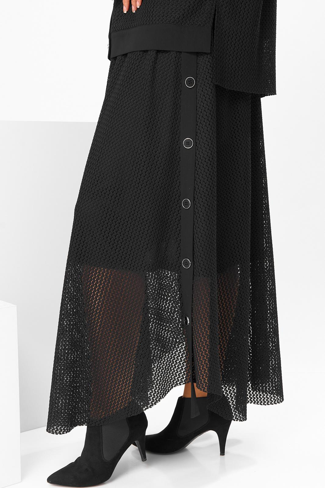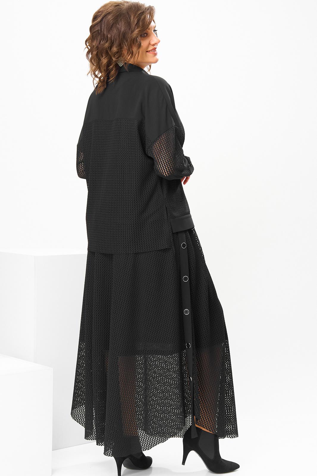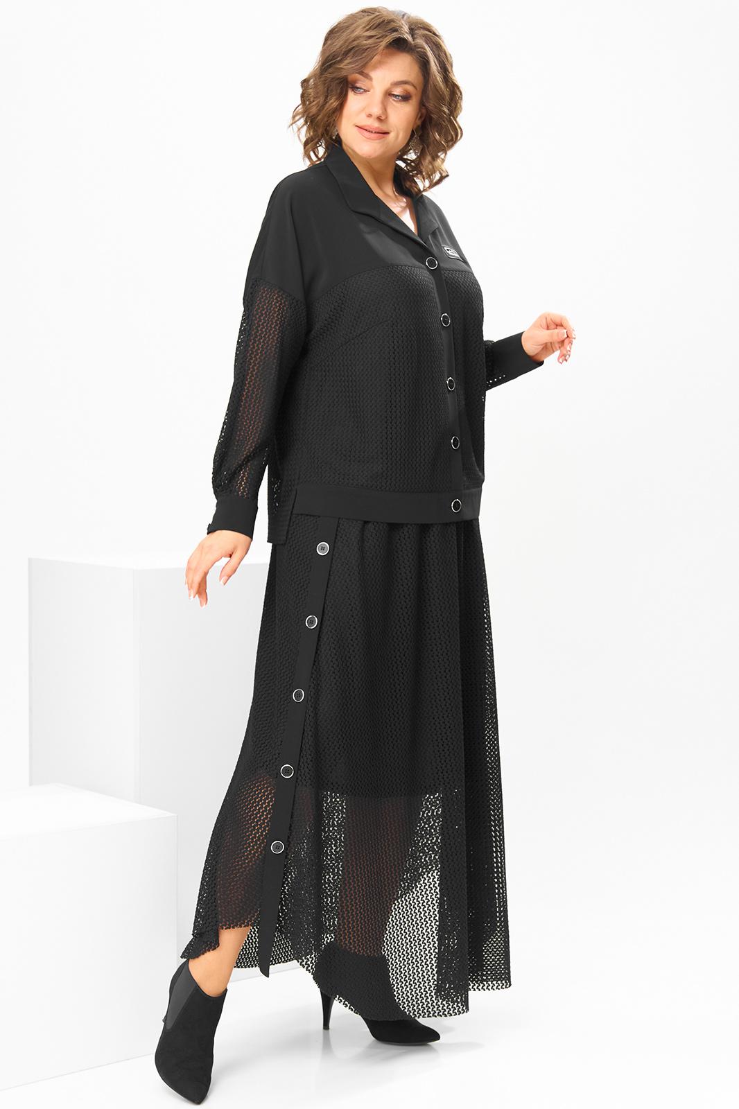 Костюм женский, предназначен для повседневной носки. Костюм женский, 2-х предметный жакет и юбка. Жакет прямого силуэта, длиной до линии бёдер с фигурным низом ступенька. Перед с отрезными кокетками, с 2-мя нагрудными вытачками, с 2-мя притачными вертикальными планками, с 2-мя притачными горизонтальными планками внизу. На левой части кокетки настрочная аппликация. Спинка с отрезной кокеткой. Центральная часть переда и спинки на подкладке. Горловина круглая с втачным воротником, с закруглёнными концами. Застёжка центральная, бортовая, на вертикальных планках, на 5-ть обмётанных петель и 5-ть пришивных пуговиц. Жакет со спущенным плечом. Рукав втачной, длинный одно шовный на 2-е обмётанные петли и 2-е пришивные пуговицы. Жакет без плечевых накладок. Юбка женская, расширенная к низу, длинная с фигурным низом. Боковые швы с отлётными вертикальными планками, зафиксированными на юбке на 5-ть пришивных пуговиц на каждом боковом шве. Юбка с притачным поясом, собранным на эластичную тесьму, закреплённую 2-мя отделочными строчками. Юбка на подкладке. Длина спинки жакета 67 см, ширина рукава под проймой 21 см. Длина юбки по боковому шву без пояса 67 см.