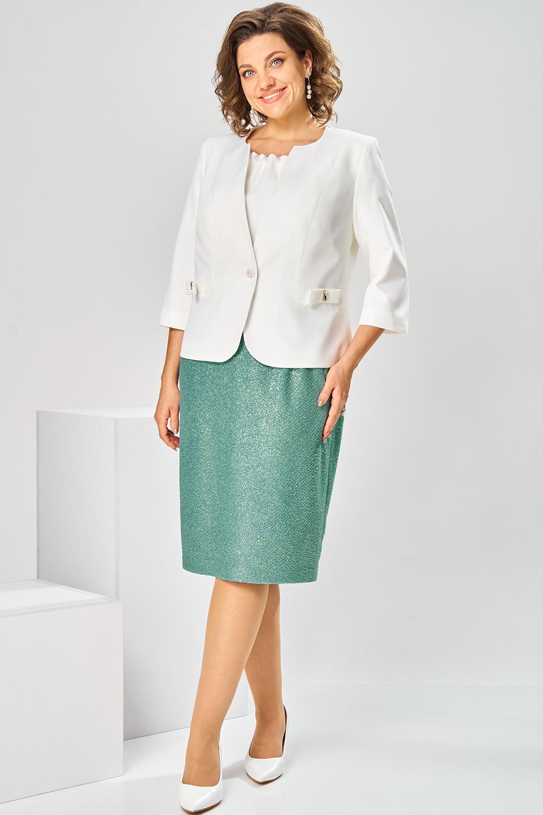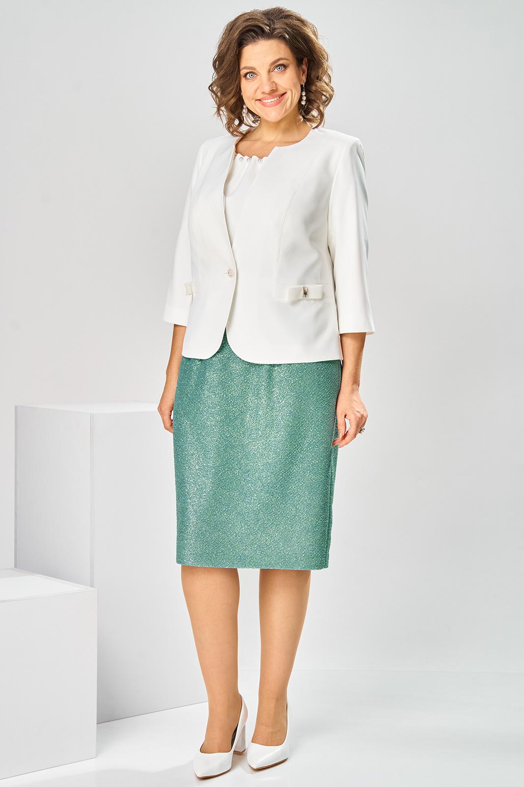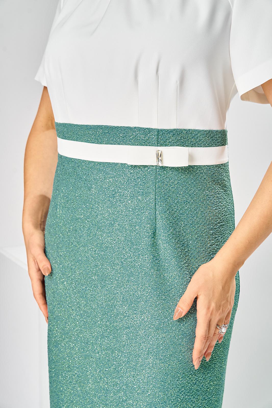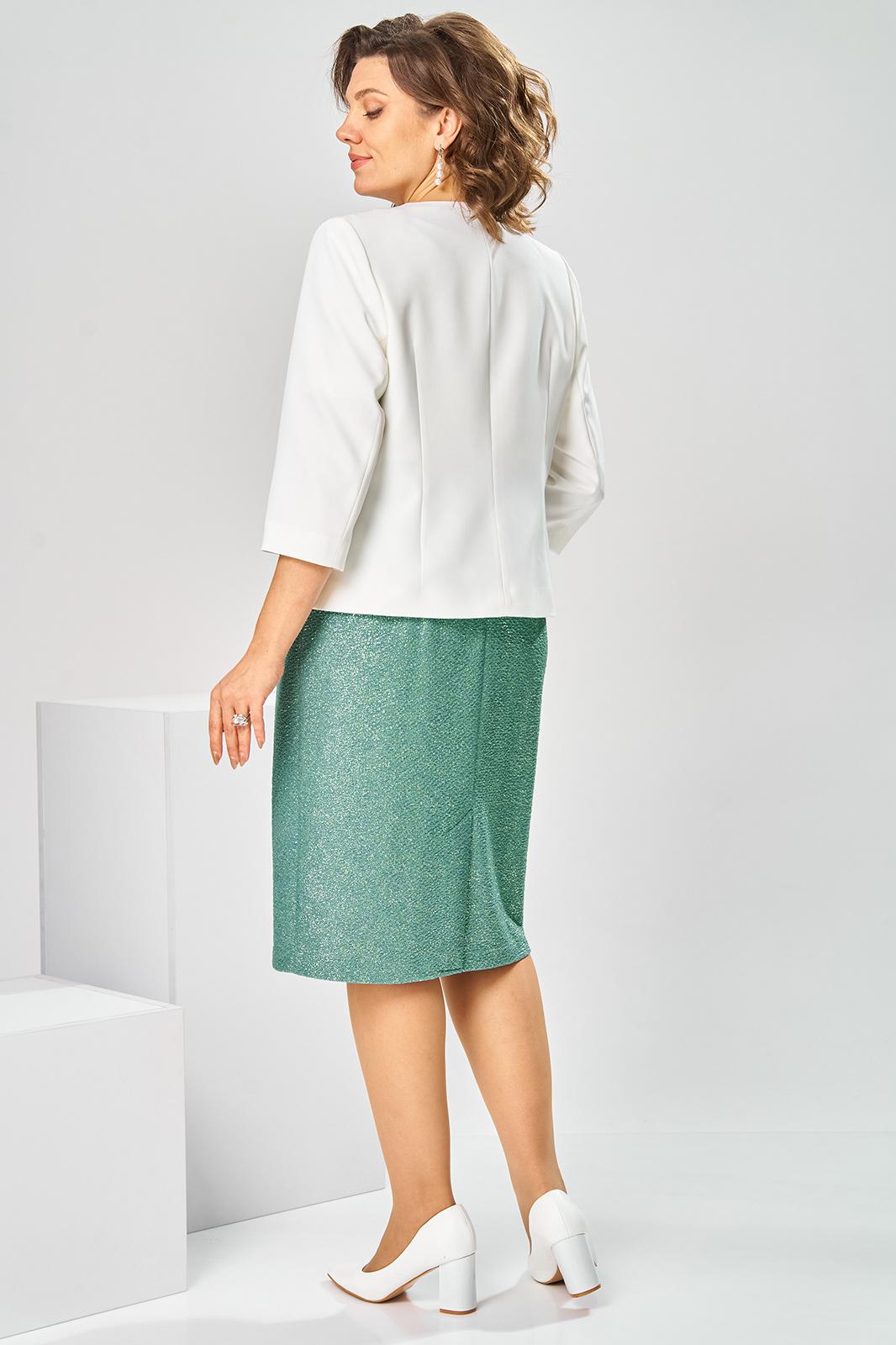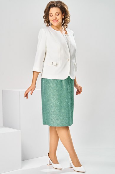 Костюм женский относится к нарядной торжественной одежде. Костюм женский, 2-х предметный жакет и платье. Жакет полу прилегающего силуэта, длиной до линии бёдер. Перед с 2-мя рельефами, выходящими из плечевых швов и до горизонтального надреза, шов притачивания рельефа, декорирован листочкой с бантом, закреплённым пришивной стразой. Спинка со средним швом и 2-мя таллиевыми вытачками. Горловина с фигурным вырезом, низ жакета с закруглёнными концами. Горловина обточная, без воротника. Застёжка центральная бортовая на 1-ну обмётанную петлю и 1-ну пришивную пуговицу. Рукав втачной , 2-х шовный, длиной 3/4. Жакет на притачной подкладке. Жакет с плечевыми накладками. Платье женское полу прилегающего силуэта, длиной за колено, обрезное выше линии талии. Верхняя часть переда с 2-мя отрезными кокетками, с 6-ю таллиевыми вытачками, нижняя часть переда из отделочной ткани, с 2-мя таллиевыми вытачками с надстрочным поясом, декорированным пришивным бантом со стразой. Спинка со средним швом, заканчивающимся шлицей и 2-мя таллиевыми вытачками. Нижняя часть спинки из отделочной ткани. Горловина круглая, обточная без воротника, перед декорирован 8-ю пришивными бусинами, формирующими воздушные складки. Застёжка на потайную тесьму молнию в среднем шве спинки. Рукав втачной, короткий, одно шовный. Платье на подкладке. Платье без плечевых накладок.