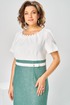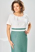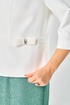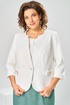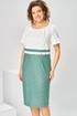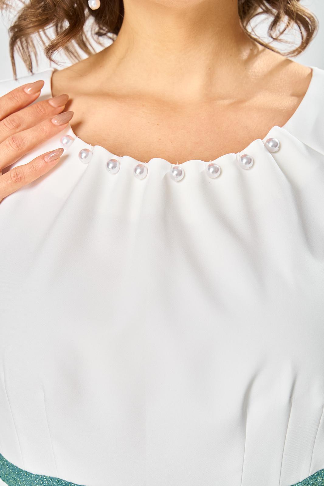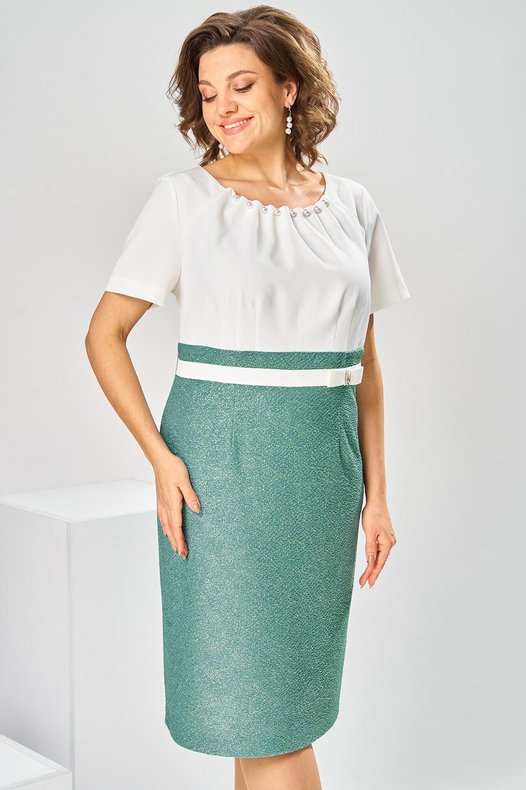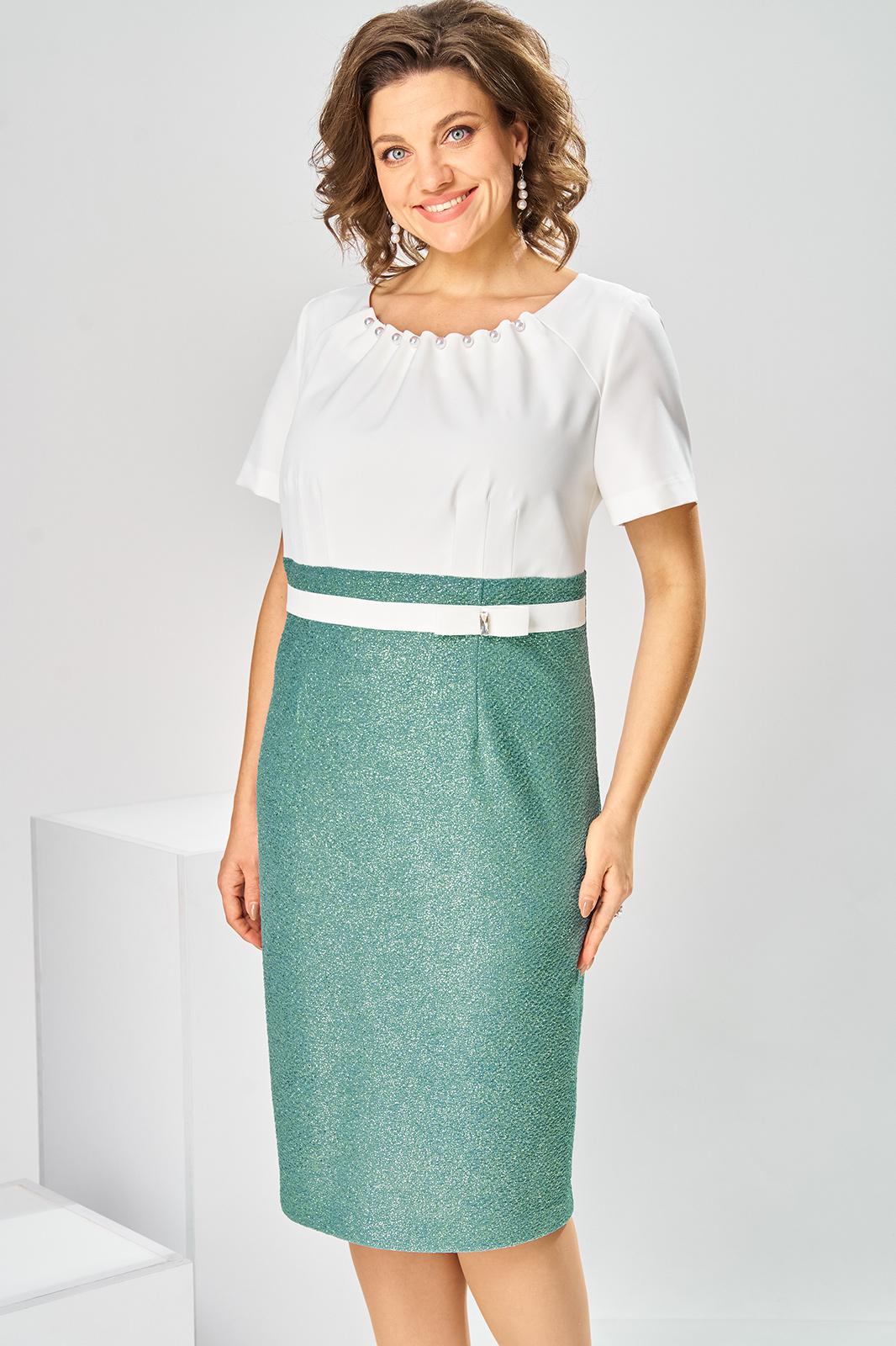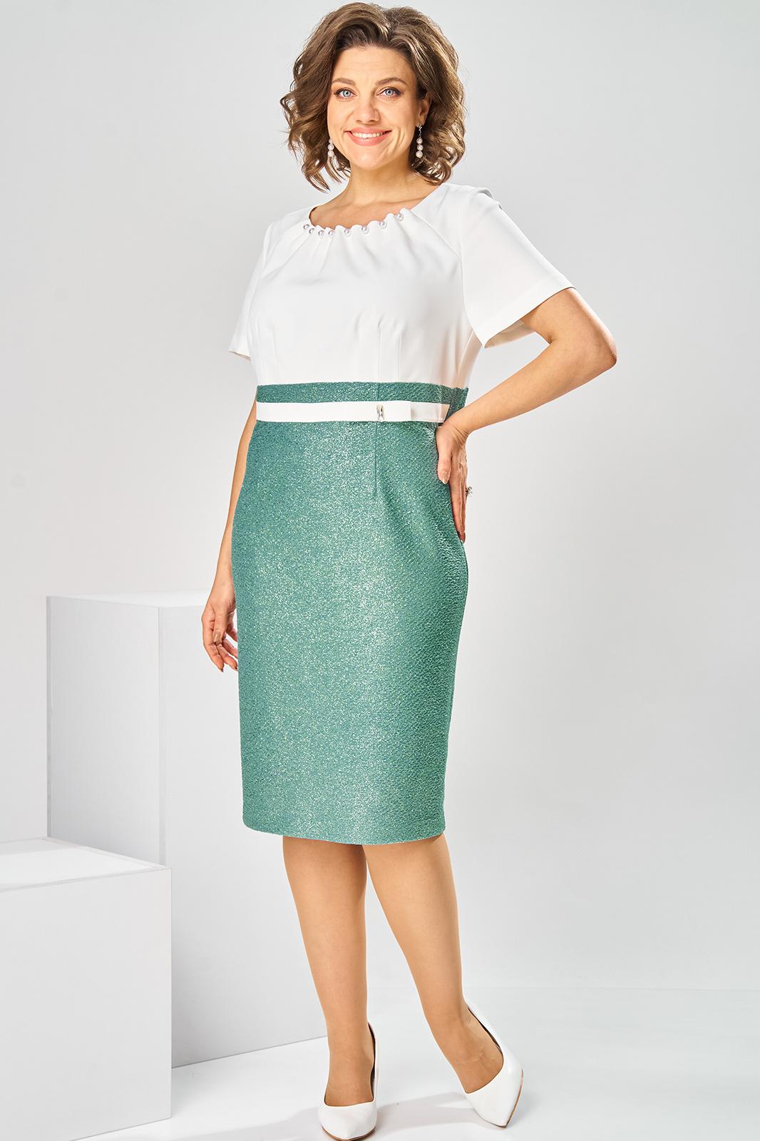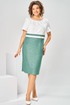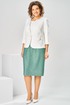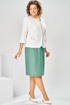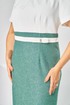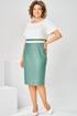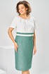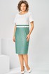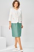 Костюм женский относится к нарядной торжественной одежде. Костюм женский, 2-х предметный жакет и платье. Жакет полу прилегающего силуэта, длиной до линии бёдер. Перед с 2-мя рельефами, выходящими из плечевых швов и до горизонтального надреза, шов притачивания рельефа, декорирован листочкой с бантом, закреплённым пришивной стразой. Спинка со средним швом и 2-мя таллиевыми вытачками. Горловина с фигурным вырезом, низ жакета с закруглёнными концами. Горловина обточная, без воротника. Застёжка центральная бортовая на 1-ну обмётанную петлю и 1-ну пришивную пуговицу. Рукав втачной , 2-х шовный, длиной 3/4. Жакет на притачной подкладке. Жакет с плечевыми накладками. Платье женское полу прилегающего силуэта, длиной за колено, обрезное выше линии талии. Верхняя часть переда с 2-мя отрезными кокетками, с 6-ю таллиевыми вытачками, нижняя часть переда из отделочной ткани, с 2-мя таллиевыми вытачками с надстрочным поясом, декорированным пришивным бантом со стразой. Спинка со средним швом, заканчивающимся шлицей и 2-мя таллиевыми вытачками. Нижняя часть спинки из отделочной ткани. Горловина круглая, обточная без воротника, перед декорирован 8-ю пришивными бусинами, формирующими воздушные складки. Застёжка на потайную тесьму молнию в среднем шве спинки. Рукав втачной, короткий, одно шовный. Платье на подкладке. Платье без плечевых накладок.