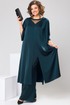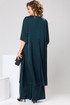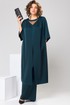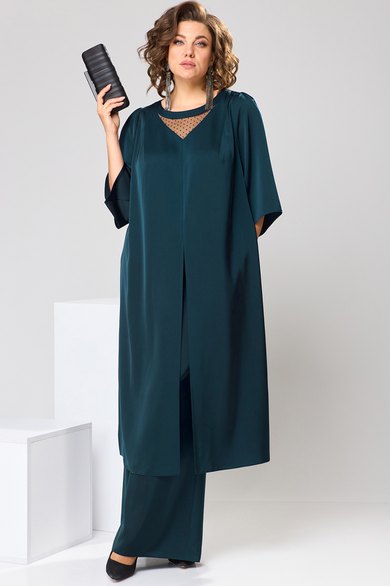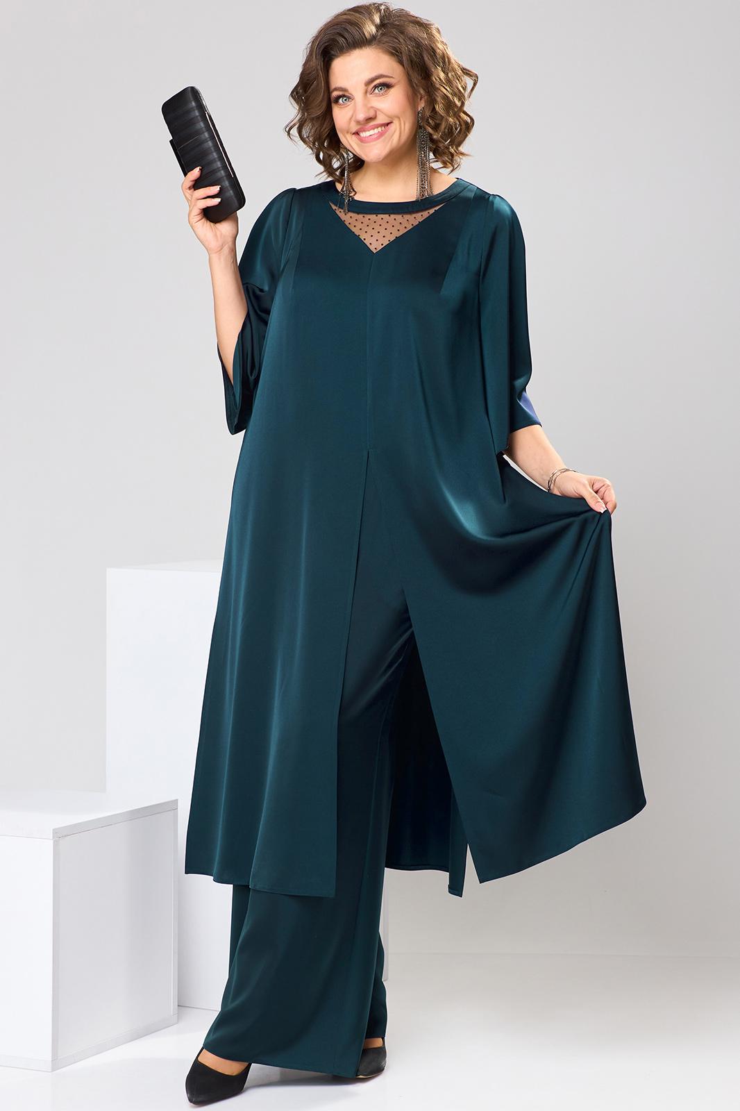 Комплект женский, относится к торжественной одежде. Комплект женский 2-х предметный туника и брюки. Туника женская, прямого силуэта, длиной до середины икры. Перед с 2-мя нагрудными вытачками, выходящими из плечевых швов, со средним швом, заканчивающимся разрезом, с отрезной планкой по горловине, с V-образной вставкой из отделочной ткани. Спинка со средним швом, заканчивающимся разрезом. Боковые швы с разрезами. Горловина круглая, обточная без воротника. Рукав втачной, одно шовной длиной 3/4 с фигурным низом и встречной складкой по центру оката. Туника без плечевых накладок. Брюки женские прямые, длинные. Передние половинки с карманами в боковых швах. Задние половинки с таллиевыми вытачками. Брюки с притачным поясом, собранным на эластичную тесьму, закреплённую 2-мя отделочными строчками. Длина спинки туники 119см, длина рукава 41 см. Длина брюк по боковому срезу 103 см.