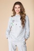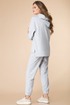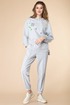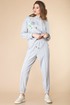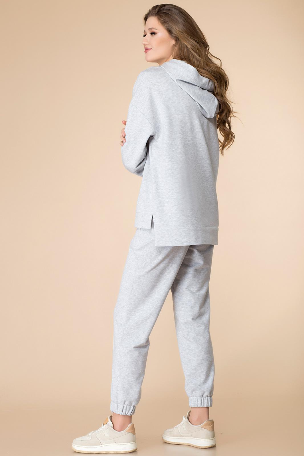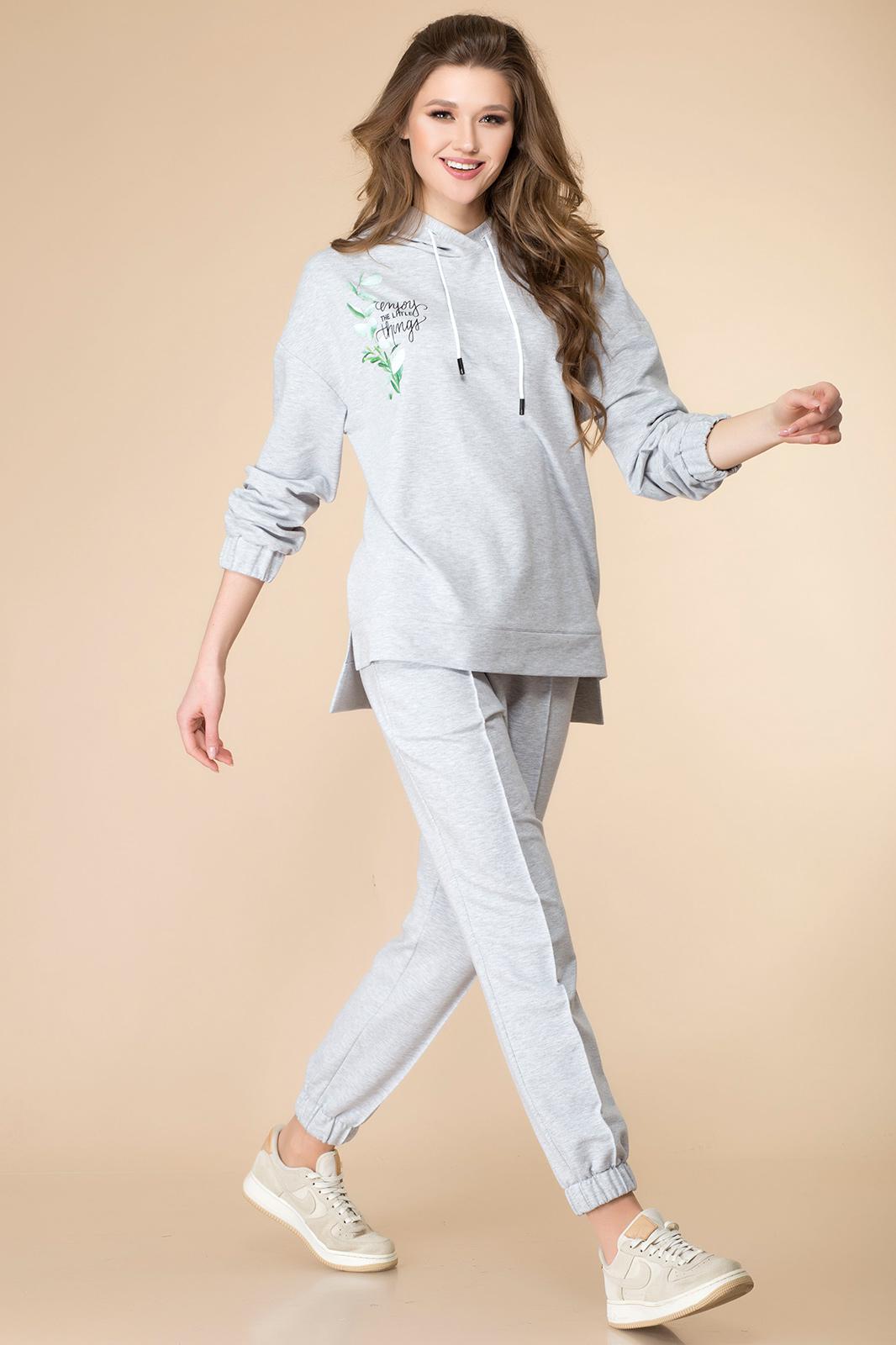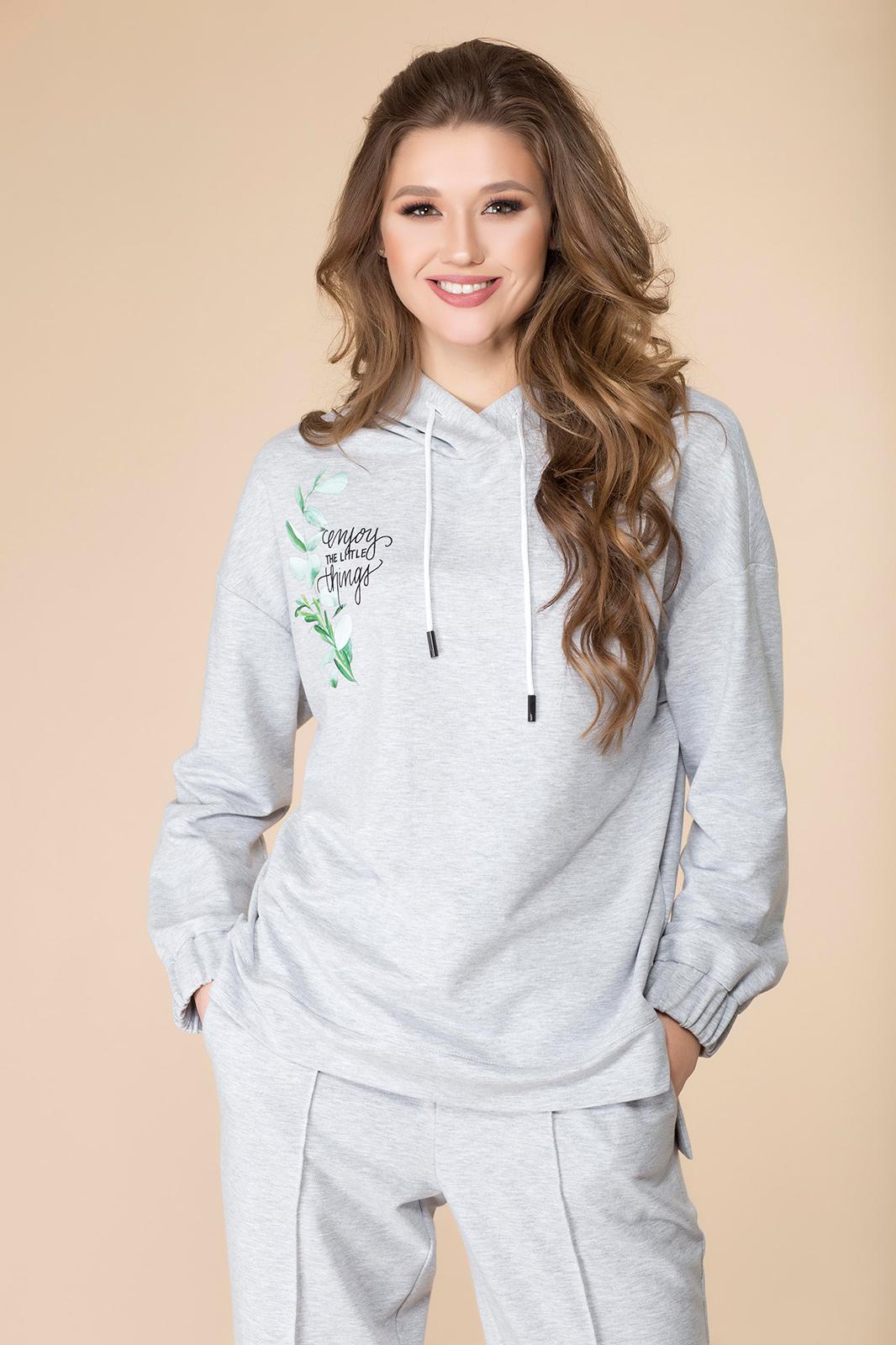 Костюм женский спортивный предназначен для повседневной носки. Костюм женский прямого силуэта, длиной ниже линии бедер на 10см, с фигурным низом(ступенька). Перед и спинка цельнокроенная. Низ переда с притачной планкой и декорирован термоаппликацией. Боковые швы с разрезами. Горловина круглая с втачным капюшоном капюшоном, по отлету капюшона кулиса с втянутым декоративным шнурком. Джемпер со спущенным плечом. Рукав втачной, длинный, одно шовный с притачной манжетой, собранной на эластичную тесьму. Брюки женские, слегка заужены к низу, длиной 7/8. Передние половинки с декоративными защипами, ширина защиа 0,2см, с наклонными карманами в боковых швах. Задние половинки цельнокроенные. Верхний срез с притачным поясом, собранным на эластичную тесьму. Длина спинки 69см. Длина рукава от горловины 70см. Длина брюк 94см