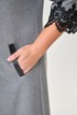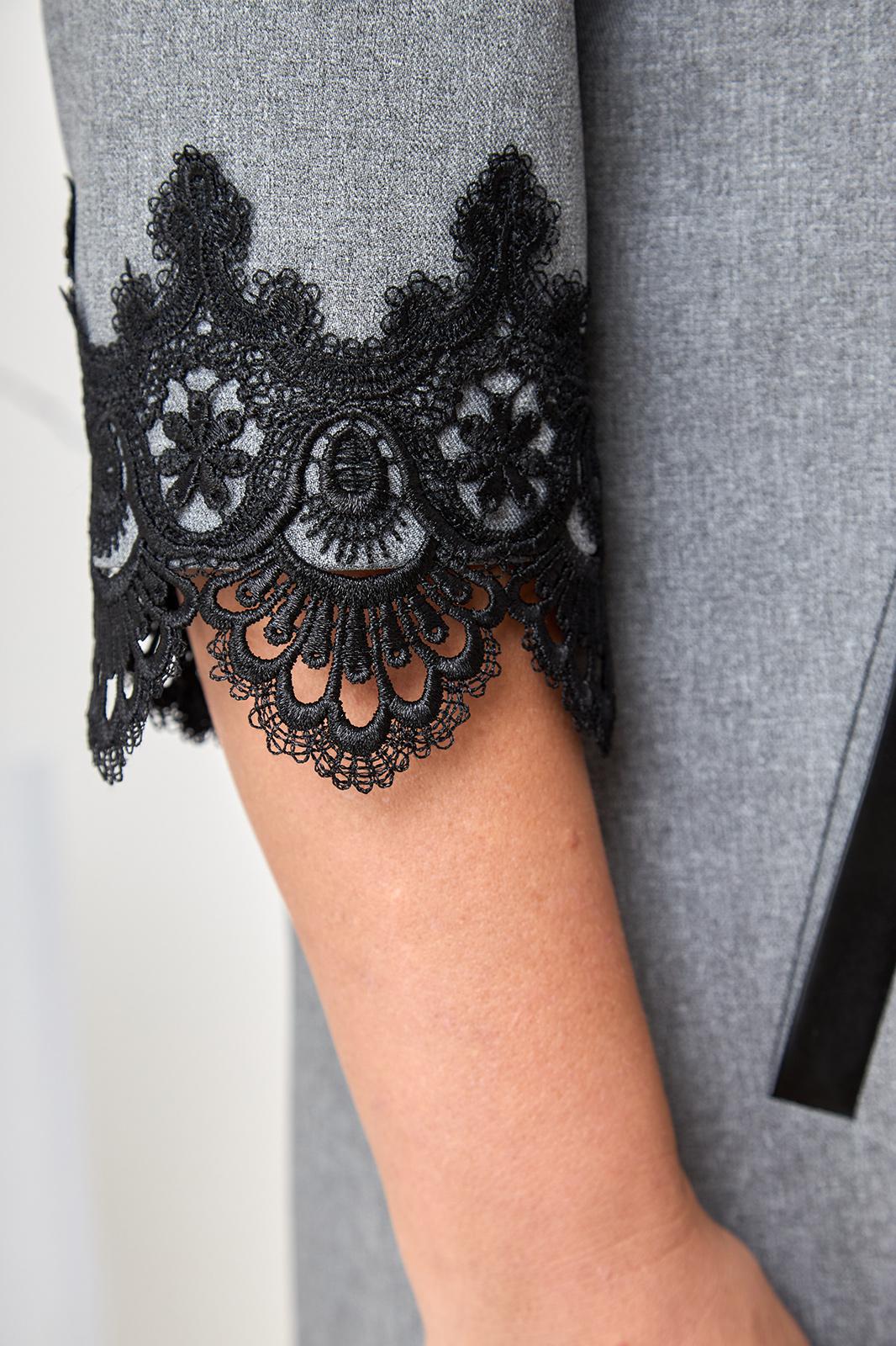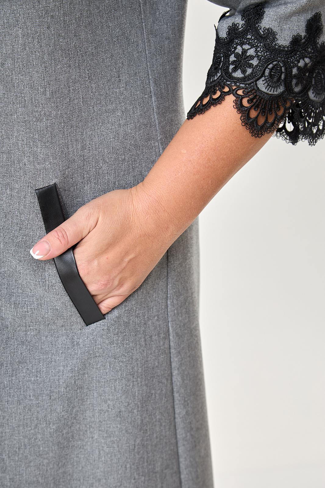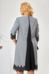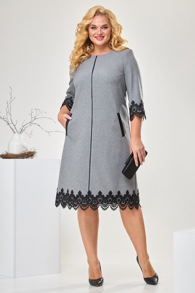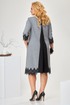 Платье женское ”А” силуэта относится к коктейльным платьям, длиной за колено. Перед с двумя нагрудными вытачками, со средним швом, с двумя прорезными карманами вертикальными с листочками с втачными концами. Срезы среднего шва спинки окантованы. Вверху среднего шва разрез, на котором зафиксированы три декоративных пуговицы. Верхняя пуговица застегивается на навесную петлю. Рукав двух шовный, длиной ¾. Горловина обтачная, без воротника, круглая. Низ платья и рукава декорируются тесьмой отделочной. Платье с плечевыми накладками. Длина спинки 97 см. Длина рукава р-р 54-41 см, р-р 56 - 43 см, р-р 58 -45 см