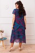 Платье женское А-силуэта, длинное, предназначено для повседневной носки. Перед цельнокроеный двумя нагрудными вытачками. Спинка цельнокроеная. Рукав короткий, одношовный. Горловина без воротника, круглая, обтачная. Платье на подкладке. Перед платья декорируется пришивным украшением из ткани, в центре которого одна страза. Длина спинки 110 см. Длина рукава 16.5 см