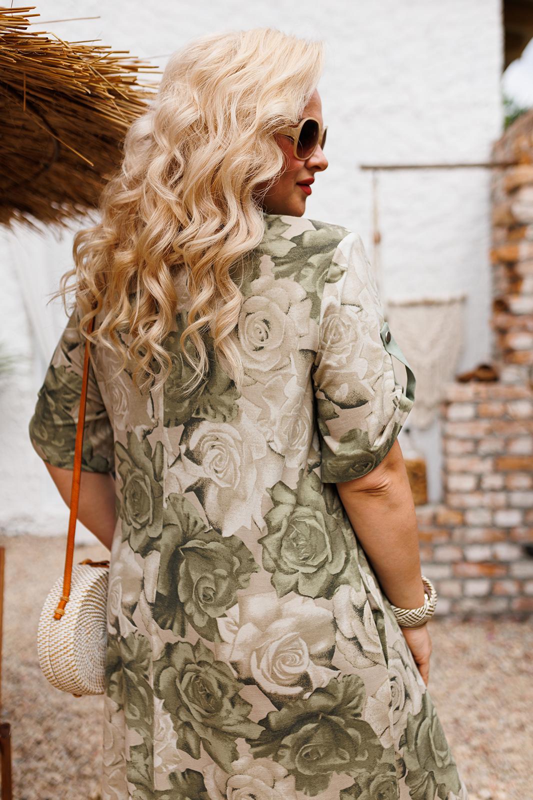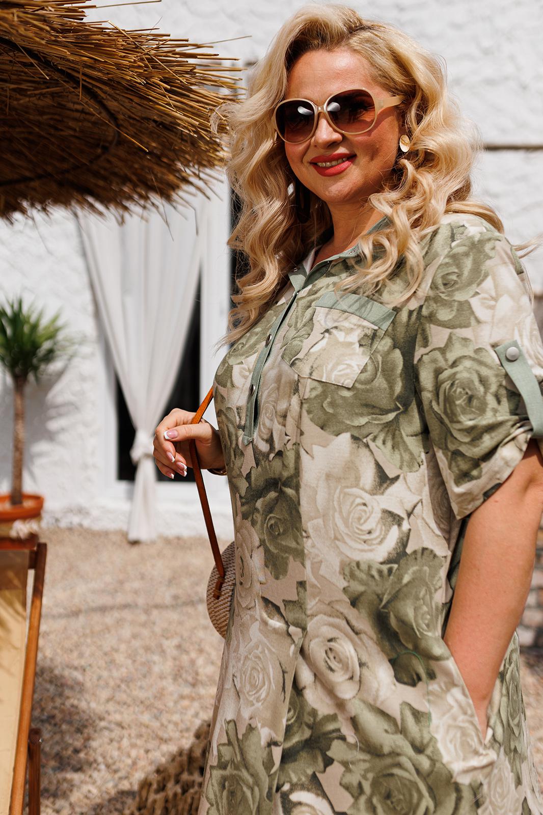 Платье женское предназначено для повседневной носки. Платье женское прямого силуэта, длиной до середины икры. Перед с двумя рельефами, выходящими из плечевых швов, проходящими через центр груди, на уровне линии бедер переходящие в односторонние складки. Перед с одним нагрудным фигурным карманом, с обтачкой из отделочной ткани, с двумя вертикальными планками из отделочной ткани. Спинка со средним швом. В боковых швах обработаны карманы. Боковые швы с закругленными обтачными разрезами. Горловина круглая, с втачным воротником рубашечного типа, с отрезной стойкой из отделочной ткани. Рукав втачной, одно шовный, длиной до локтя с патой из отделочной ткани, фиксирующей длину рукава на одну пробивную металлическую кнопку. Застежка центральная на пять пробивных металлических кнопок. Платье с плечевыми накладками. Длина рукава 34 см. Длина спинки 114 см.