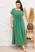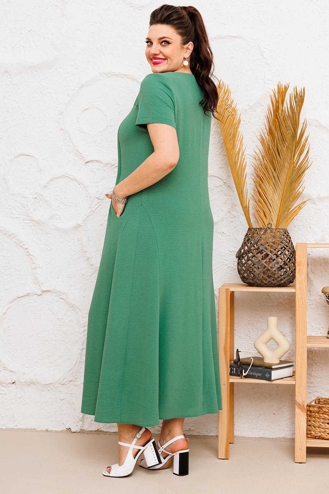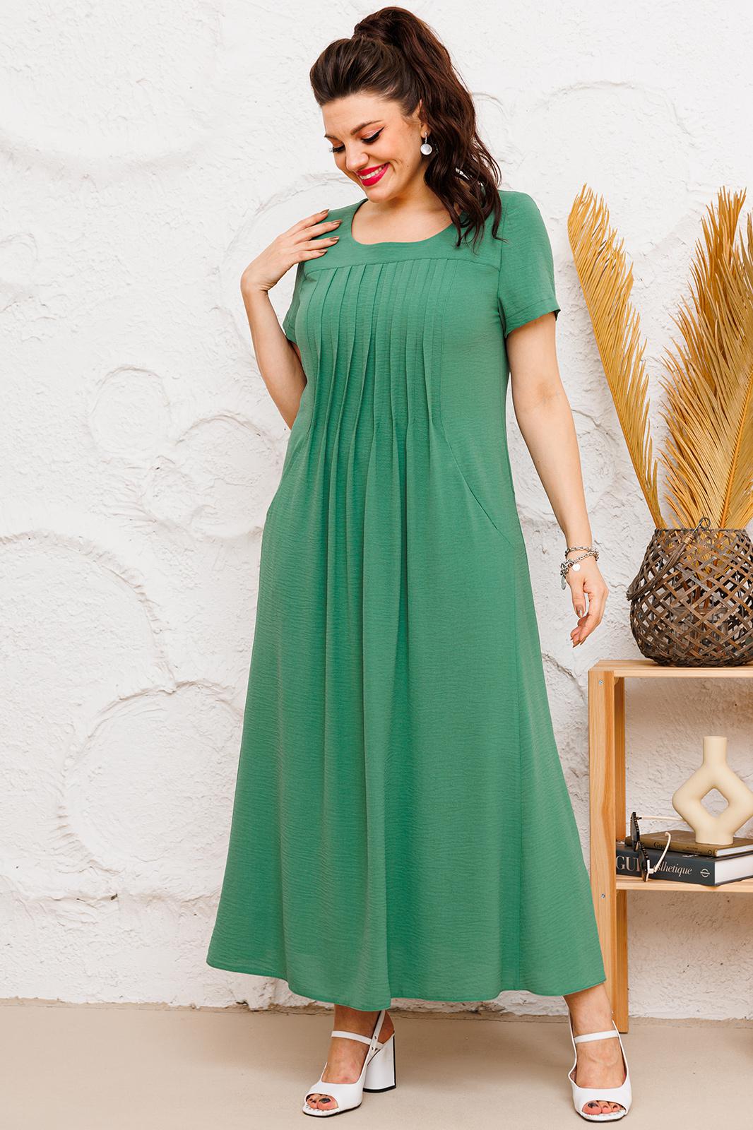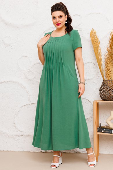 Платье женское предназначено для повседневной носки. Платье женское расширенное к низу, длинное. Перед с отрезной кокеткой, с двумя отрезными бочками, с двумя конструктивными подрезами внизу. Центральная часть переда с 8-ю декоративными складками. В швах соединения бочков с центральной частью переда обработаны карманы. Спинка со средним швом, с двумя декоративными конструктивными подрезами внизу от боковых швов. Горловина круглая, обтачная, без воротника. Рукав втачной, короткий, одно шовный. Ширина складки переда 1,5 см. Платье с плечевыми накладками. Длина спинки 133 см. Длина рукава 22 см