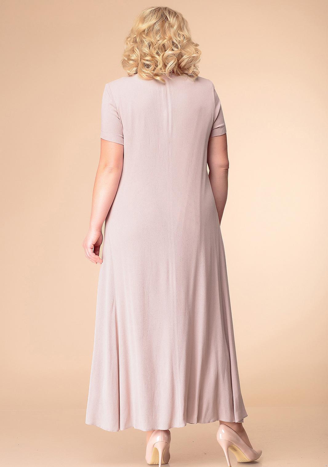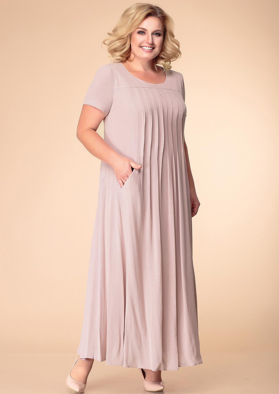 Платье женское предназначено для повседневной носки. Платье женское расширенное к низу, длинное. Перед с отрезной кокеткой, с двумя отрезными бочками, с двумя конструктивными подрезами внизу. Центральная часть переда с 8-ю декоративными складками. В швах соединения бочков с центральной частью переда обработаны карманы. Спинка со средним швом, с двумя декоративными конструктивными подрезами внизу от боковых швов. Горловина круглая, обтачная, без воротника. Рукав втачной, короткий, одношовный. Ширина складки переда 1,5см. Платье с плечевыми накладками. Длина спинки 133см. Длина рукава 22см.