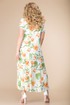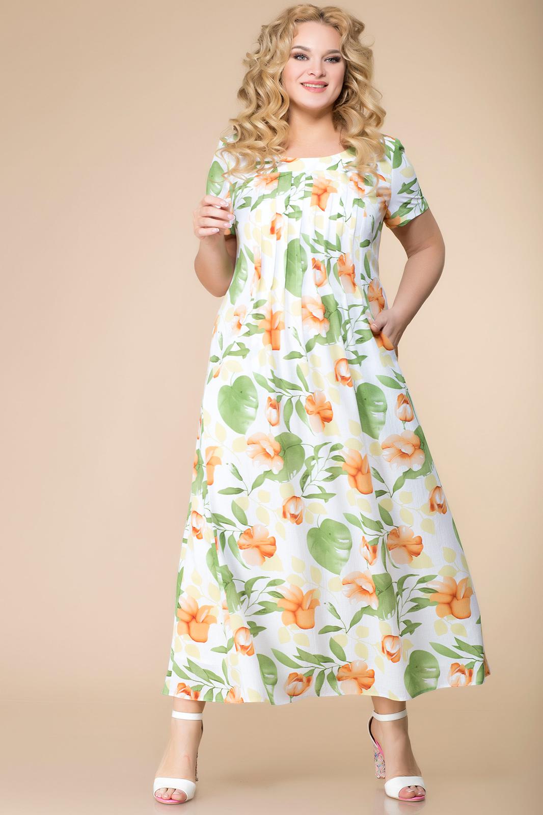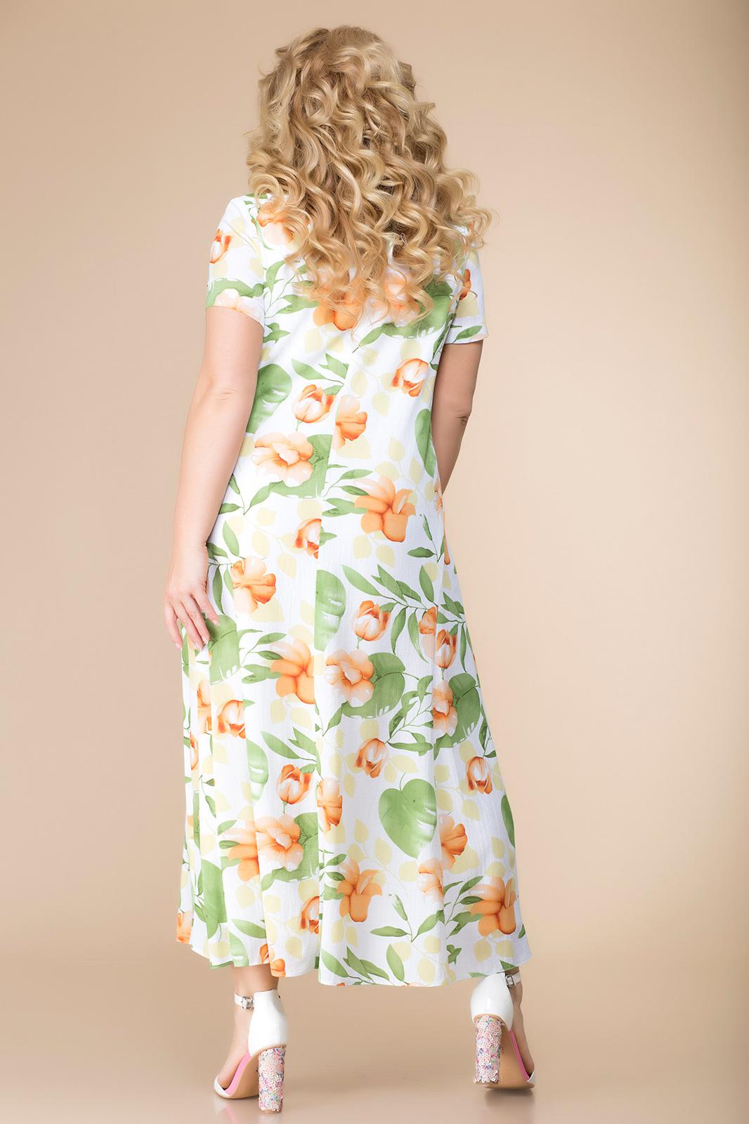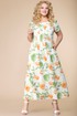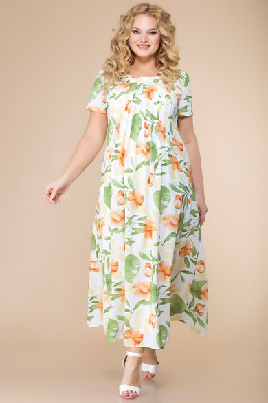 Платье женское предназначено для повседневной носки. Платье женское расширенное к низу, длинное. Перед с отрезной кокеткой, с двумя отрезными бочками, с двумя конструктивными подрезами внизу. Центральная часть переда с 8-ю декоративными складками. В швах соединения бочков с центральной частью переда обработаны карманы. Спинка со средним швом, с двумя декоративными конструктивными подрезами внизу от боковых швов. Горловина круглая, обтачная, без воротника. Рукав втачной, короткий, одно шовный. Ширина складки переда 1,5 см. Платье с плечевыми накладками. Длина спинки 133 см. Длина рукава 22 см